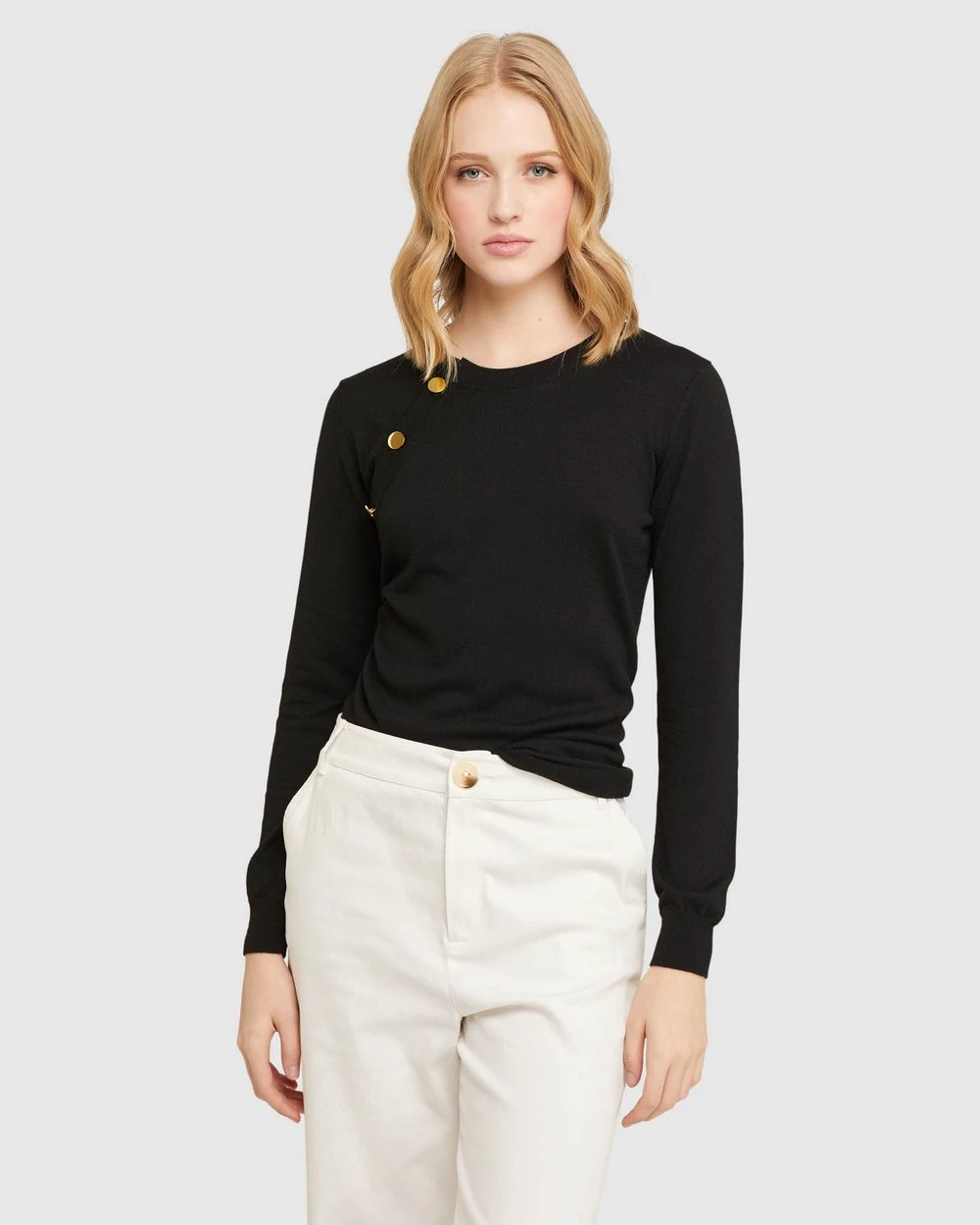 A subtle and chic style, the Evie Button Detail Knit by Oxford is a super soft knit with bold metallic button detail. The perfect choice for the transeasonal months.
