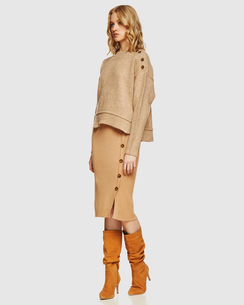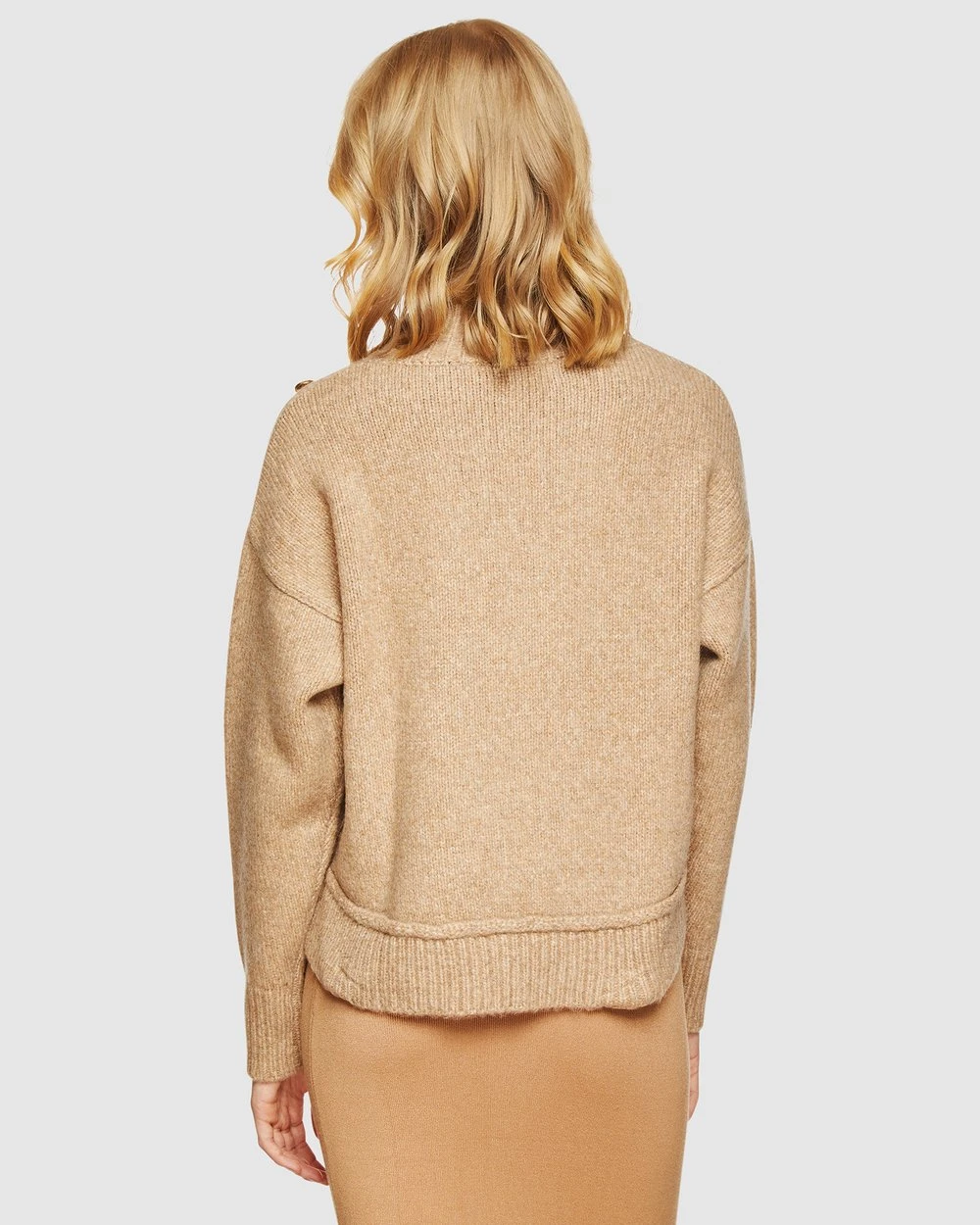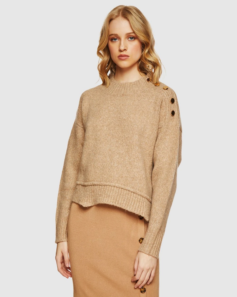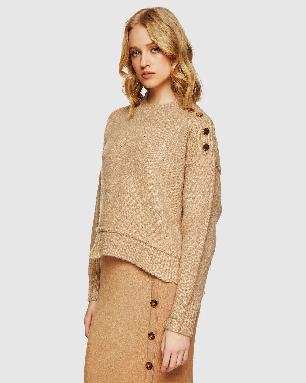 A statement knit for any occasion, the Oxford Fabienne Button Shoulder Knit will elevate your winter style. This relaxed fitting jumper features a smart shoulder button detail with shiny metallic buttons, a high neckline and large ribbed trims. Pair it back with a long skirt and knee-high boots for a look that will take you from work to the weekend.
