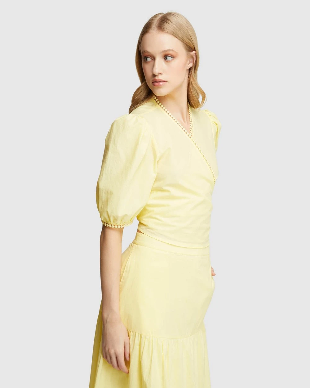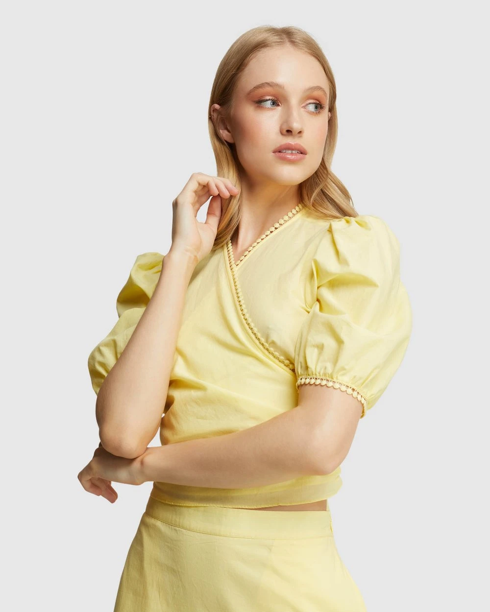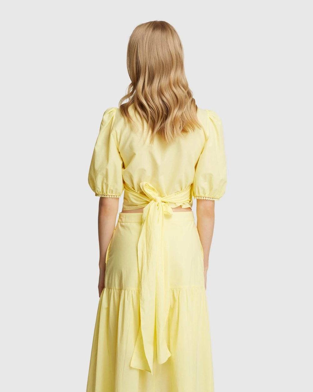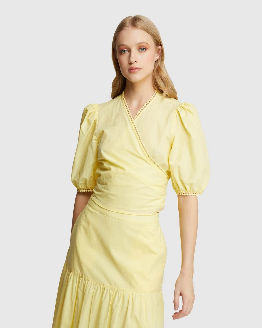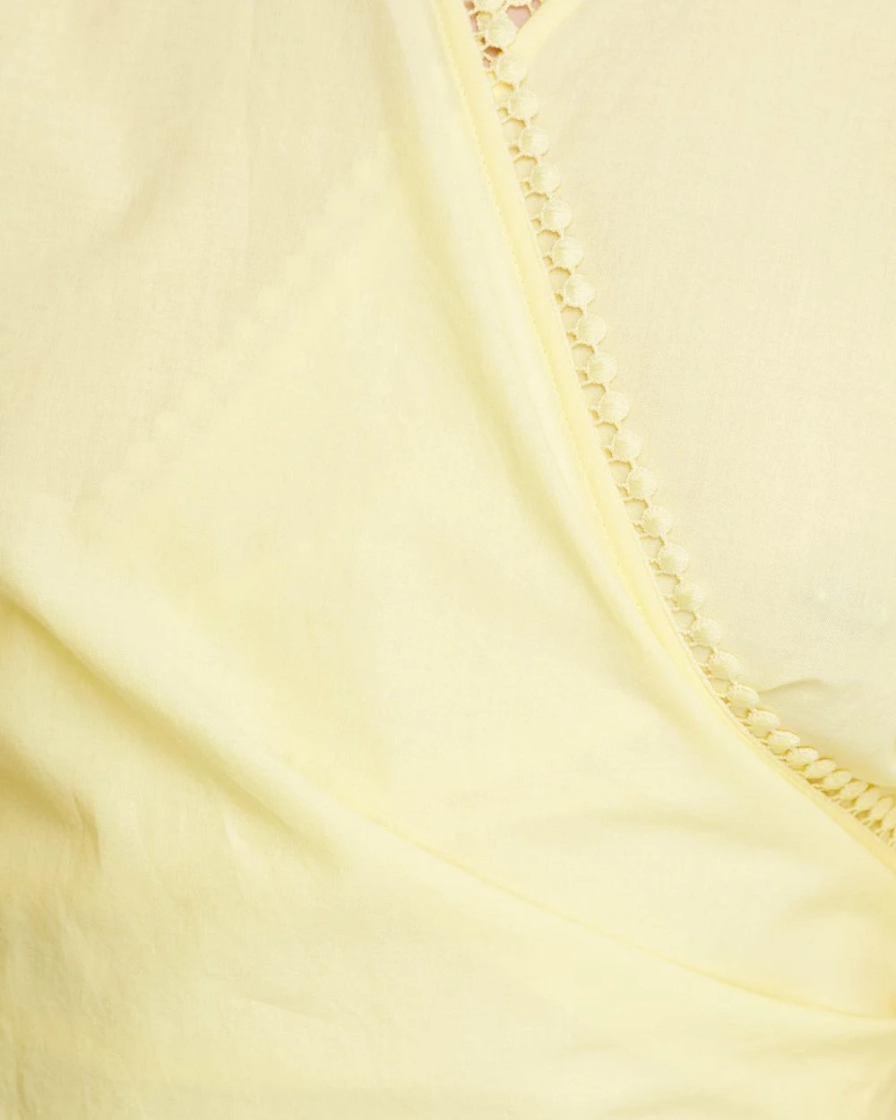 Let your style shine in the Fitzgerald Cotton Wrap Top by Oxford. This elegant top is crafted from 100% cotton in a vibrant lemon-yellow hue. It features a wraparound design with long ties that can be worn at the front or back with trim detail and balloon sleeves.