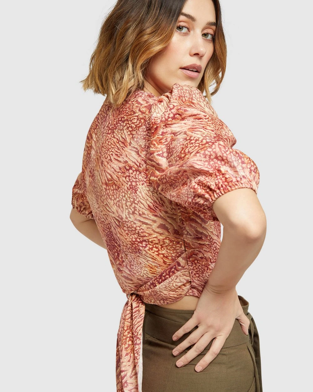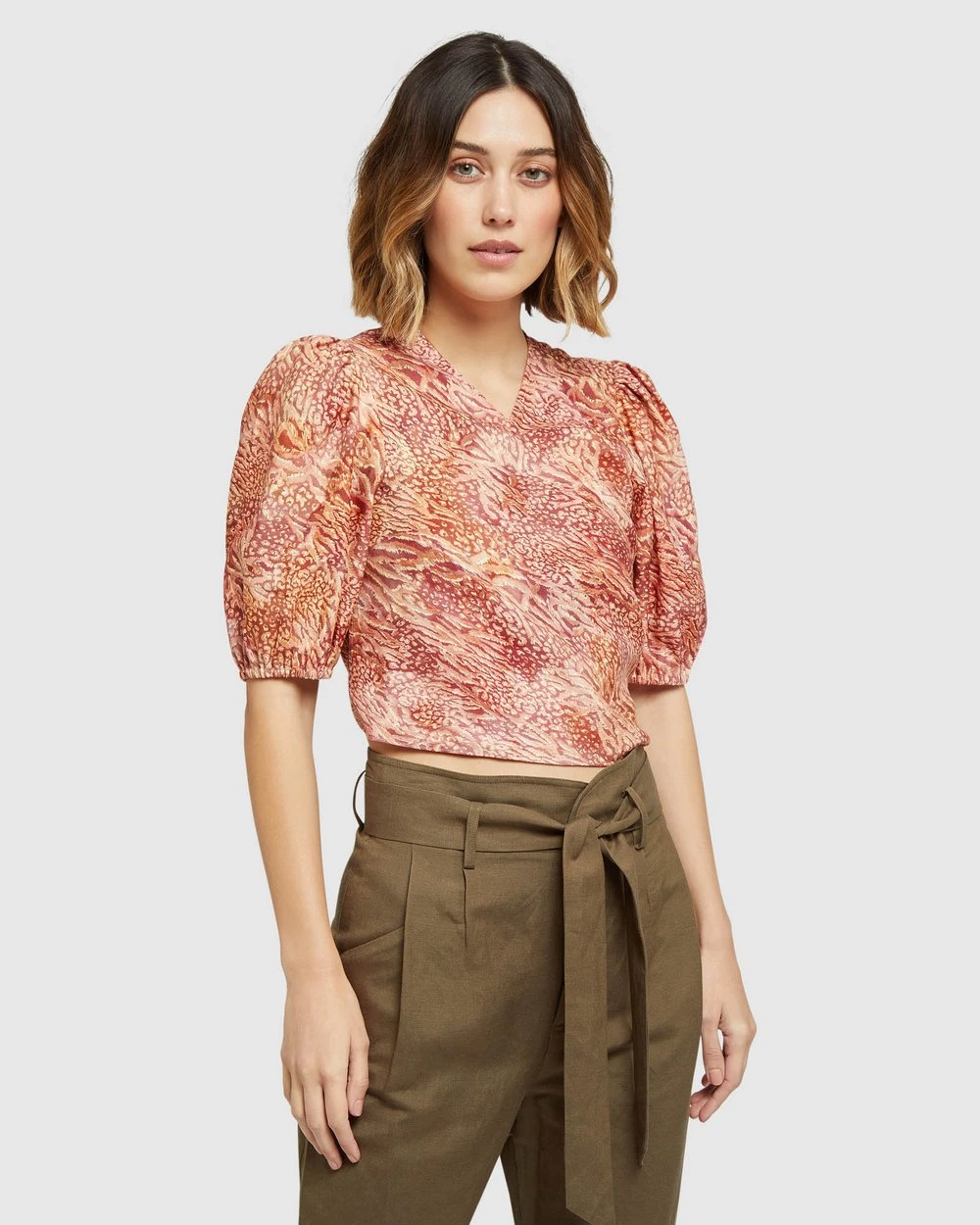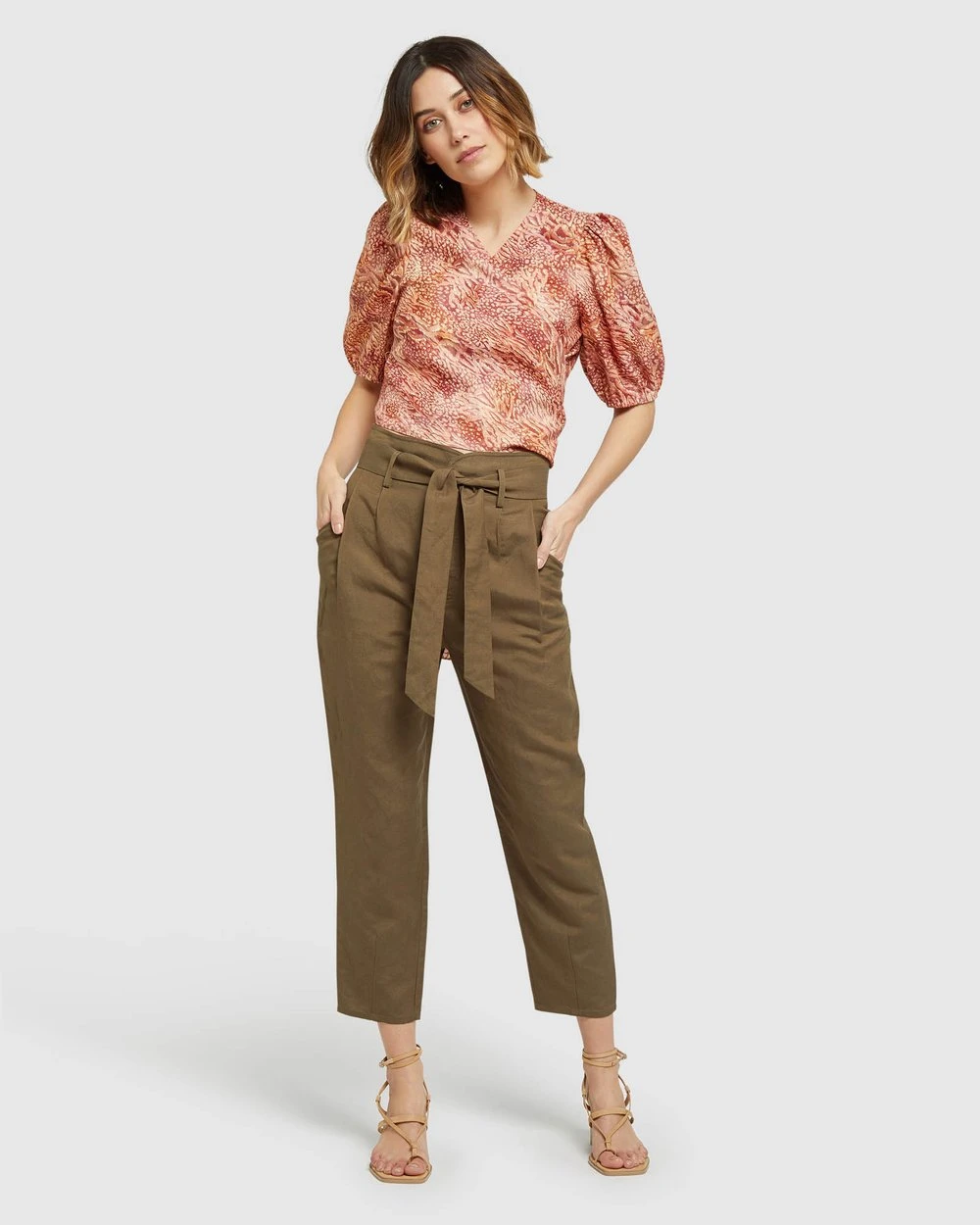 Wrap up your style game with the Oxford Fitzgerald Printed Linen Top, a distinctive look for work or play. Crafted from a soft linen blend this top has a unique wrap around design with tie-up panels that can be worn at the front or back. It features short puff sleeves, a v neckline and tangerine print. Style it with our Ariel Linen Pants to complete the look.