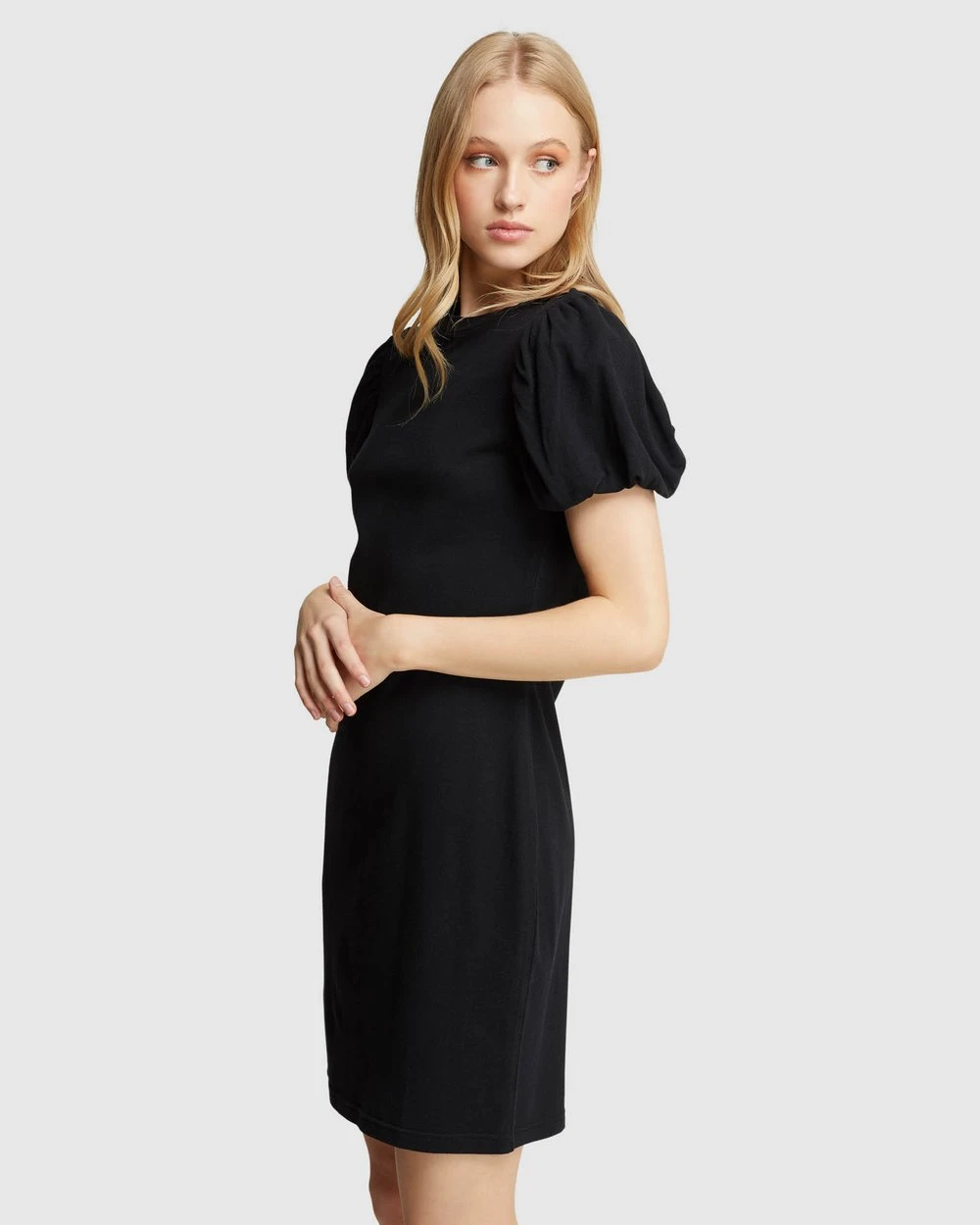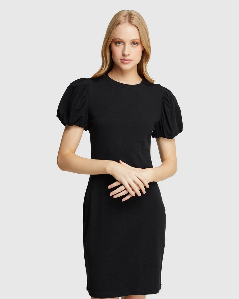 Subtle and sleek, the Florence Knit Mini Dress by Oxford will elevate your look. This subtle style is crafted from a comfy cotton blend and features statement puff sleeves, a round neckline and a fitted waistline.