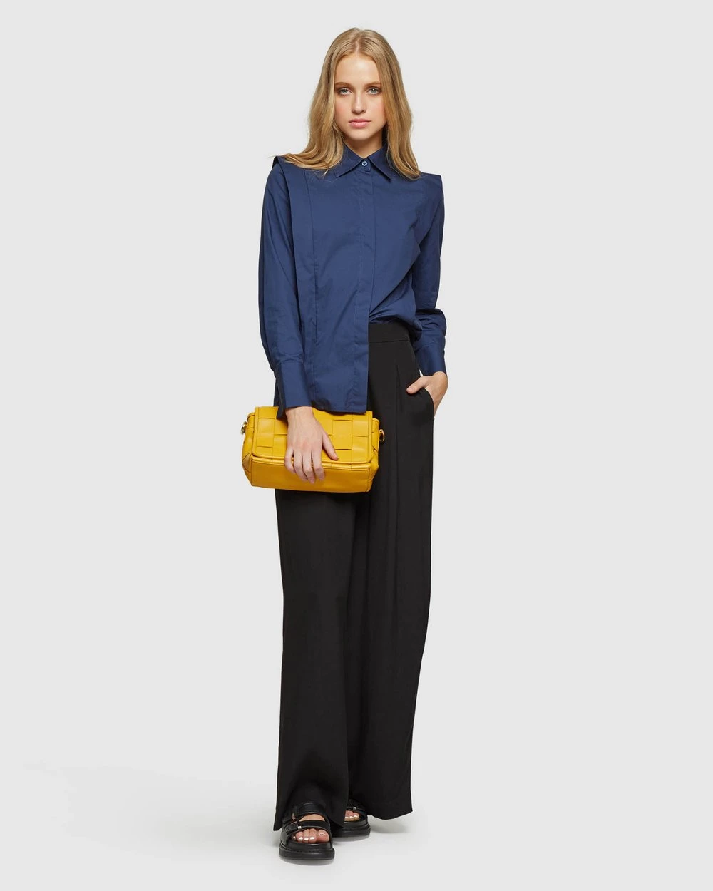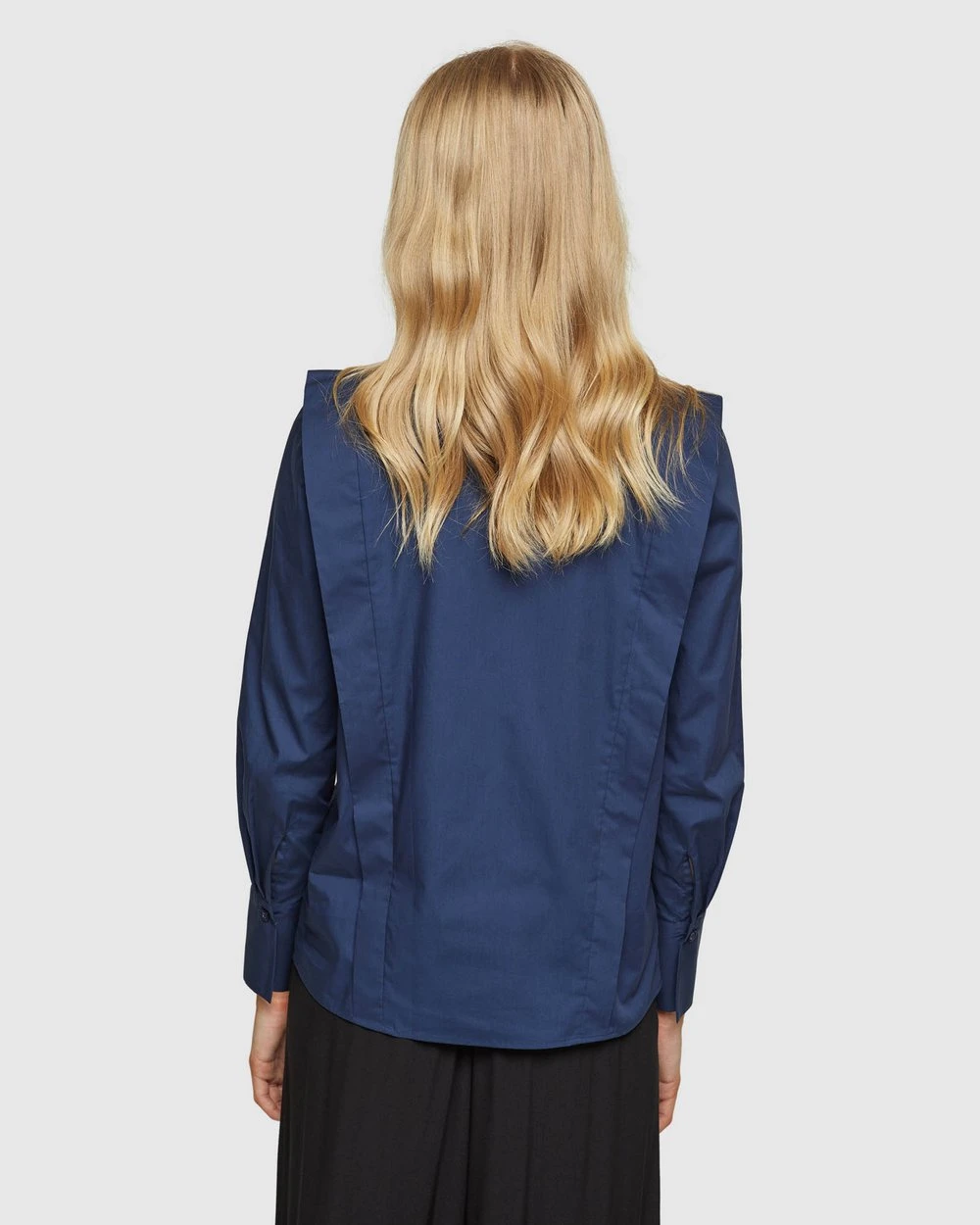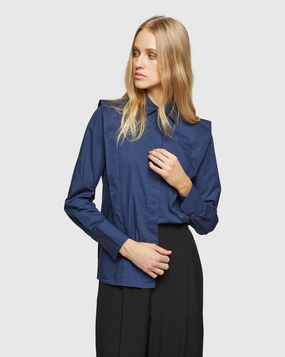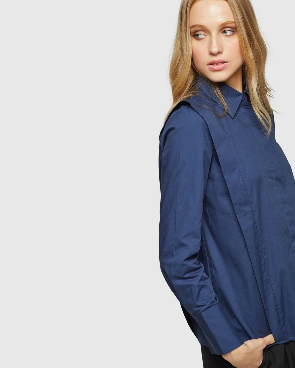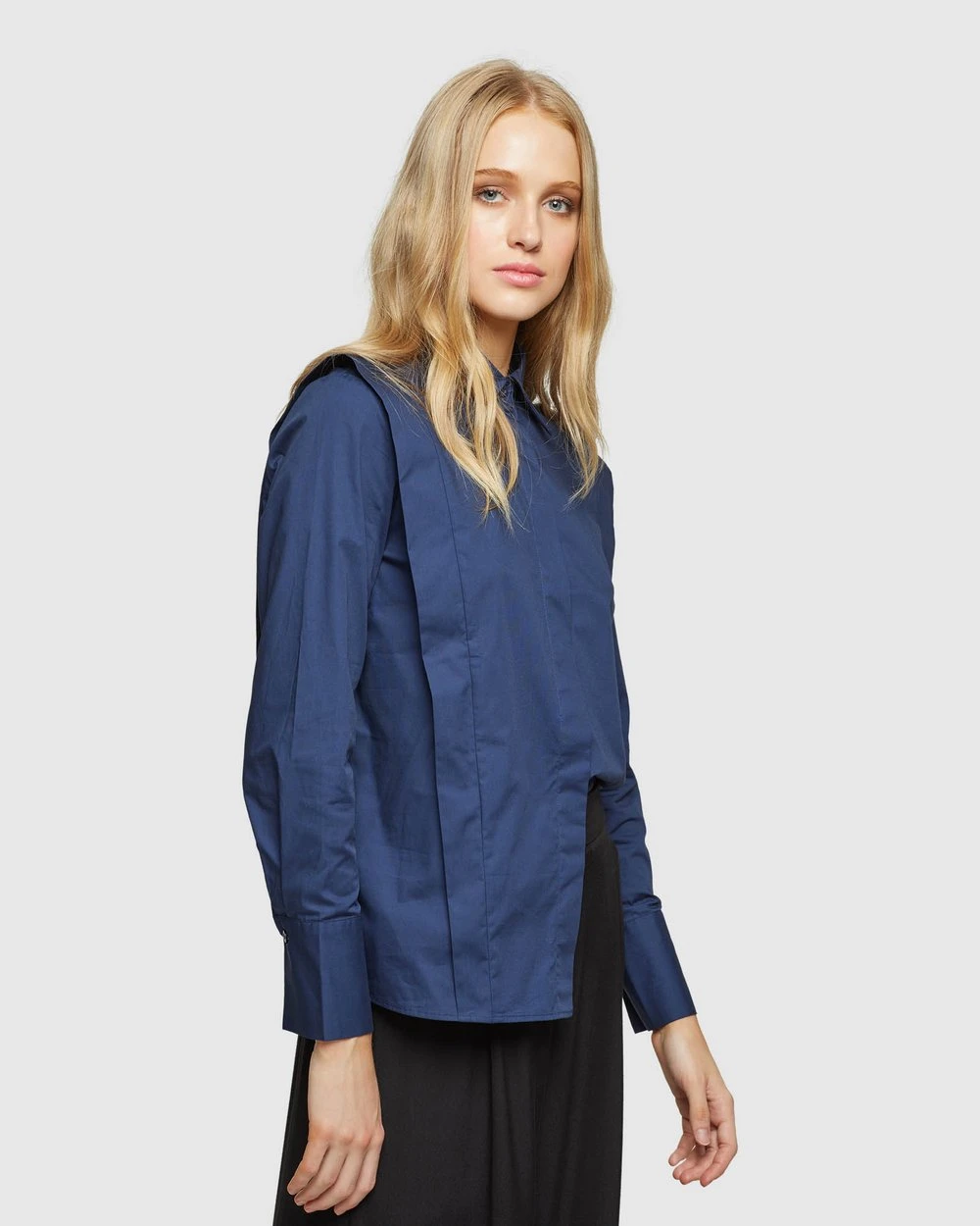 The Frankie Shirt by Oxford is a modern and chic look for work or play. This women’s shirt is crafted from 100% cotton and cut in a slim fit. It features oversized cuffs and a statement piece that runs from the shoulder through the front and back.
