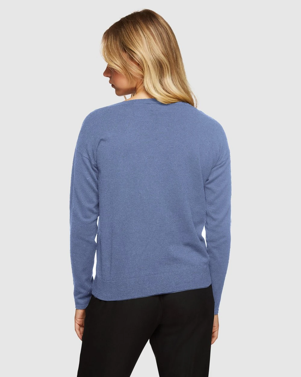 Our model is wearing a size AU 8 knit and usually takes a size 8. She is 175 cm (5’9″) tall with an 86cm (34″) bust, a 61 cm (24″) waist and 89cm (35″) hips.