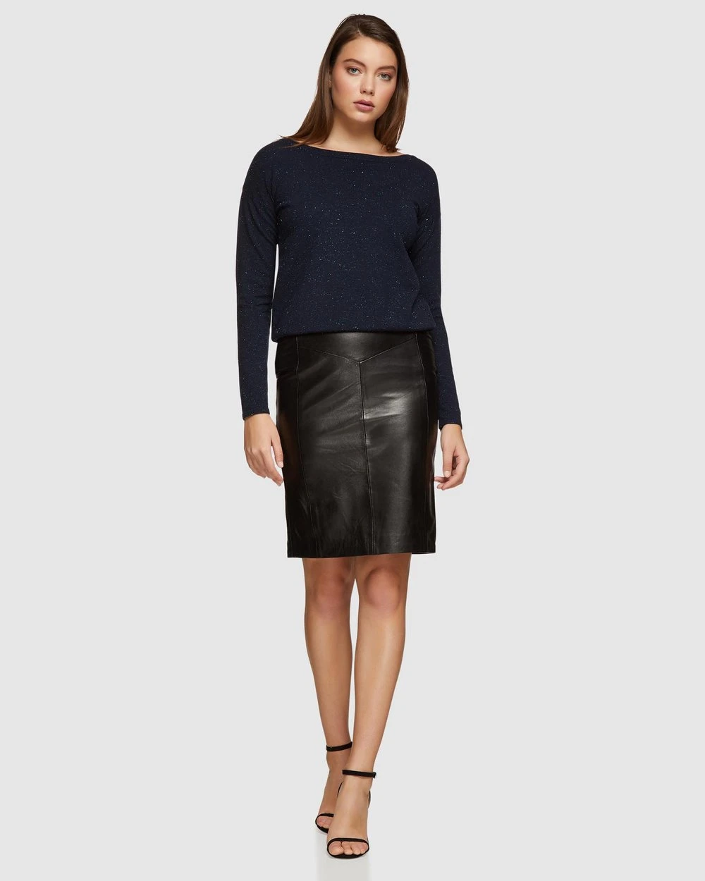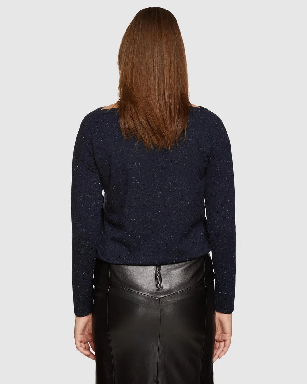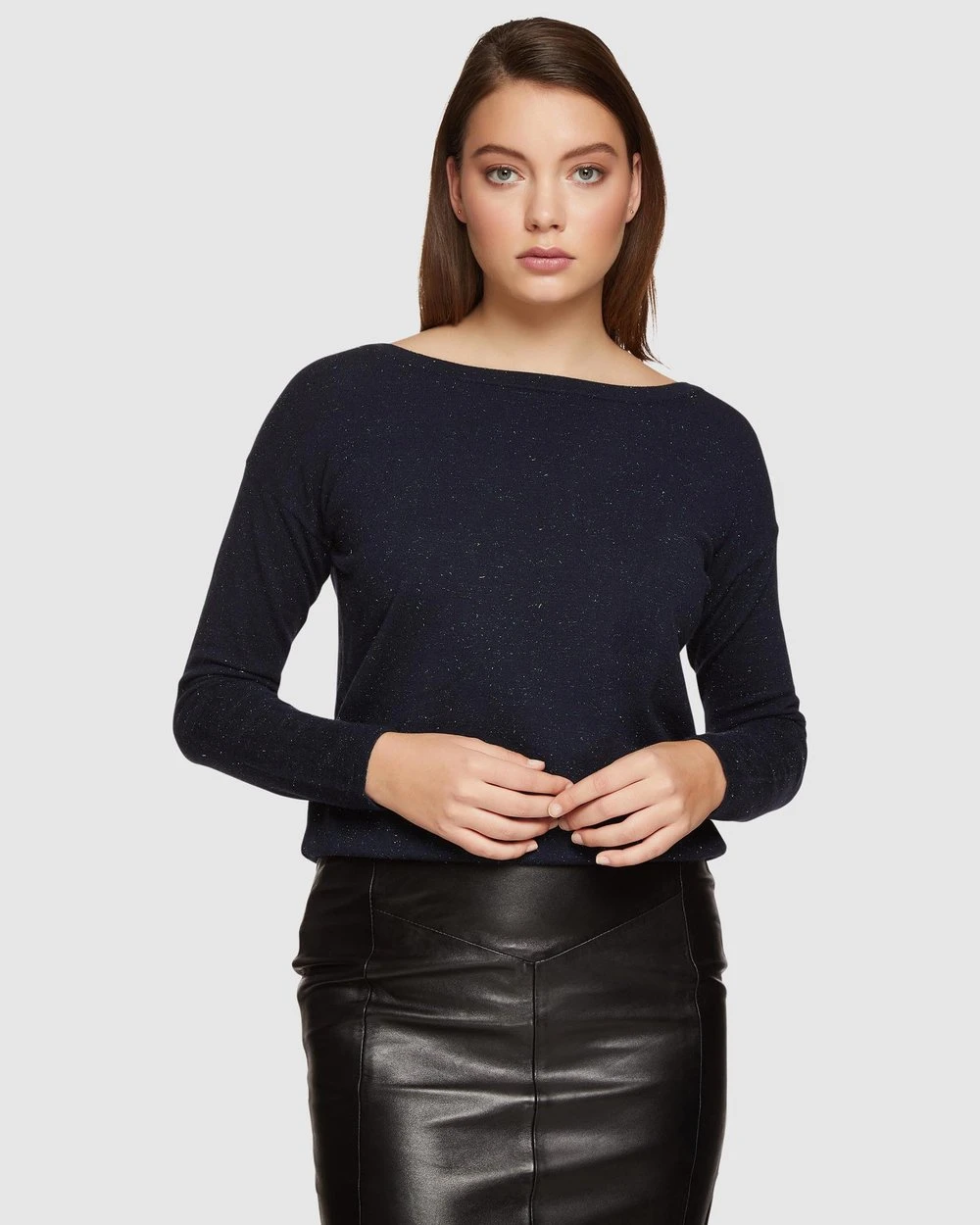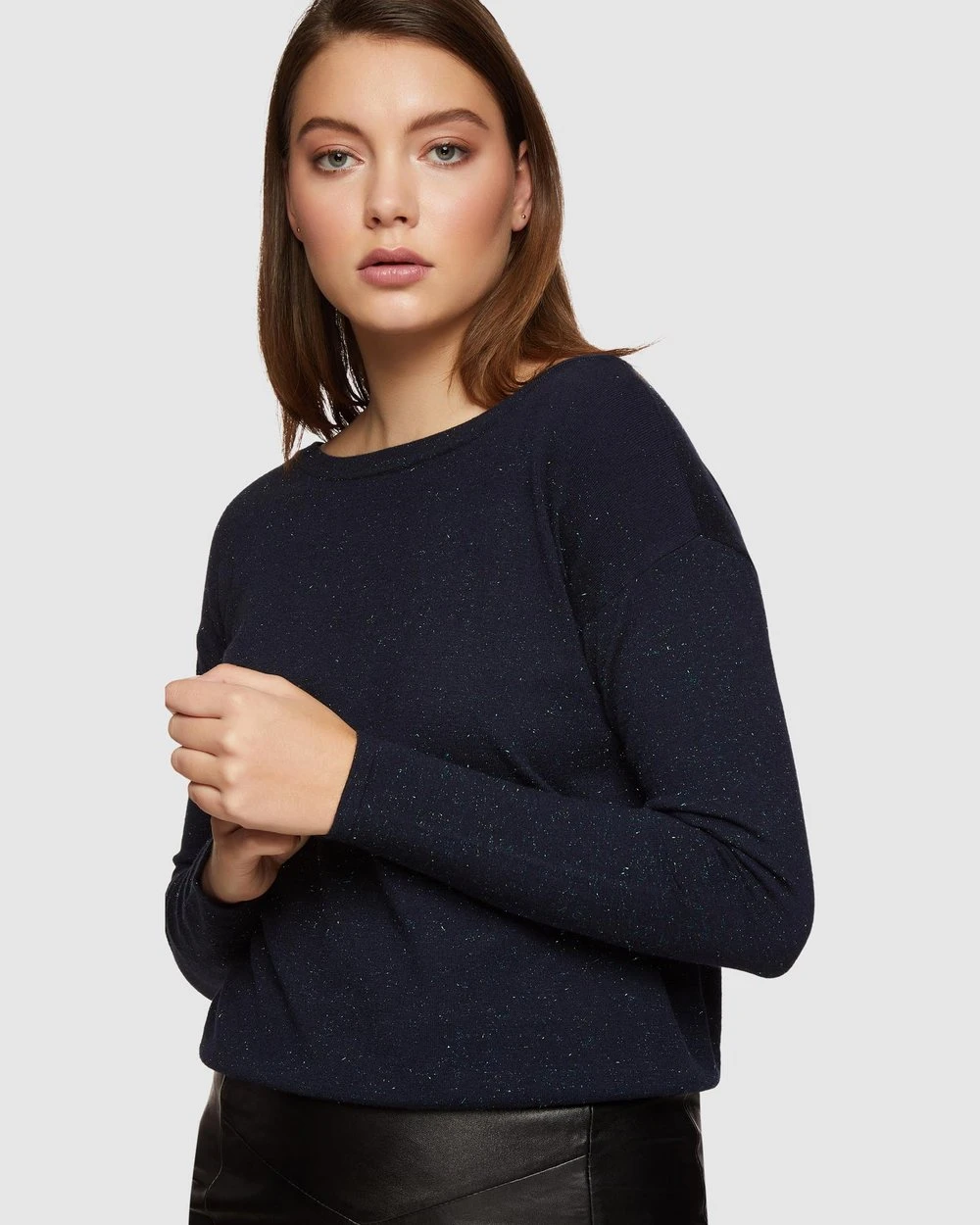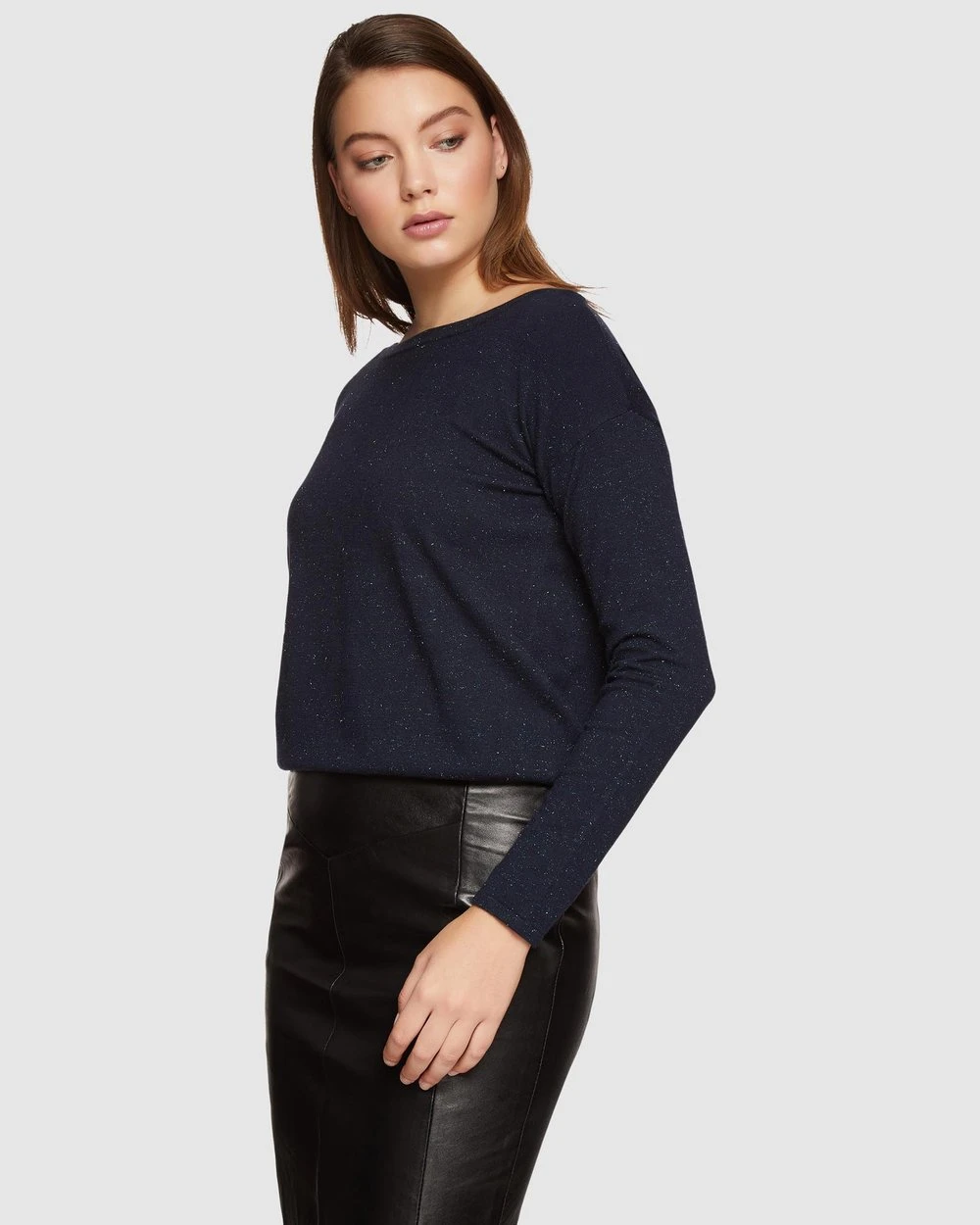 Add some sparkle to your look with the Oxford Metallic Boatneck Knit. This style features a fun metallic thread through the knit, boatneck and long sleeves. Go from desk to dinner with this knit by styling it with a chic leather skirt and heels.