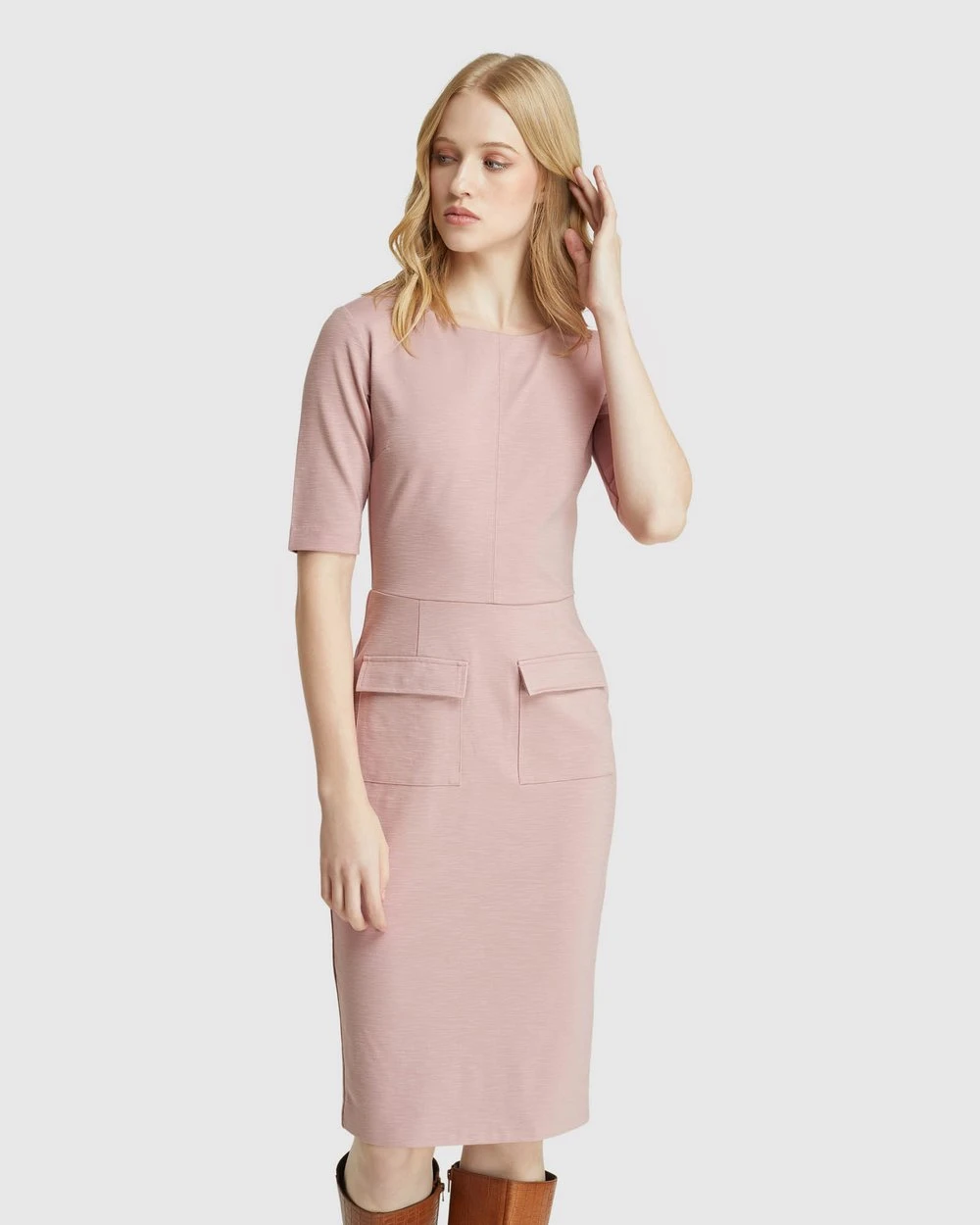 The perfect work dress, the Giselle Ponti Dress by Oxford is a smart and confident style. It is crafted from a ponti fabrication with a hint of stretch and features a fitted waist, front patch pockets and an exposed back zip.