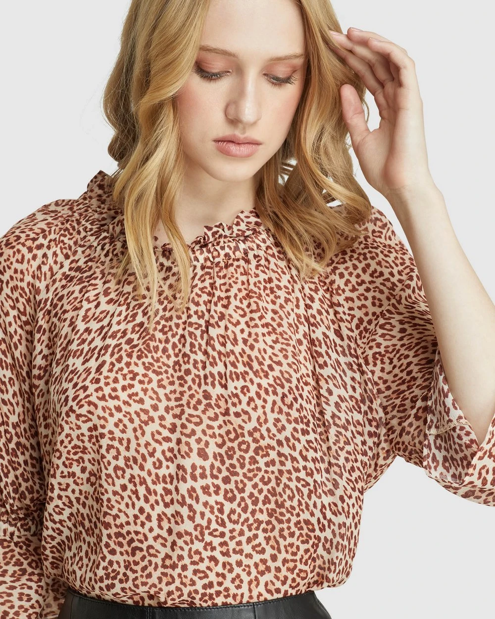 A ravishing and elegant style, the Grace Animal Printed Top by Oxford will give your look a lift. Crafted from a lightweight sheer fabric, this relaxed fit top features a round neckline with a ruffled trim, elastic cuffs with flared sleeves and a sleek animal print.