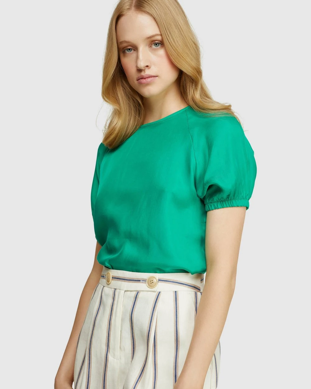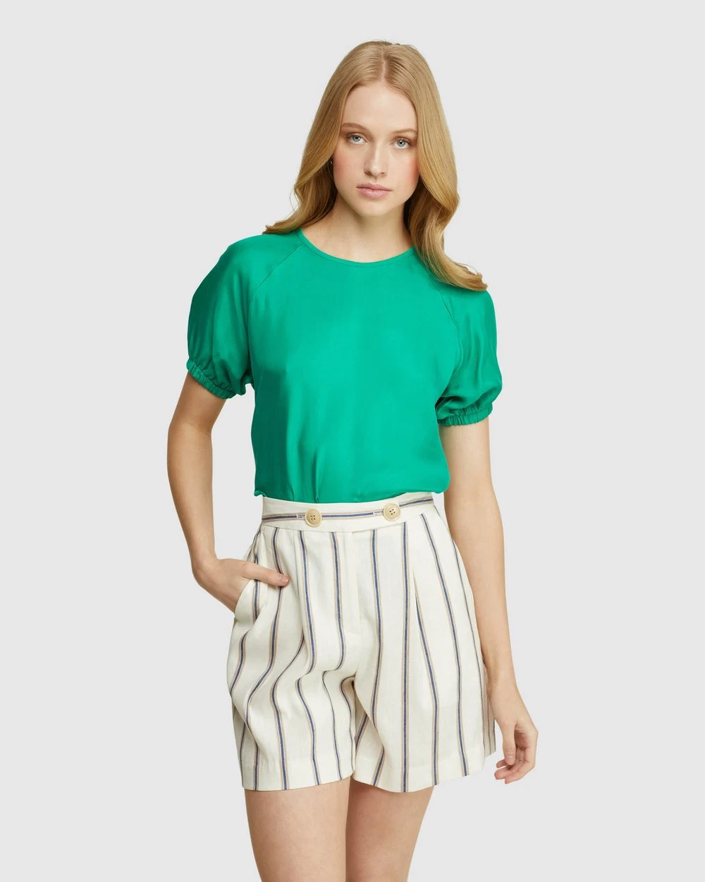 The Hannah Woven Front T-Shirt by Oxford is a basic with a touch of flair. This versatile women’s t-Shirt is cut in a relaxed fit with a woven texture contrast on the front and features subtly puffy sleeves with elastic cuffs