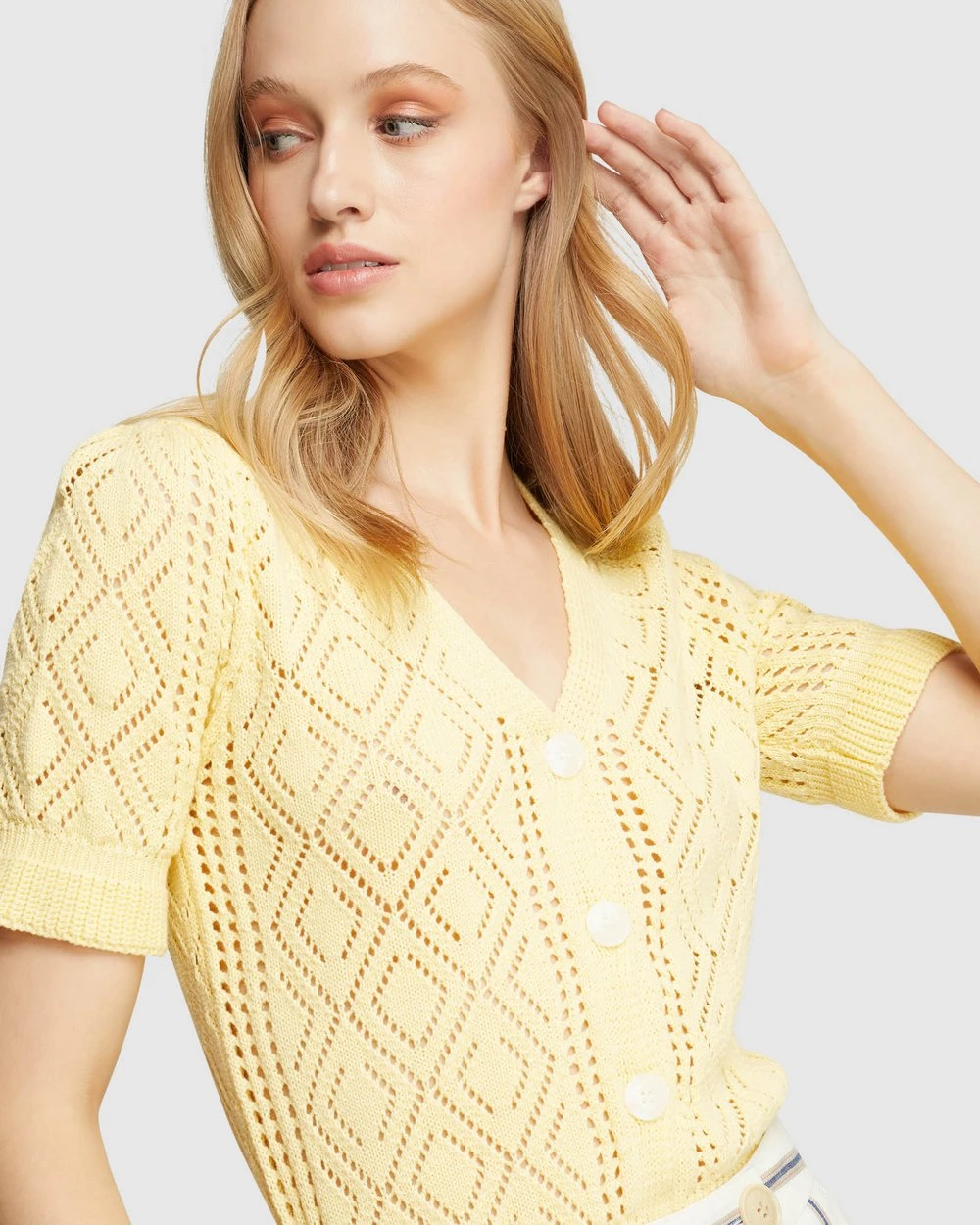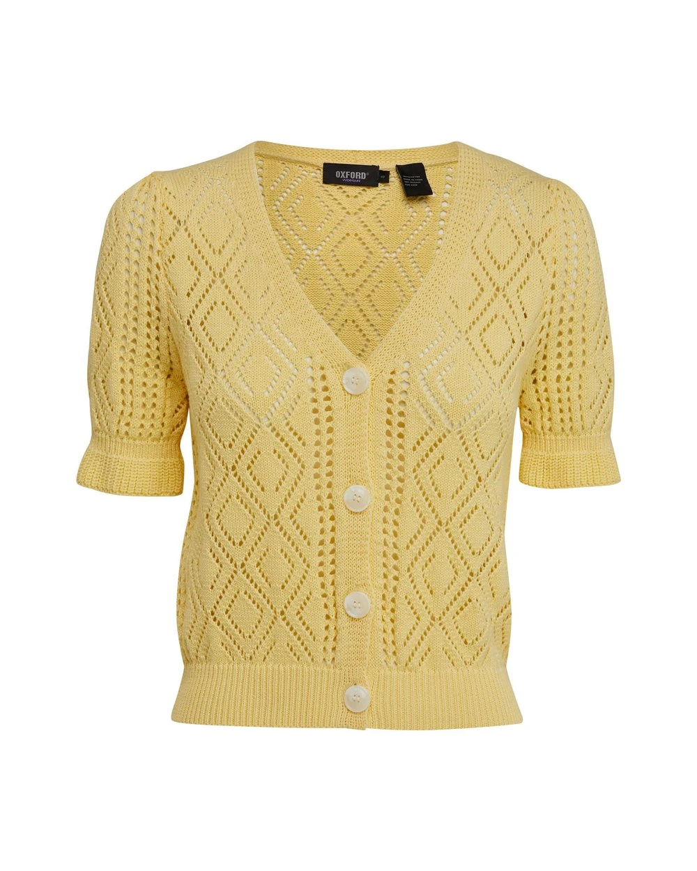 For a cute look with a vintage feel add the Harriet Cable Knit Cardigan by Oxford to your collection. This summer knit is crafted from 100% cotton with a gorgeous cable knit pattern. It has a button front with large contrast buttons, a deep v-neckline and ribbed trims.