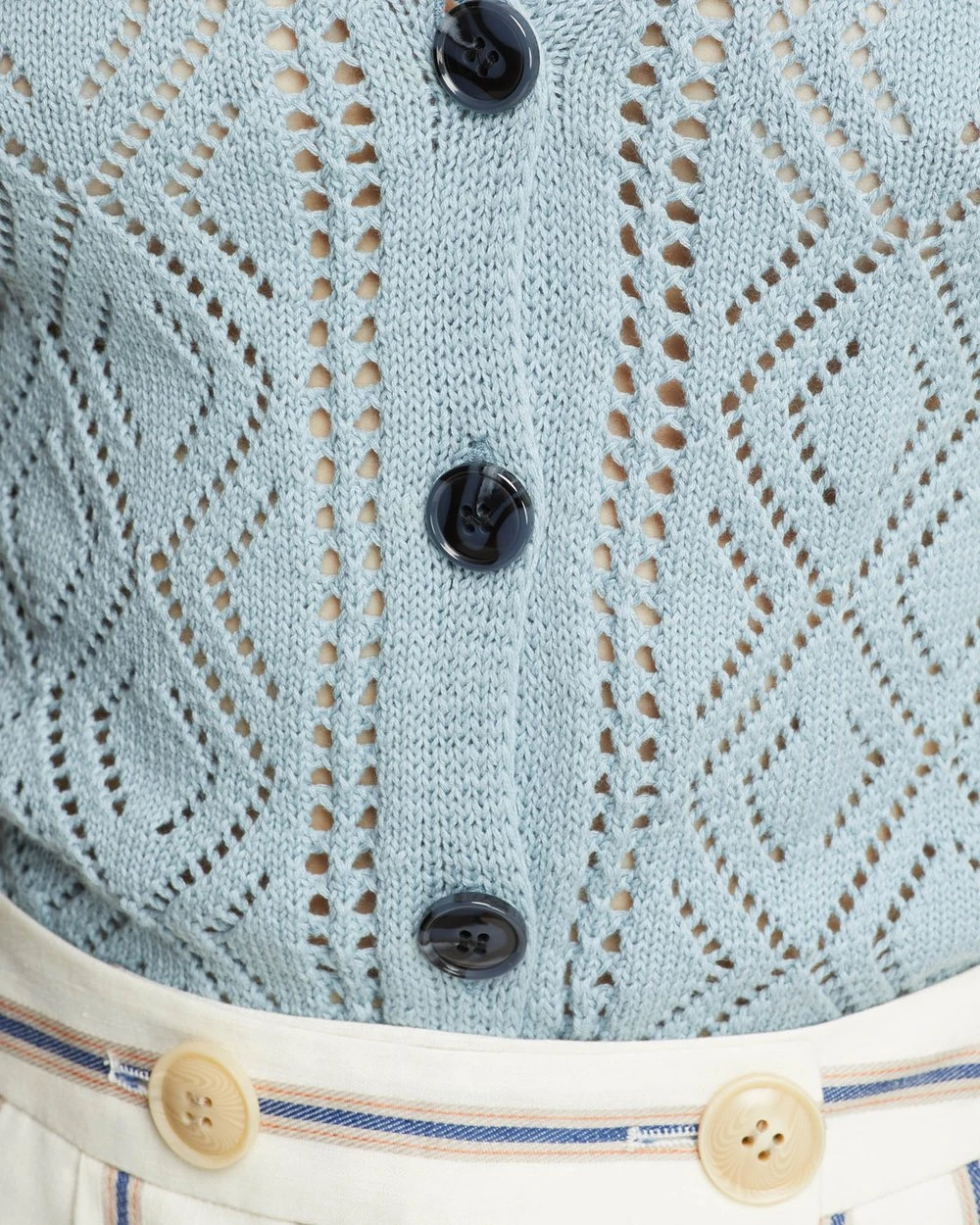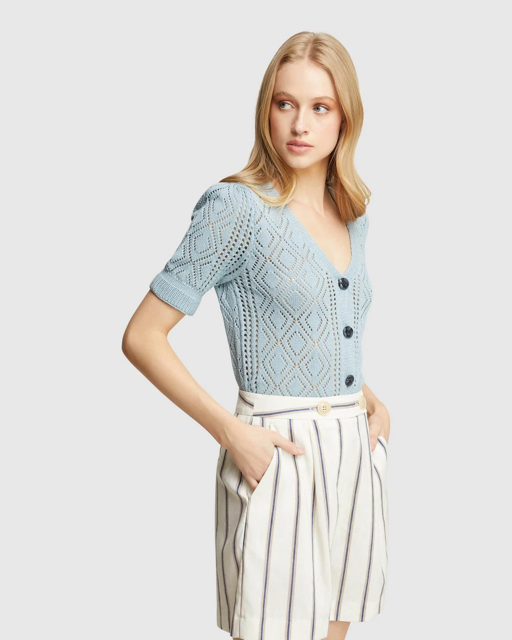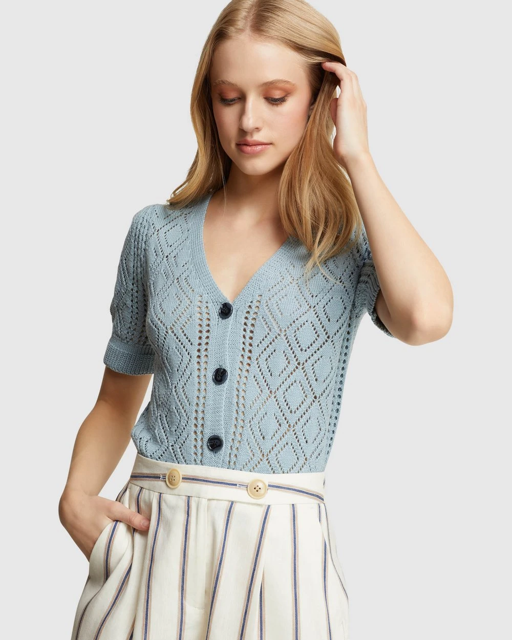 For a cute look with a vintage feel add the Harriet Cable Knit Cardigan by Oxford to your collection. This summer knit is crafted from 100% cotton with a gorgeous cable knit pattern. It has a button front with large contrast buttons, a deep v-neckline and ribbed trims.
