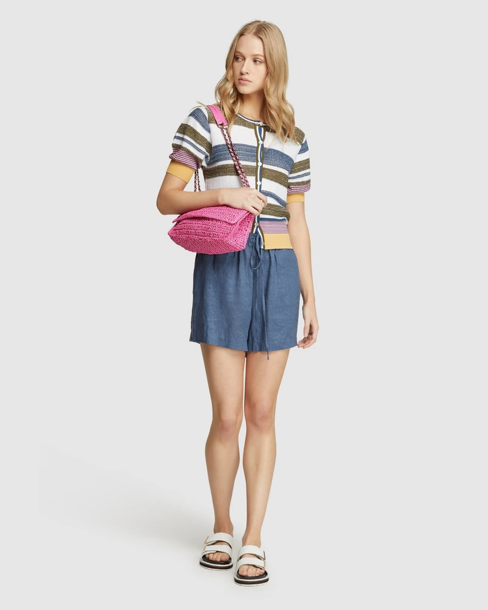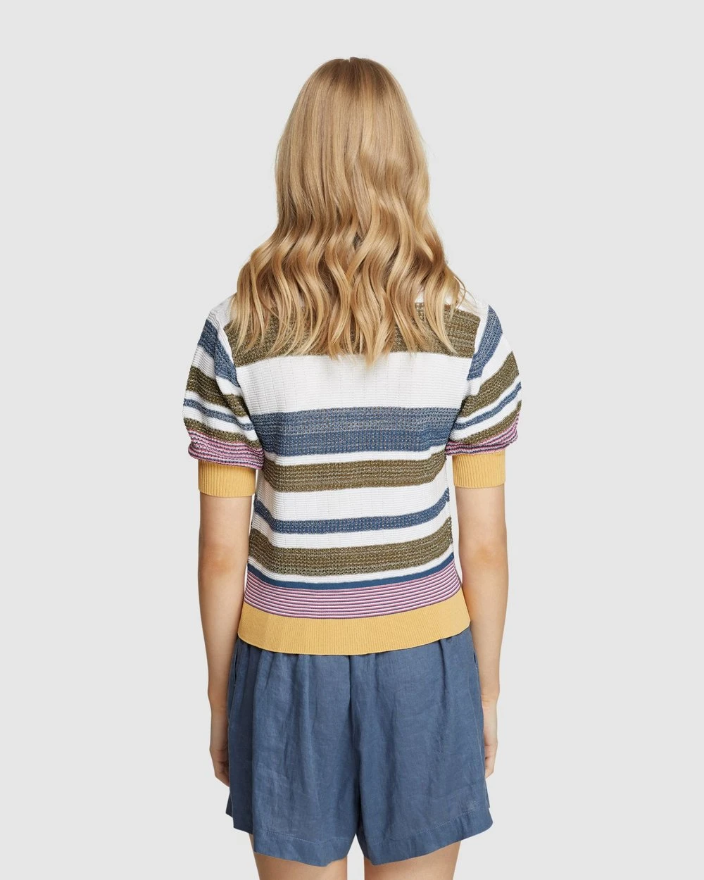 Feel fab in the Hattie Striped Cardigan Knit by Oxford. This fun top is crafted from a loose knitted weave with a splash of metallic yarn and features mother of pearl buttons ribbed trims and a round neckline.