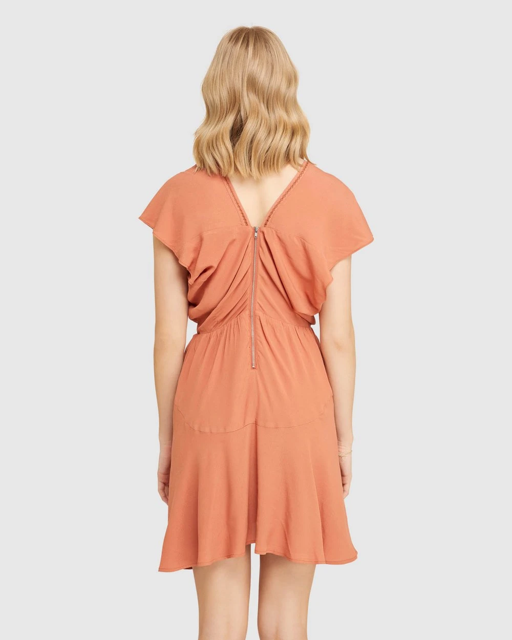 Length: 88cm (Size 8). Our model is wearing a size AU 8 dress and usually takes a size 8. She is 178cm (5’84”) tall with an 81cm (32″) bust, a 63cm (25″) waist and 86cm (34″) hips.
