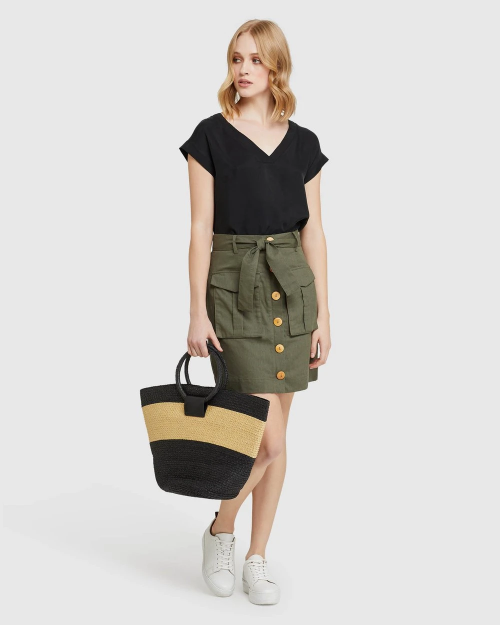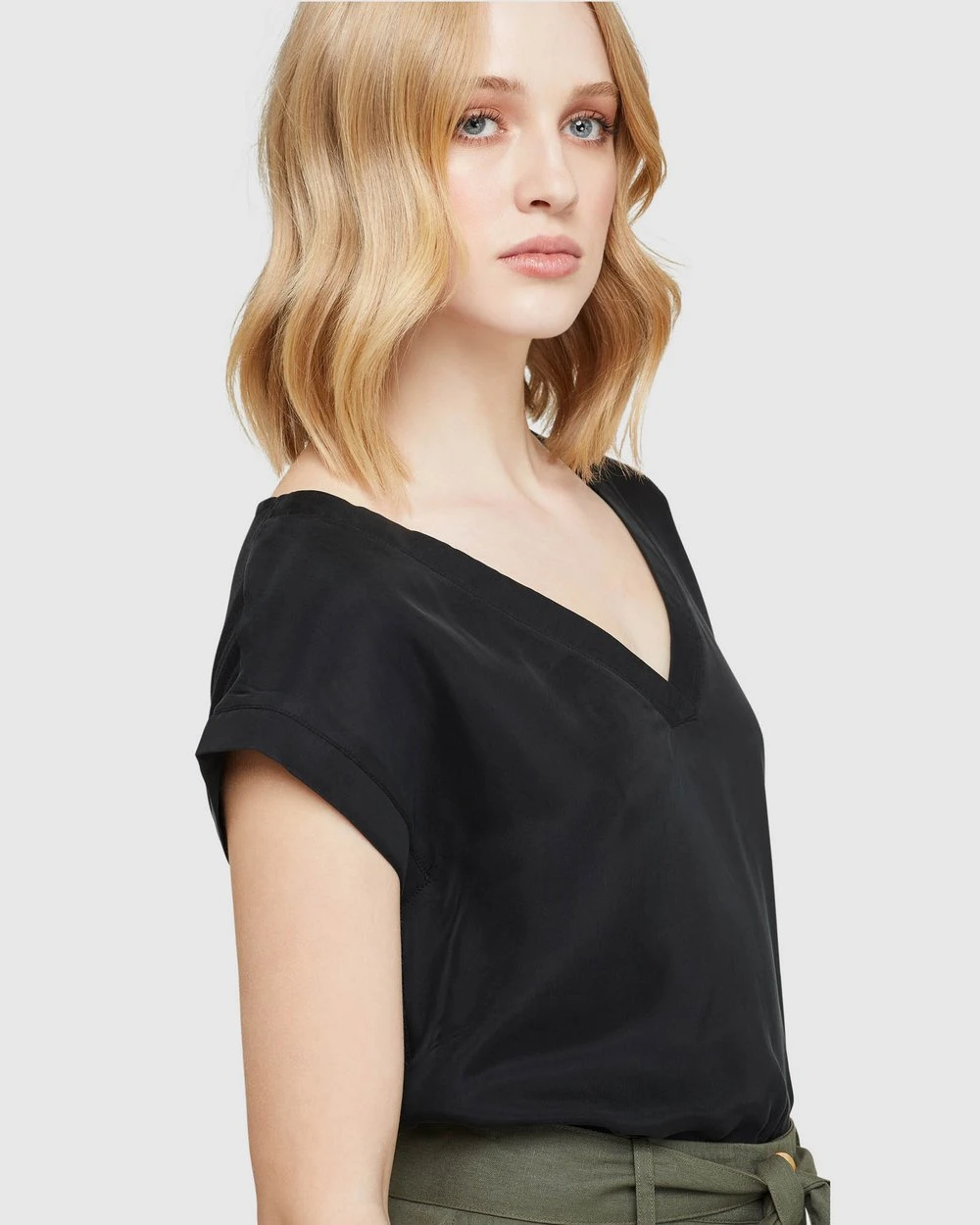 Length: 62cm (Size 8). Our model is wearing a size AU 8 blouse and usually takes a size 8. She is 178cm (5’84”) tall with an 81cm (32″) bust, a 63 cm (25″) waist and 86cm (34″) hips.