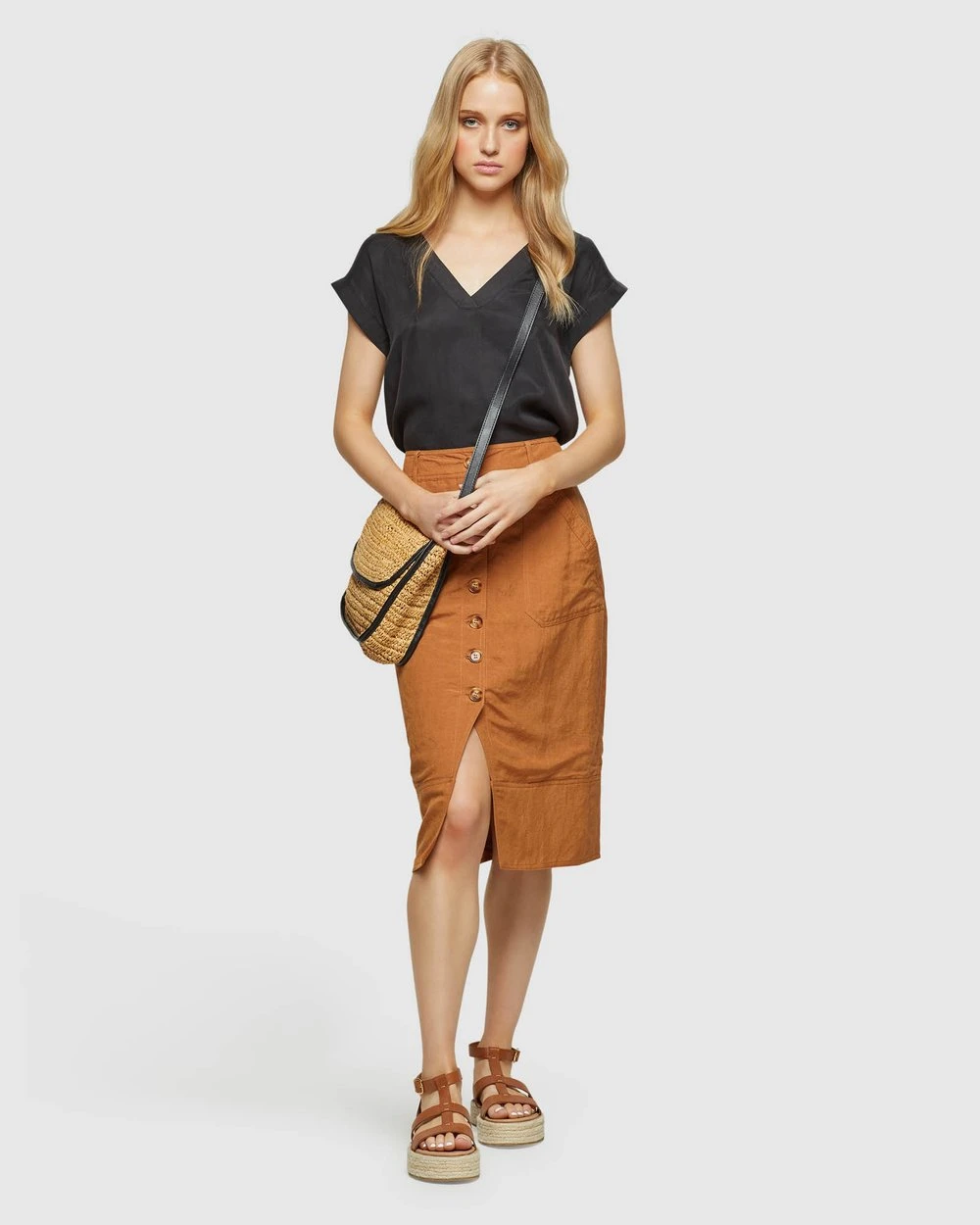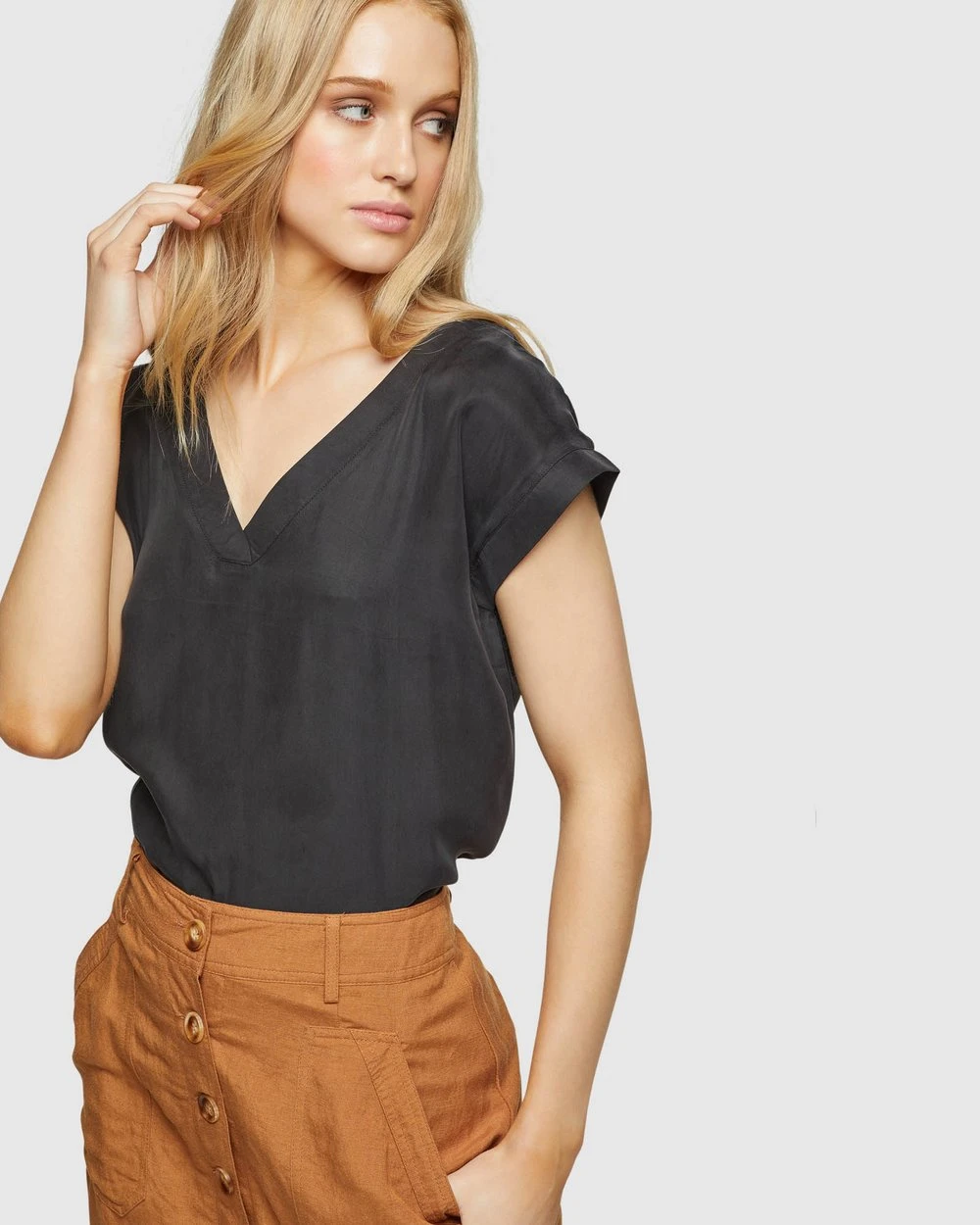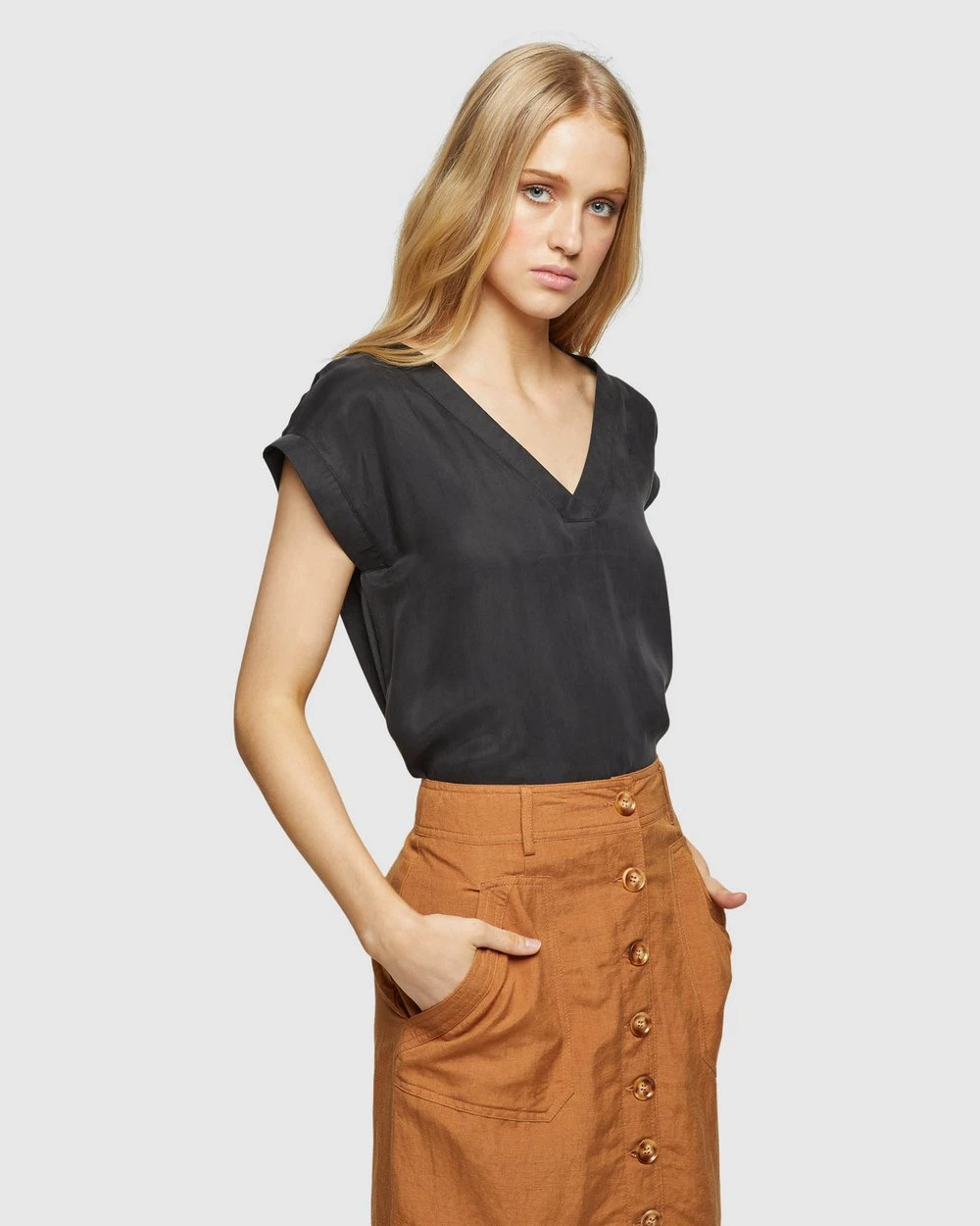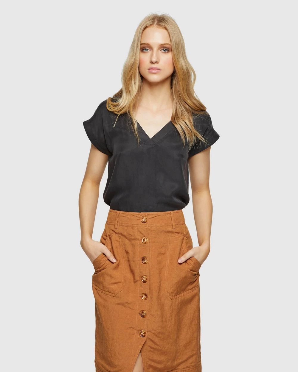 Length: 62cm (Size 8). Our model is wearing a size AU 8 blouse and usually takes a size 8. She is 178cm (5’84”) tall with an 81cm (32”) bust, a 63 cm (25”) waist and 86cm (34”) hips.