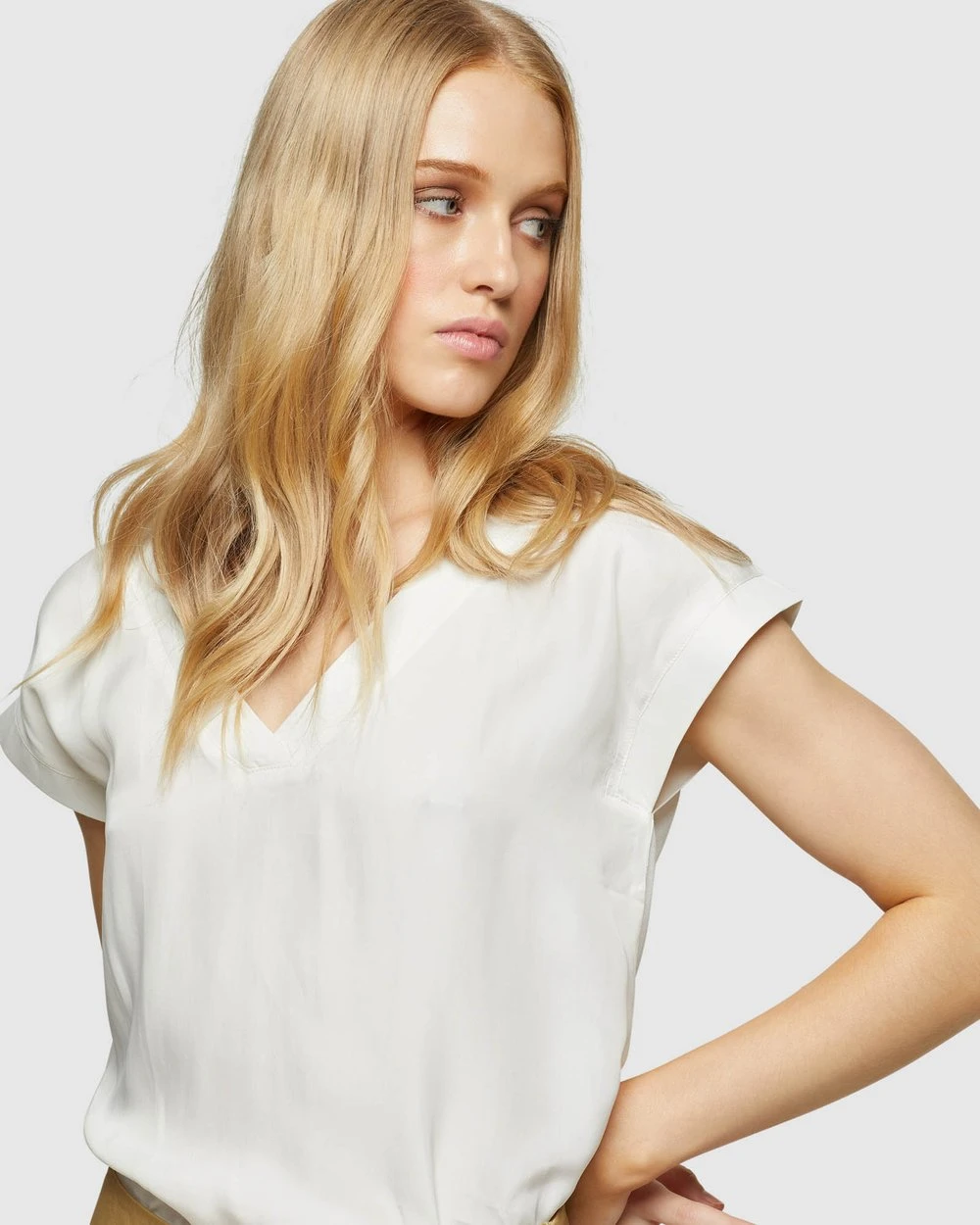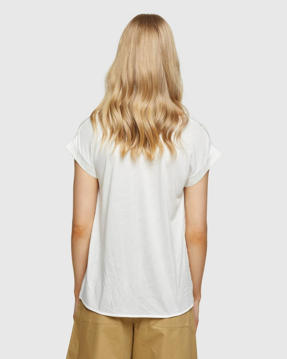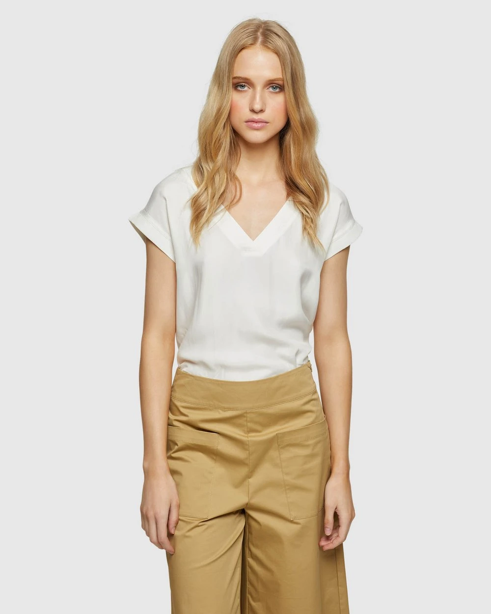 An understated and elegant basic, the Inga Woven Front T-Shirt by Oxford will work with just about any look. It has front and back contrasting fabric with a v neckline and capped sleeves.