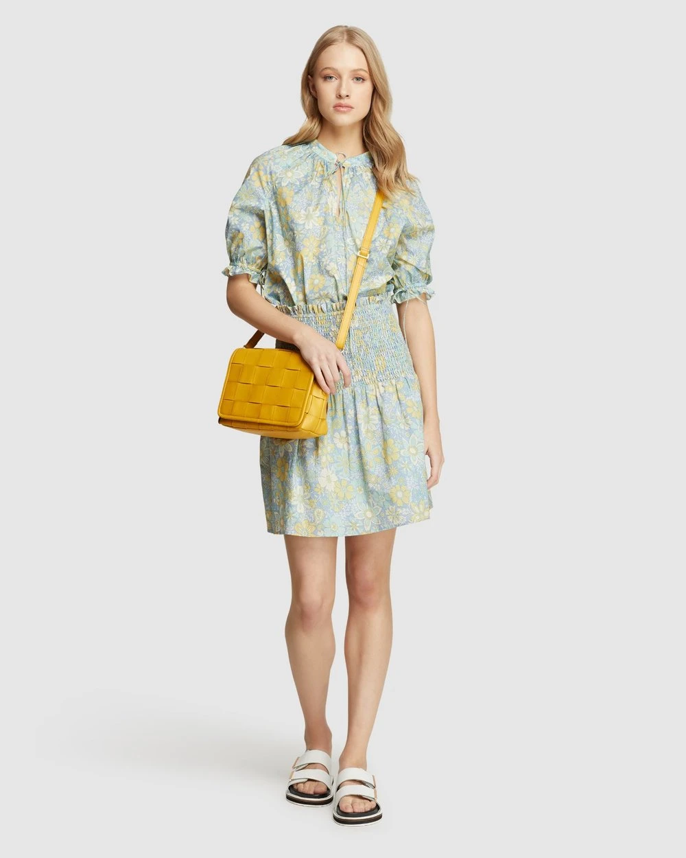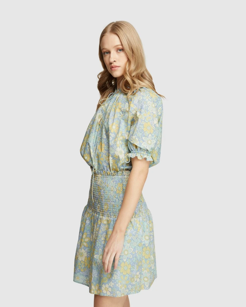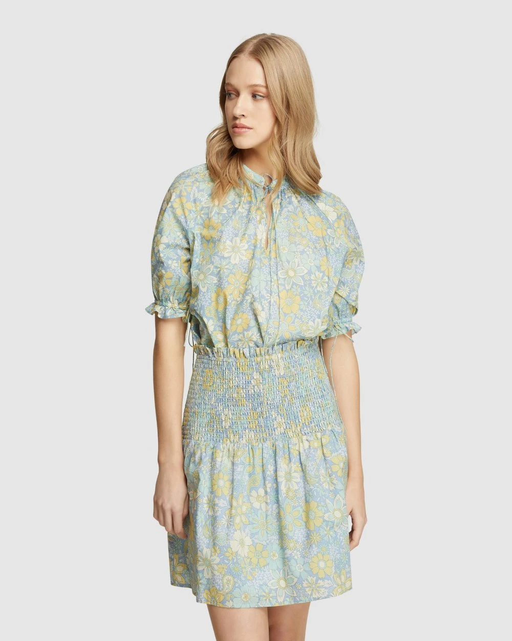 A cute blouse with a retro feel, the Isabel Cotton Floral Top by Oxford will take you from work to play. This cotton blouse features a subtle floral print with elegant tie detail on the neckline and sleeves. Wear it with the matching Exist Cotton Shirring Skirt.