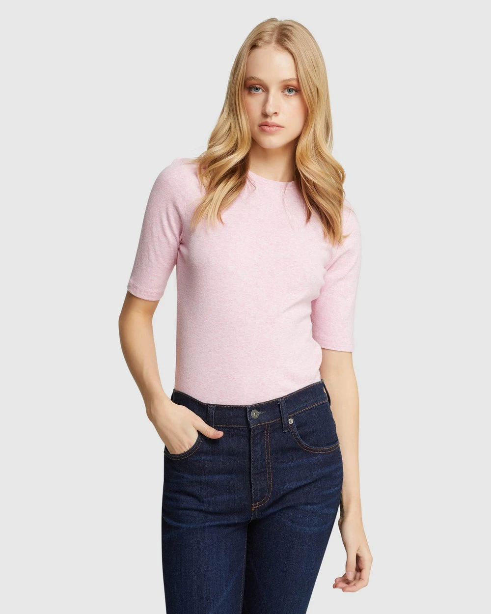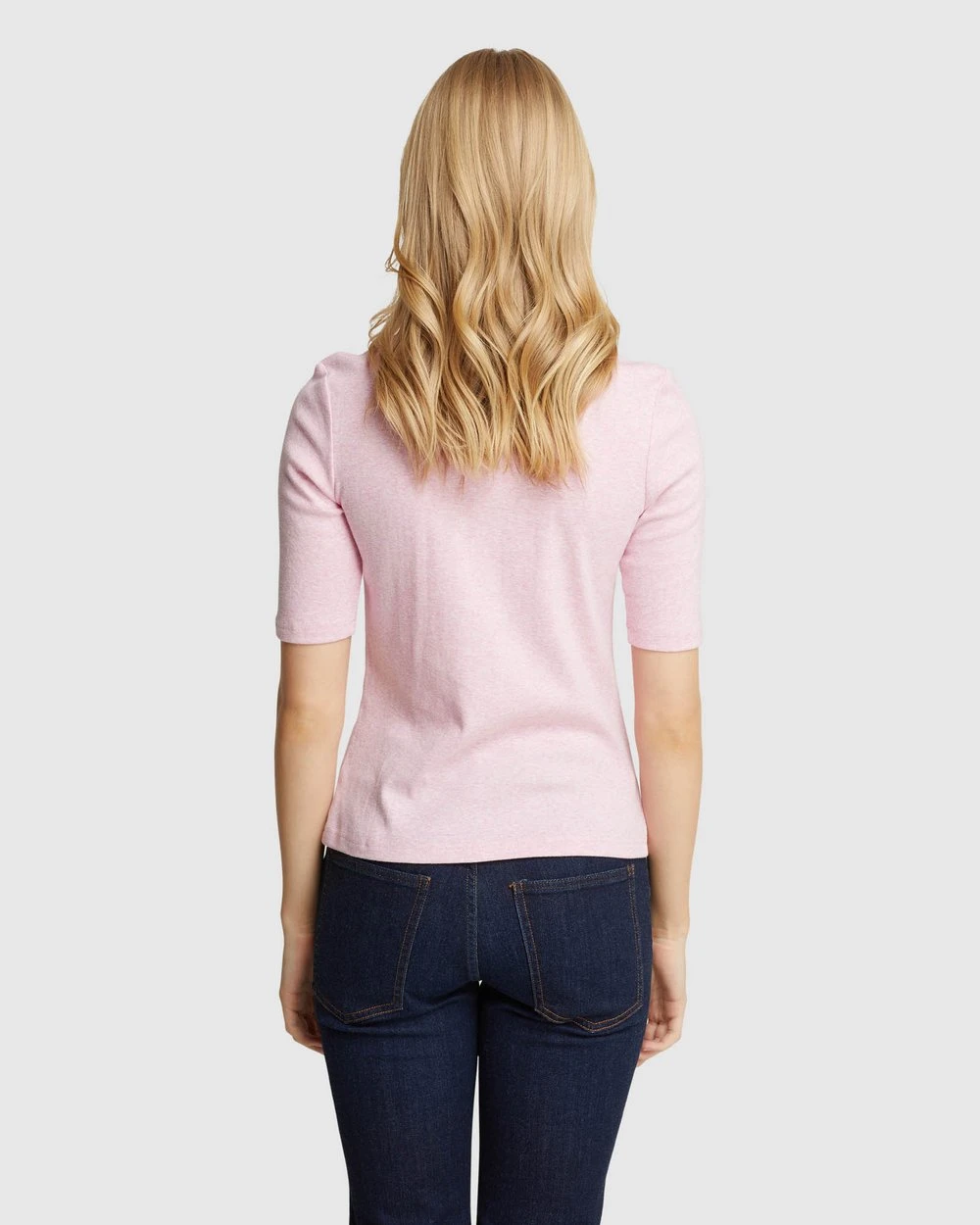 The Jasmine Rib T-Shirt by Oxford is a versatile basic that will go with anything. This effortless style is cut in a slim fit and is crafted from 100% cotton in a ribbed knit with a round neckline and mid-length sleeves.