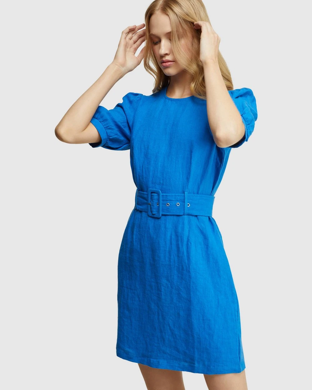 The Jessie Linen Mini Dress by Oxford is a gorgeous mini for all your summer parties. This subtle mini is crafted from 100% linen and cut in a slim fit. It features a belted waist, round neckline and ballooned sleeves.
