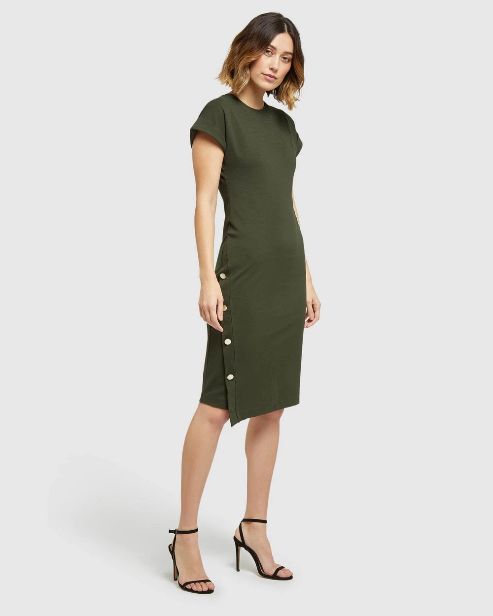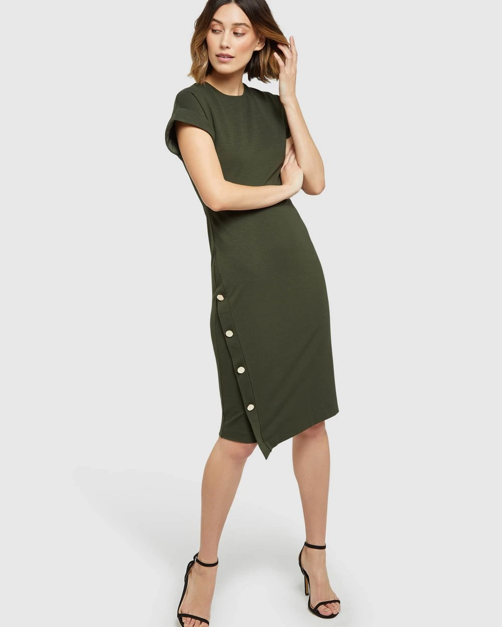 The distinctive design of the Oxford Kensington Ponti Dress will take you from desk to dinner. This snug style is cut for a close fit and features metallic buttons along one side with a round neckline, short cuffed sleeves and exposed back zipper. Suitable for work or play, a pair of heels and leather accessories is all you need for an effortless look.