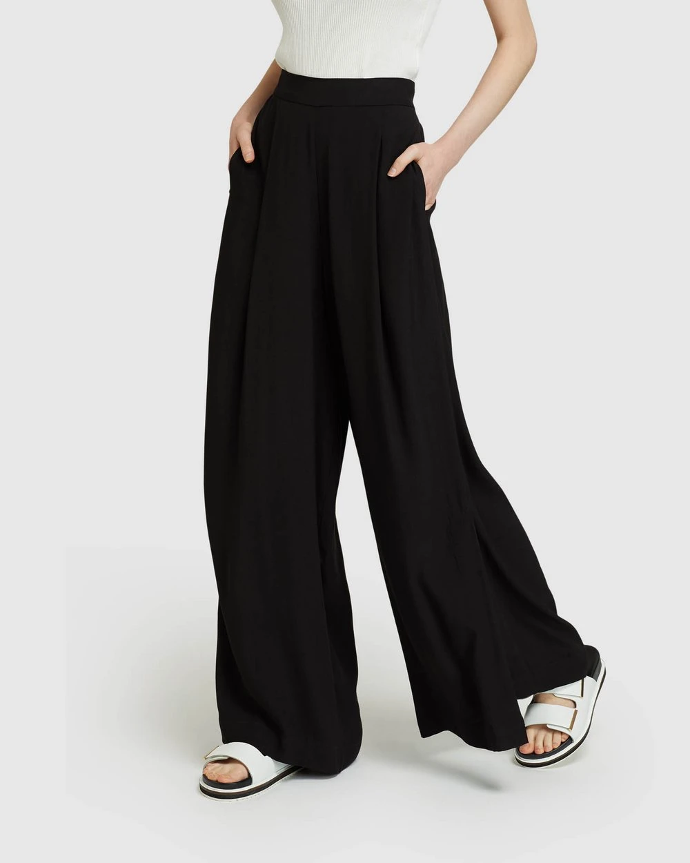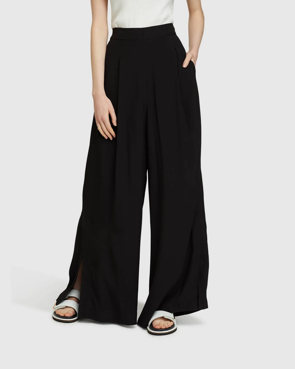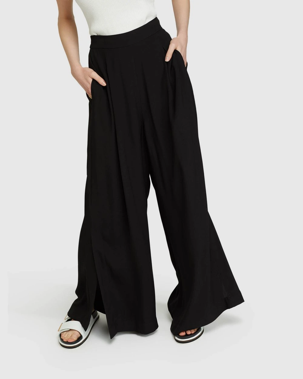 Make a statement in the Lara Wide-Leg Crepe Pants by Oxford. These elegant pants are super comfortable with a light and flowy feel. They sit high on the waist with a pleated style to create a graceful wide leg that features a side split.