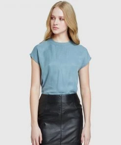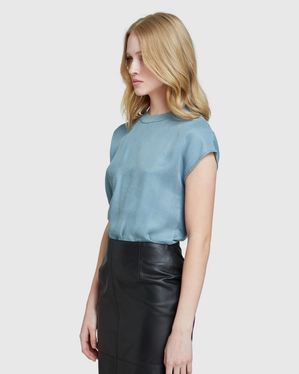 A versatile basic, the Oxford Lauren Woven Front T-Shirt features capped sleeves, high neckline and contrast front and back fabric.