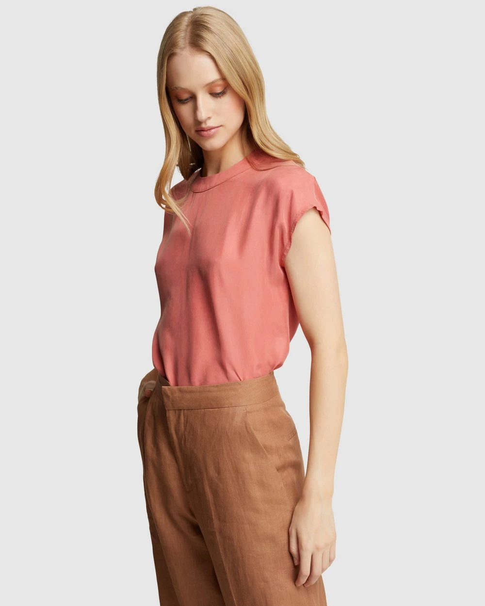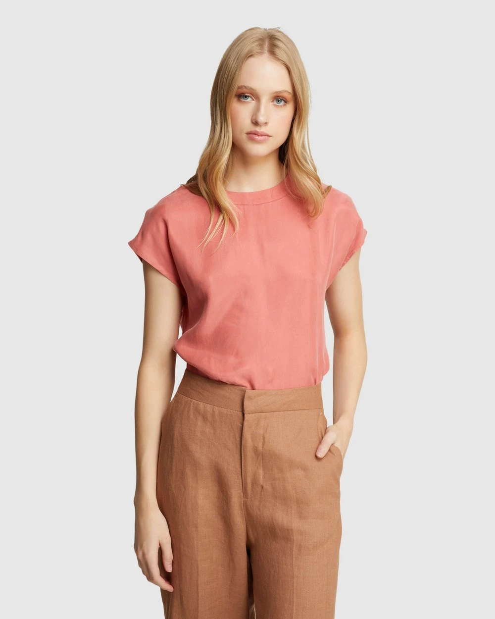 A versatile basic, the Lauren Woven Front Top by Oxford will go with just about anything. This relaxed-fit t-Shirt features capped sleeves, high neckline with a contrast front and back fabric.