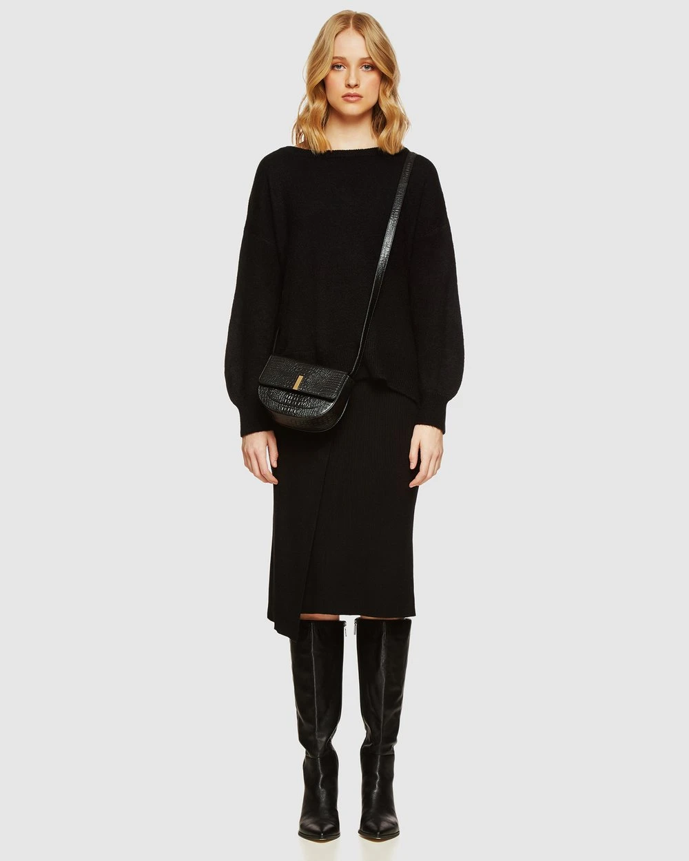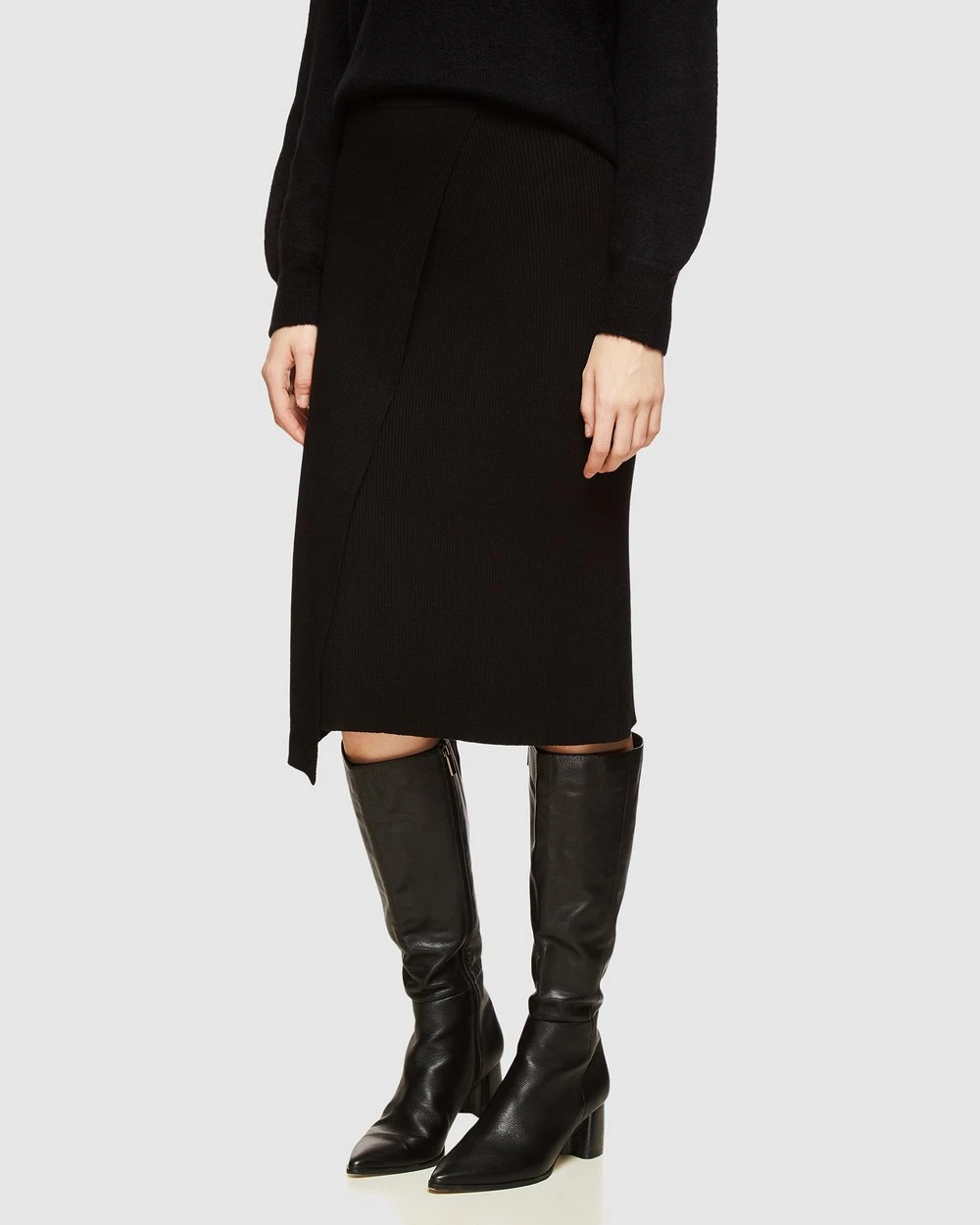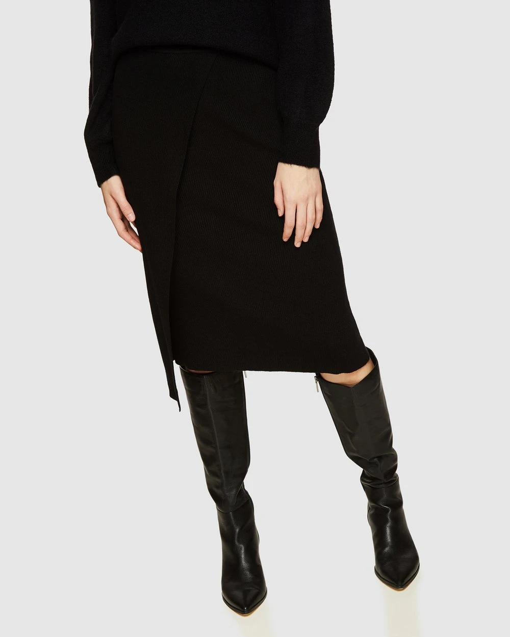 An effortless and versatile addition to your wardrobe, the Oxford Leeza Wrap Knitted Skirt will be your new go-to style. Crafted from a ribbed knit blend in a close fit this skirt has a wrap-around design with an asymmetrical hemline. Complete a sleek look with a black knit and knee-high boots.