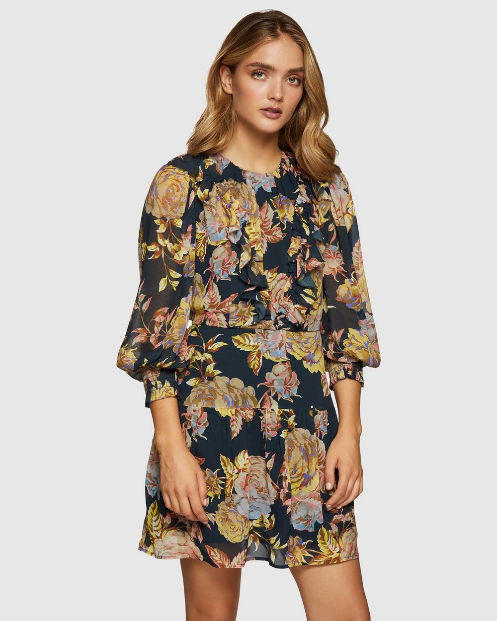 The perfect trans-seasonal style, the Oxford Locky Navy Floral Dress will take you from work to the weekend. This dress is crafted from lightweight fabric in a beautiful floral print, and features frill details and a high neckline with mid-length, wide sleeves. Style it with heels for work or boots for a fun weekend look.
