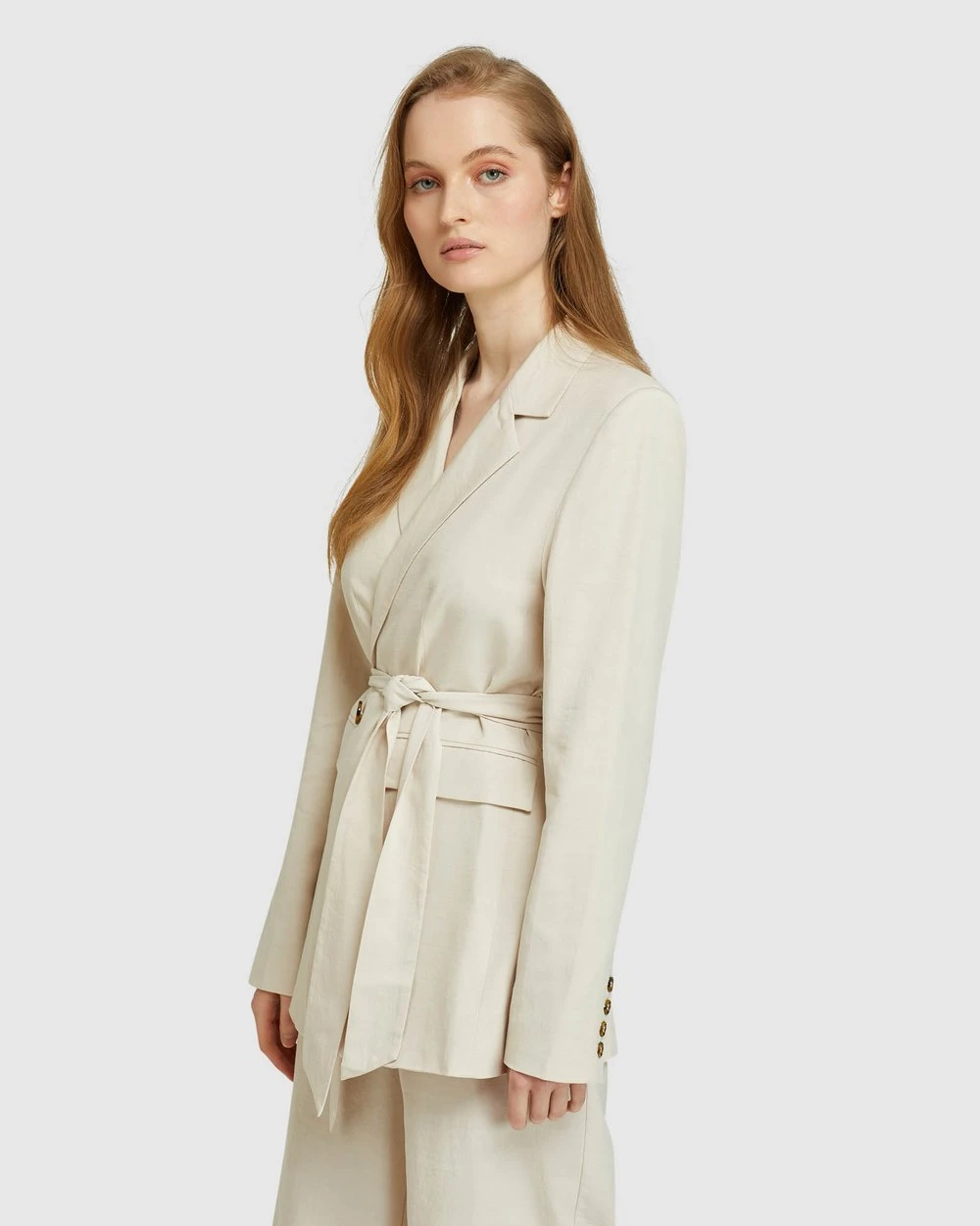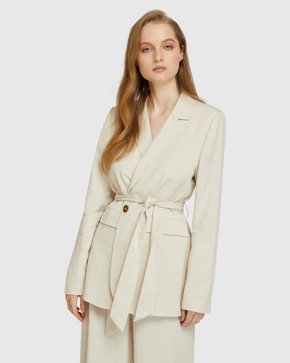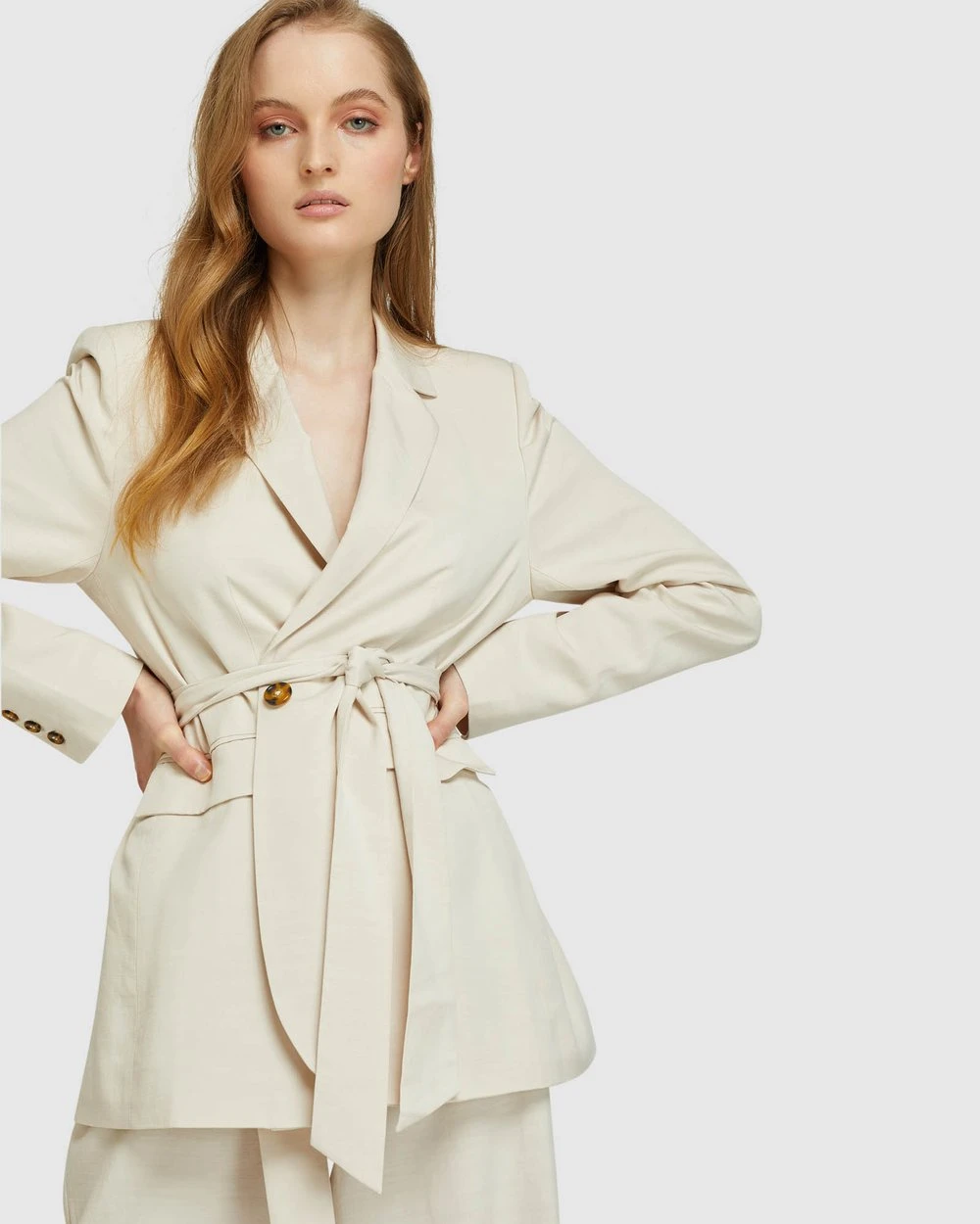 The Lola Detachable Belt Blazer by Oxford is a timeless feminine style for work or play. This jacket is crafted from a lightweight tencel and cotton blend, and cut in an oversized fit. It features a detachable belt so you can style it as you please.