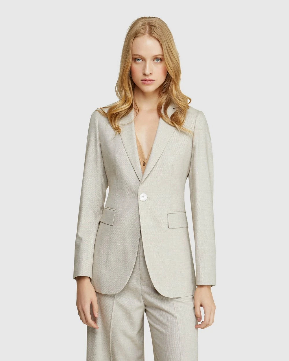 The Lola Stretch Eco Blazer by Oxford is a timeless feminine style for work or play. Constructed from a high-quality fabric that utilises recycled materials, this blazer is cut in a slim fit with a hint of stretch and features a large single button fastening, slim lapels, and side pockets. Wear it with the matching Lacie Stretch Eco Suit Pants and Peggy Stretch Eco Suit Skirt