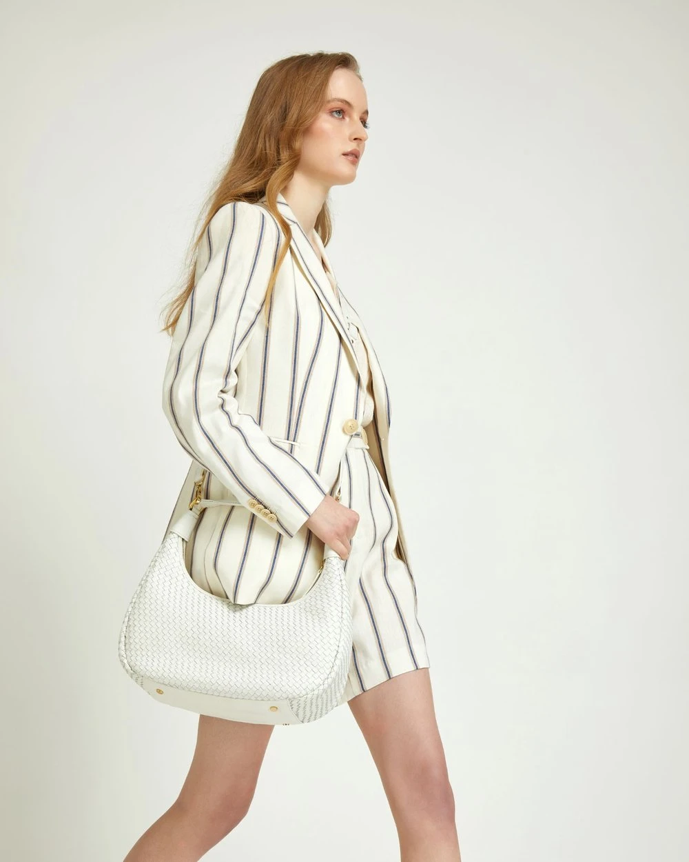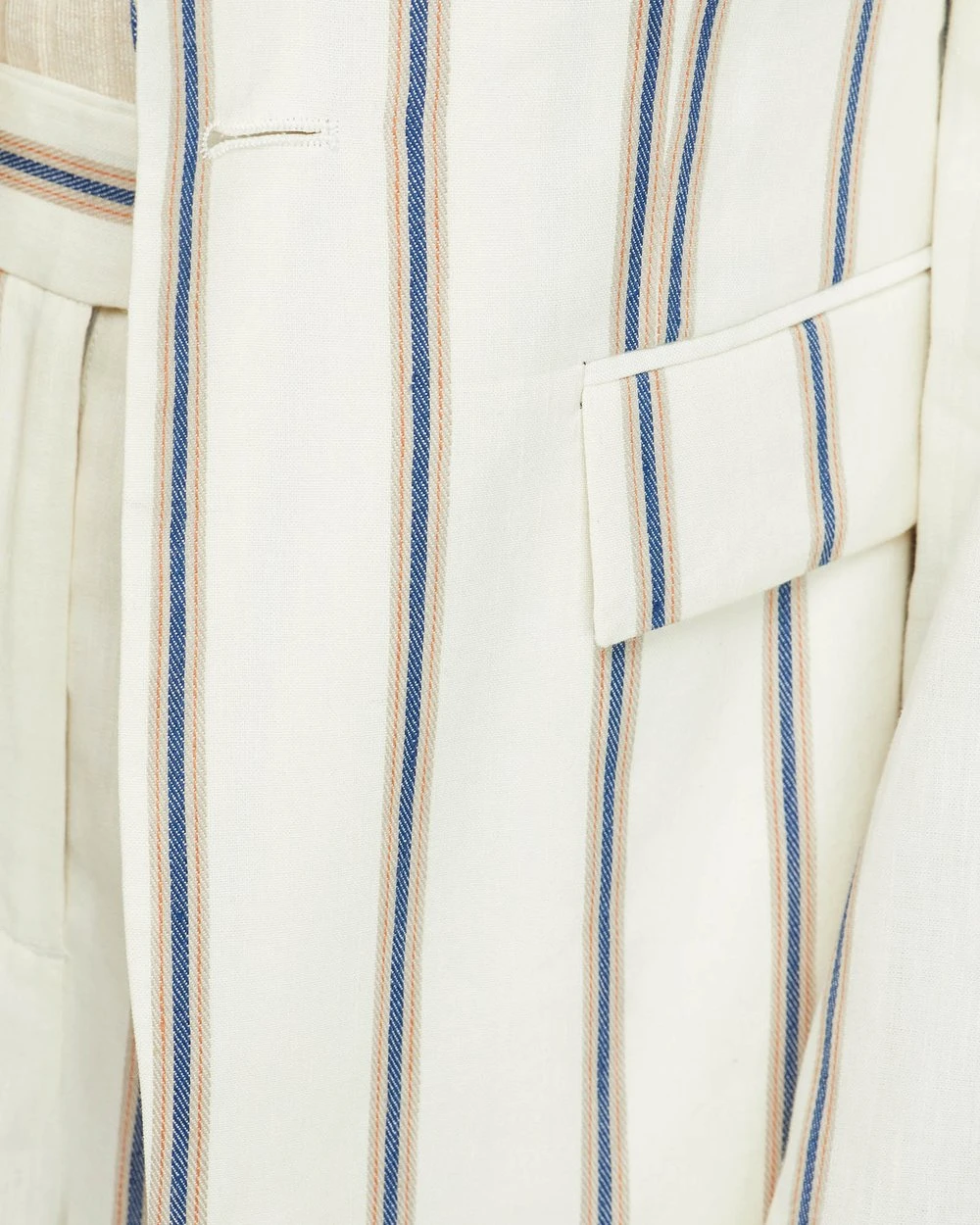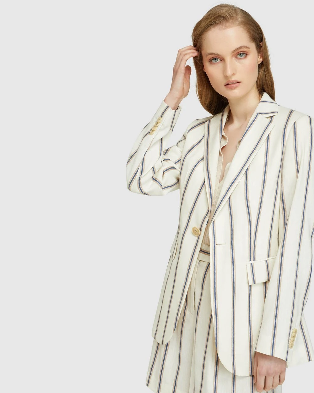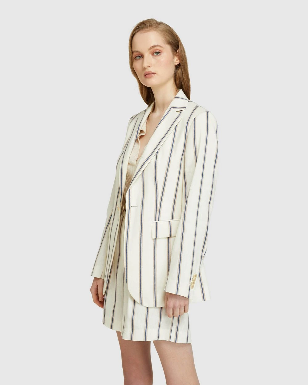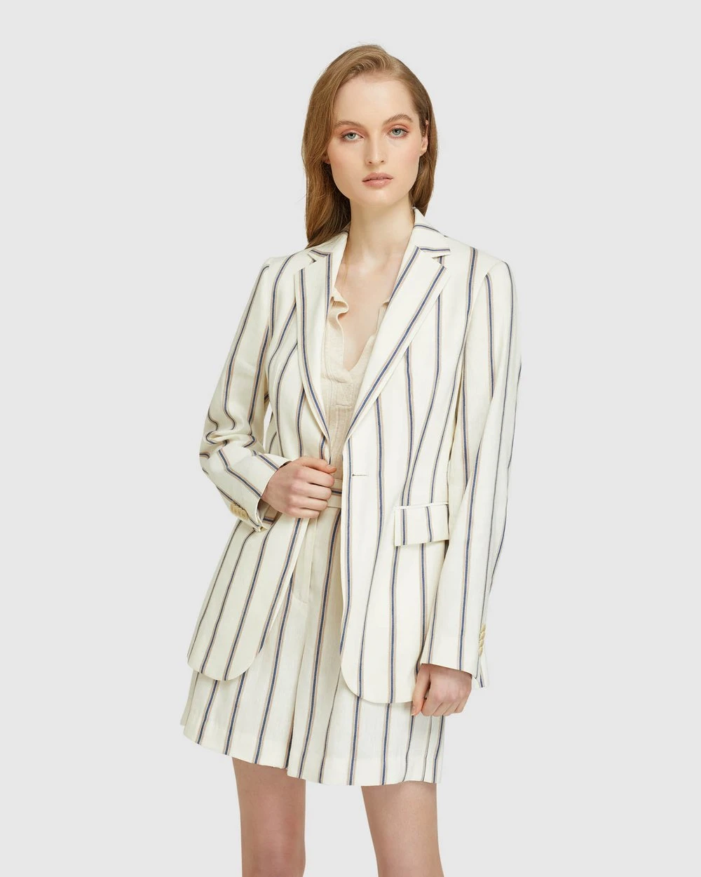 A striking feminine style Lola Striped Linen Blend Jacket by Oxford will give your look a lift. Designed to be an oversized fit, this linen-blend jacket has a vertical stripe pattern for a mod-feel with single button fastening and side pockets.