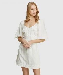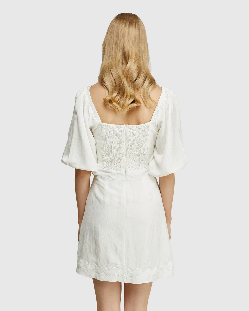 The Lorena Linen Blend Dress by Oxford is a serene summer look for relaxed weekend style. This subtle mini is crafted from a lightweight linen blend and cut in a slim fit. It features a fitted waist, square neckline and back, balloon sleeves and stitched pattern on the front and hem.