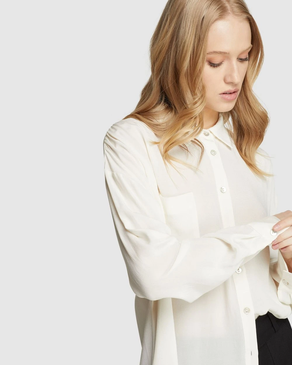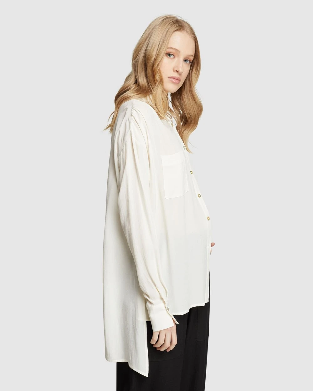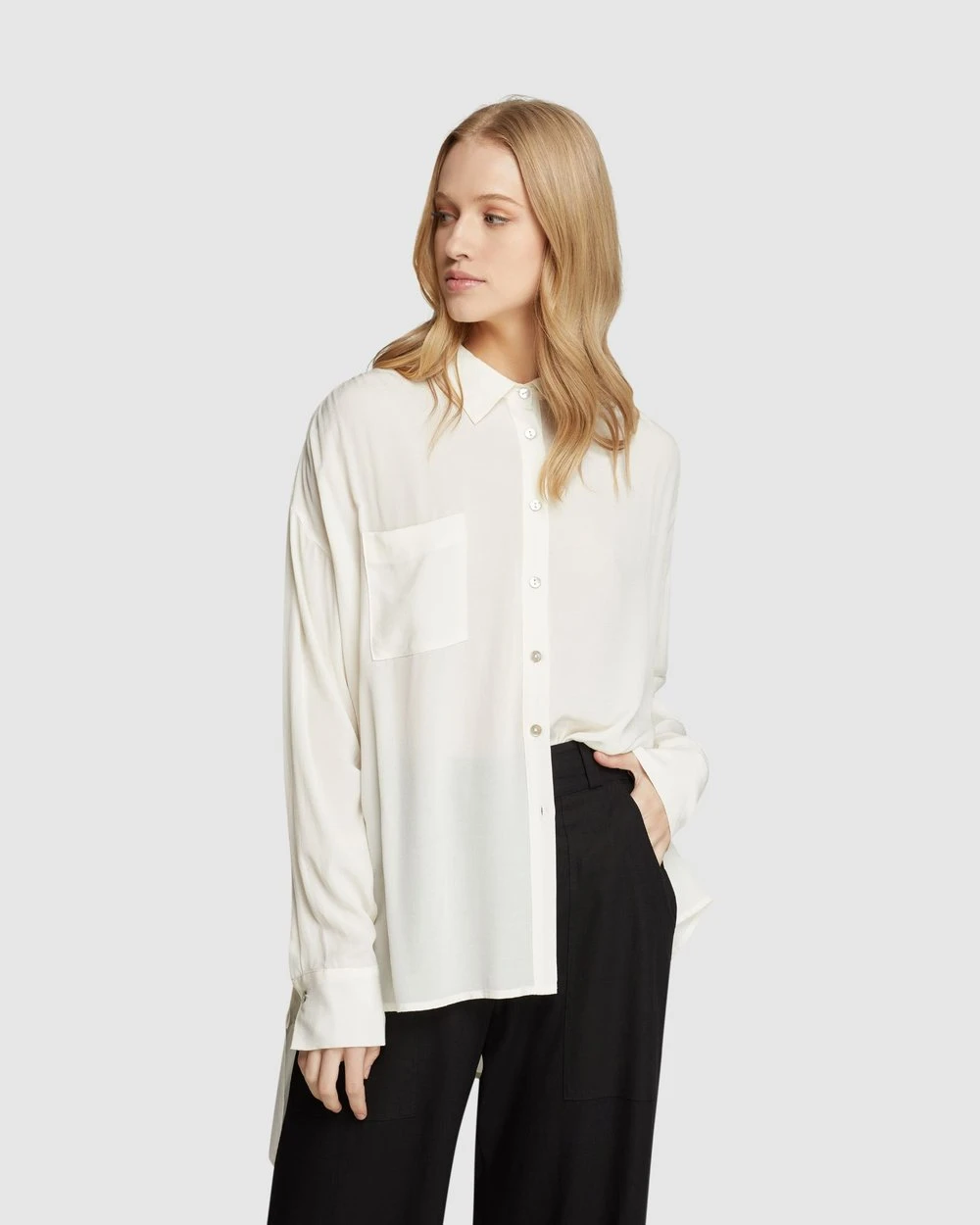 An elegant and feminine style, the Luna Oversized Shirt by Oxford is a contemporary look for work or play. This sleek Shirt has an oversized fit and a lightweight, drapey feel. It features statement side splits, a chest pocket, and a small collar.
