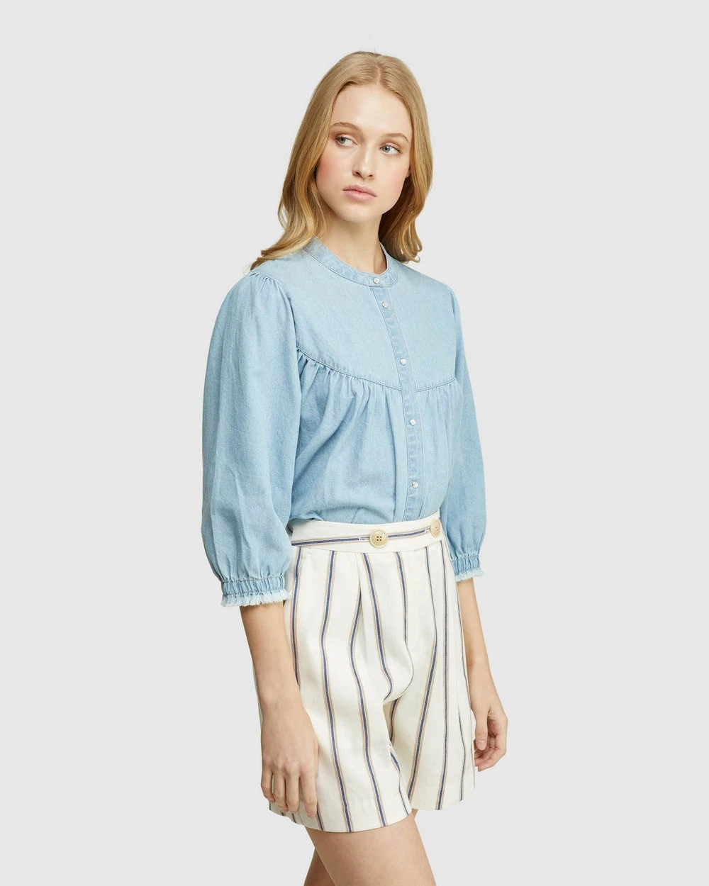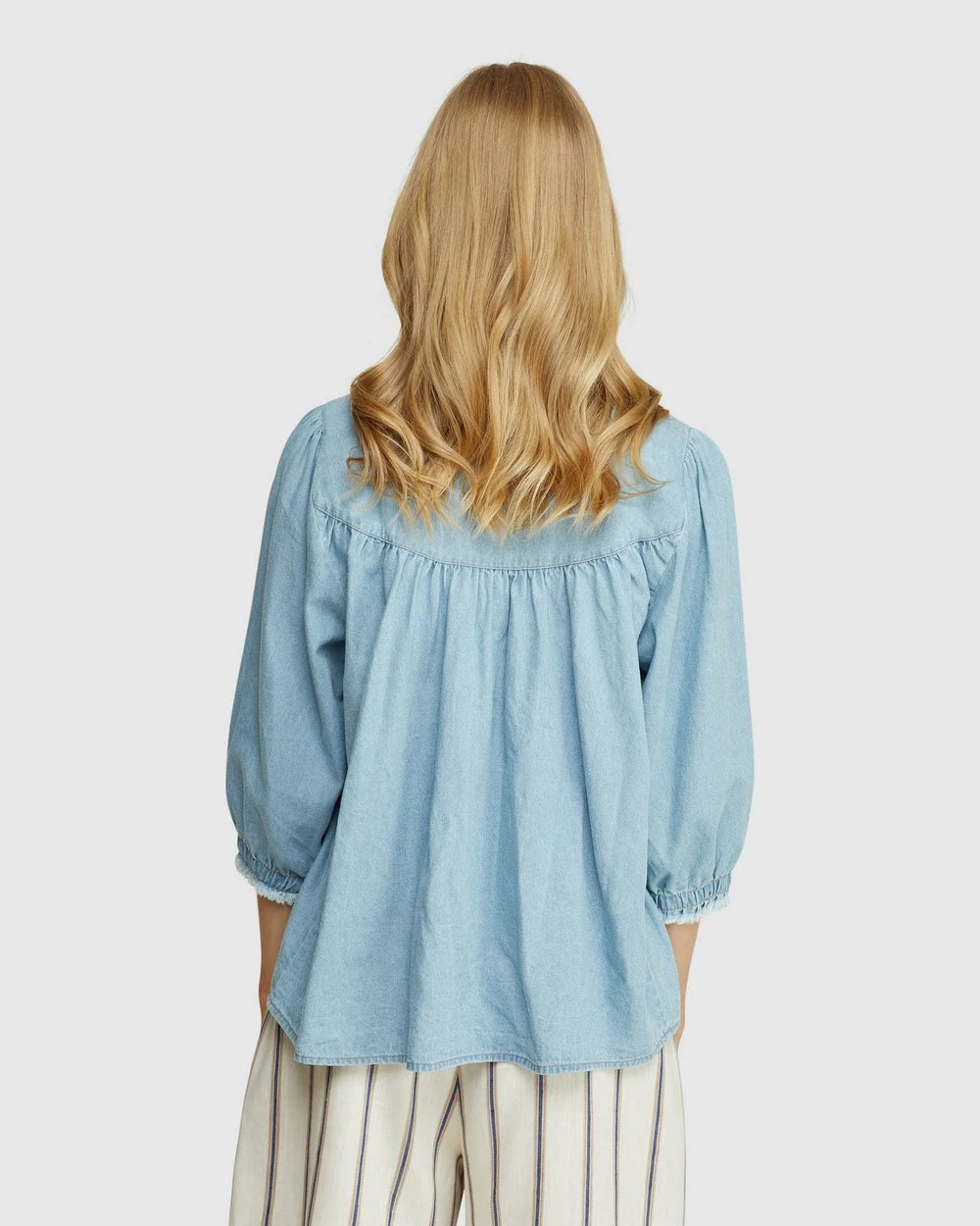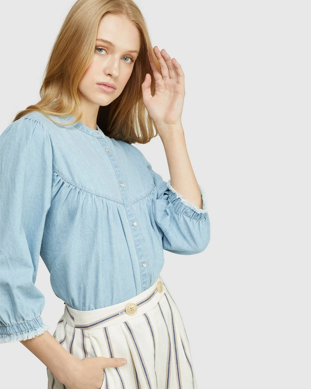 The Megan Chambray Shirt by Oxford is a modern take on a nostalgic style. This elegant prairie shirt is crafted from 100% cotton and cut in a relaxed fit. It features a round neckline, button front and mid-length sleeves with wide frilled cuffs.