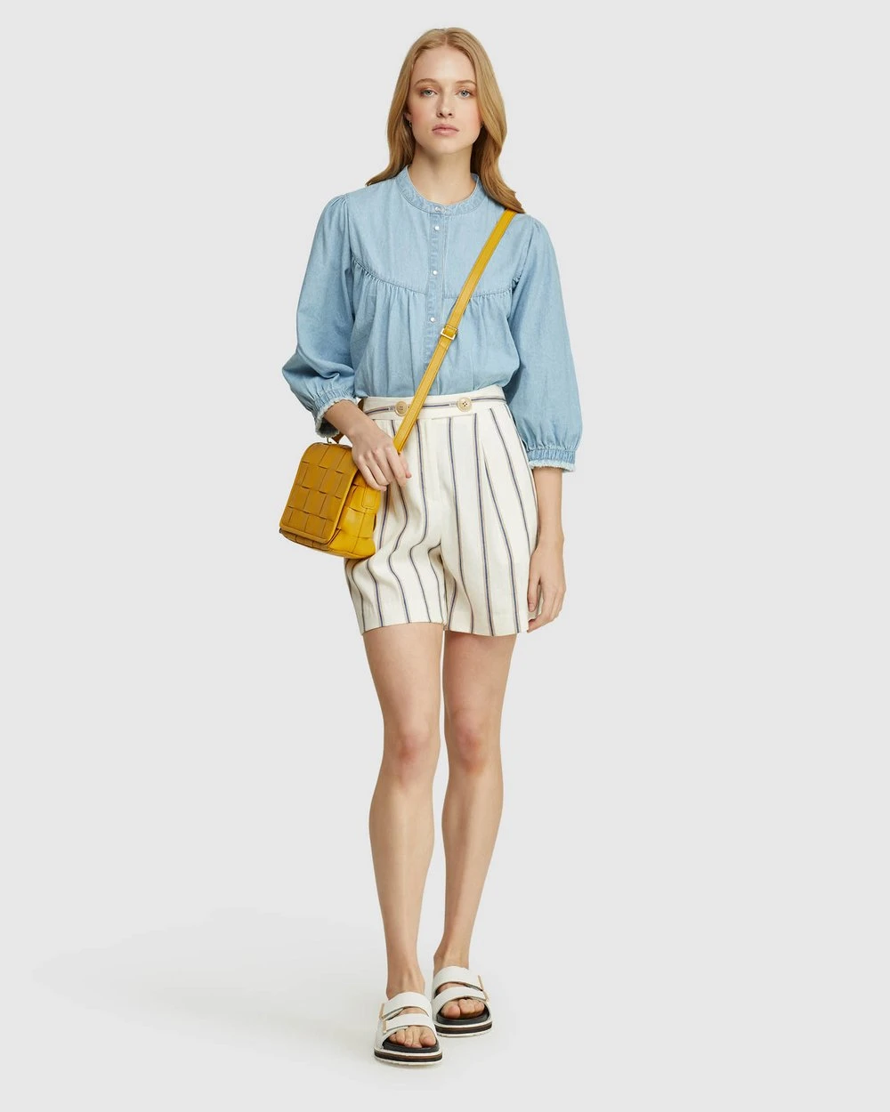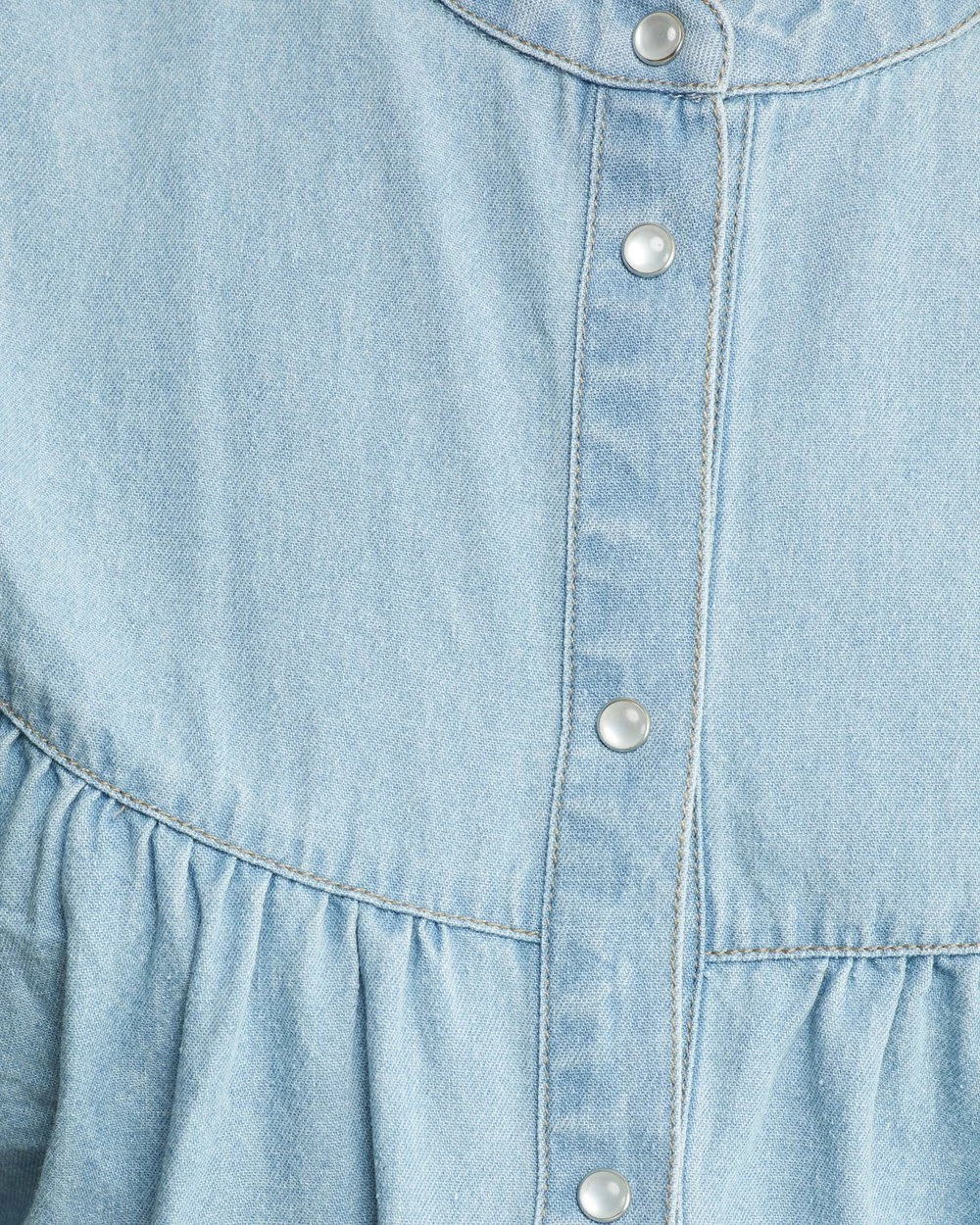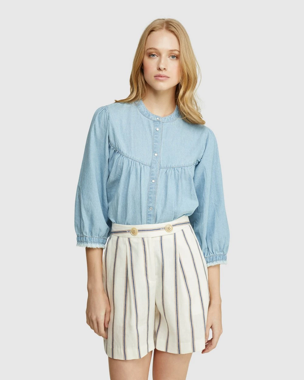 The Megan Chambray Shirt by Oxford is a modern take on a nostalgic style. This elegant prairie shirt is crafted from 100% cotton and cut in a relaxed fit. It features a round neckline, button front and mid-length sleeves with wide frilled cuffs.