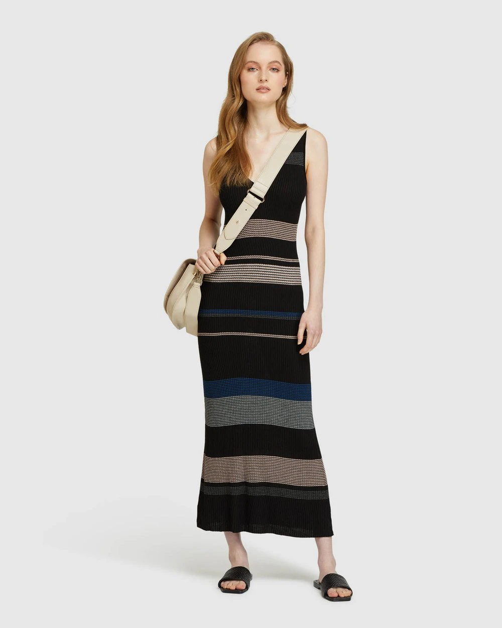 An understated style for your summer events, the Nadia Multi Colour Stripe Knit Dress by Oxford will be your go-to look this season. This light and breezy knit dress is cut in a close fit and features a cool-toned stripe pattern with a deep v-neckline.