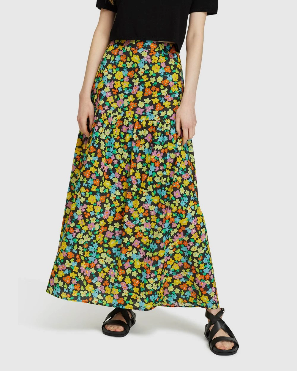Floral and fun, the Olivia Black Ditsy Floral Maxi Skirt by Oxford will be your go-to look. This long a flowy style is crafted from 100% cotton in a vibrant floral print with a fitted waist, invisible back zip and side pockets.
