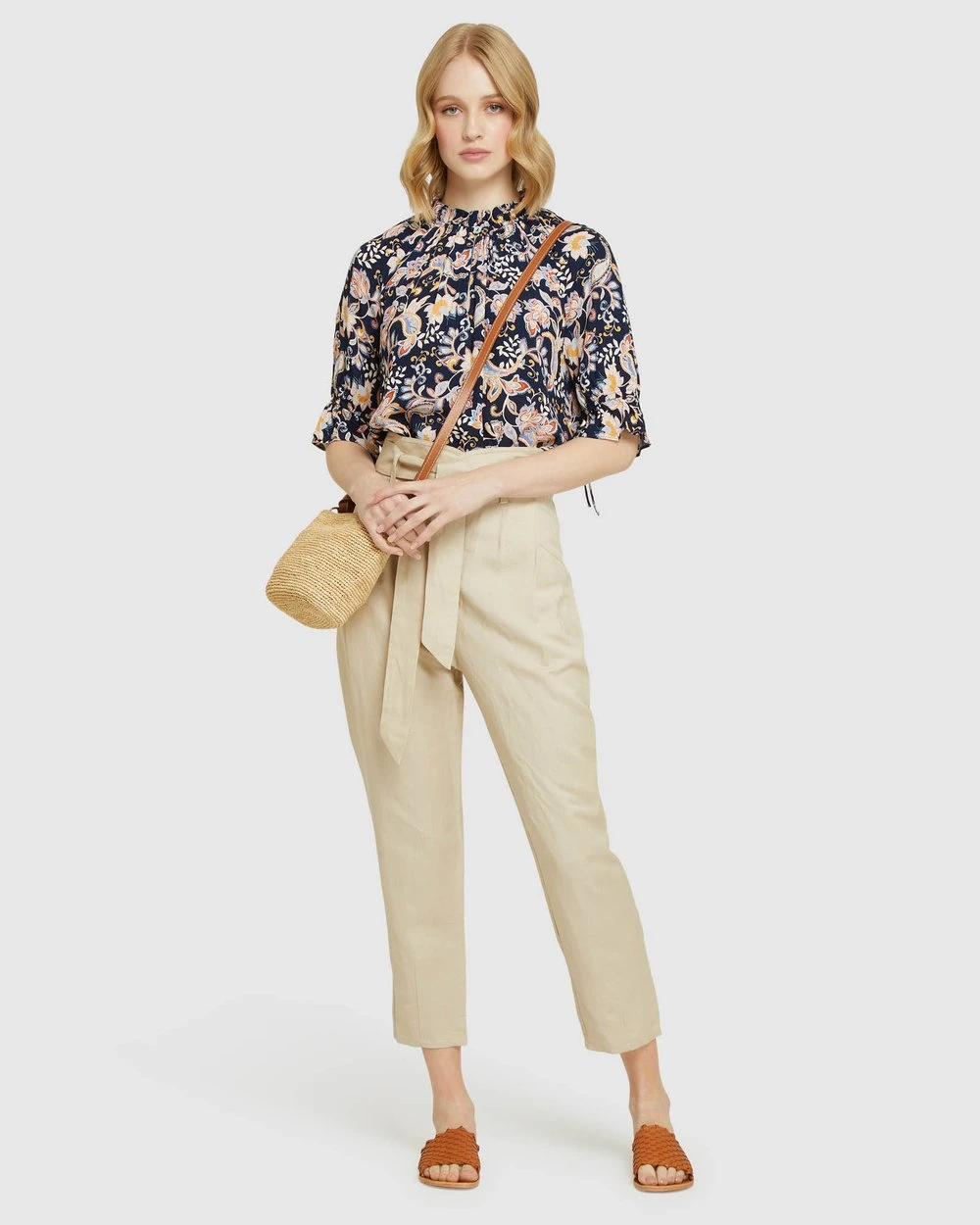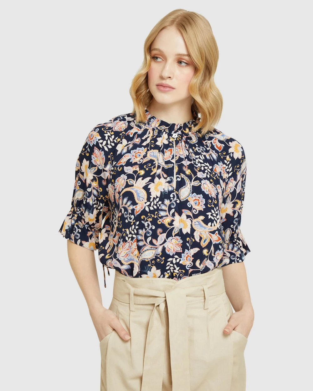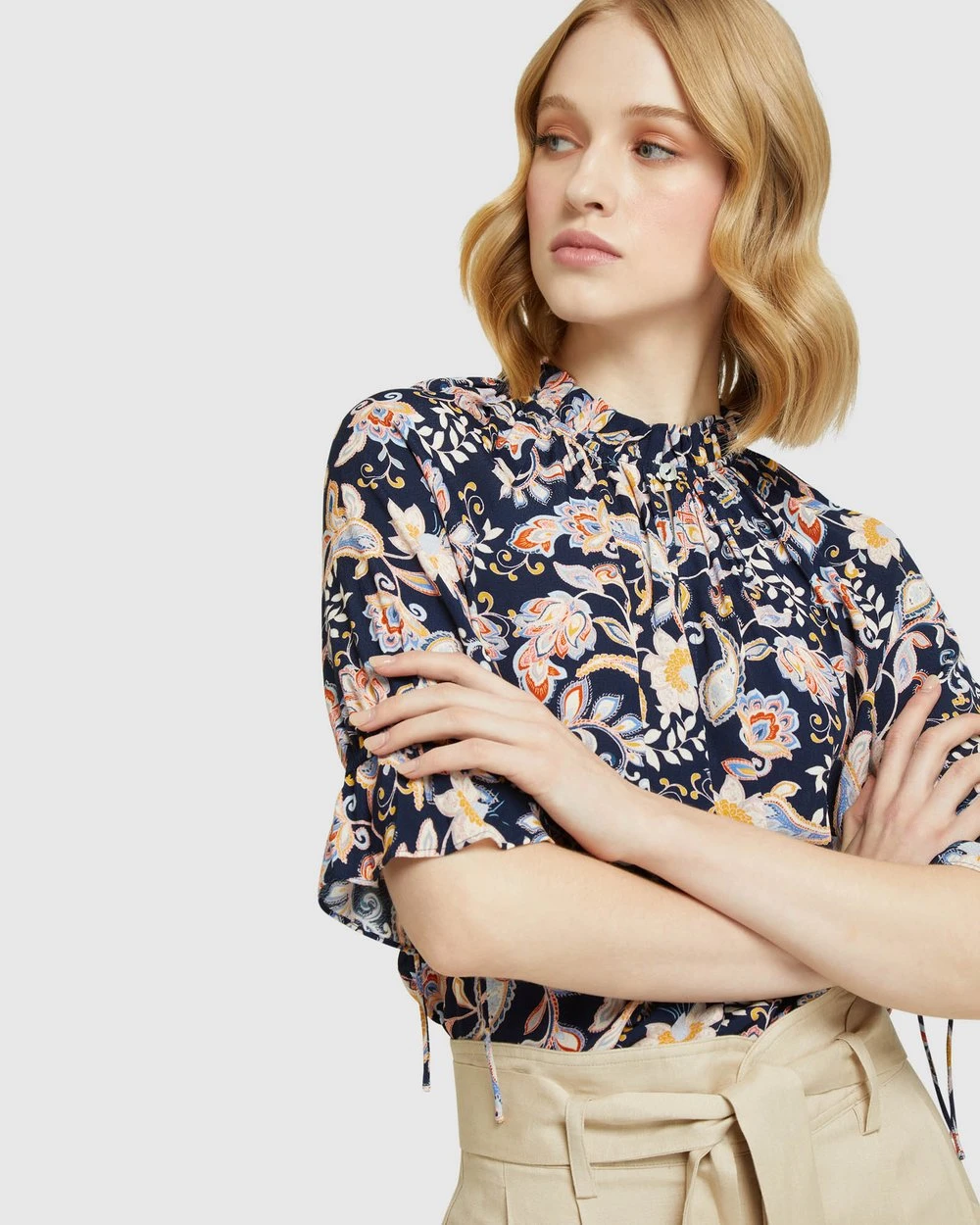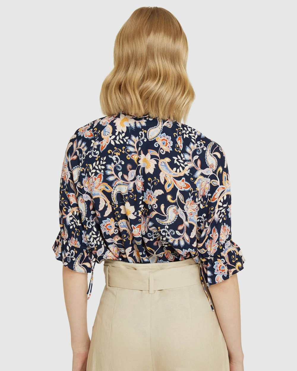 Length: 62cm (Size 8). Our model is wearing a size AU 8 blouse and usually takes a size 8. She is 178cm (5’84”) tall with an 81cm (32″) bust, a 63 cm (25″) waist and 86cm (34″) hips.
