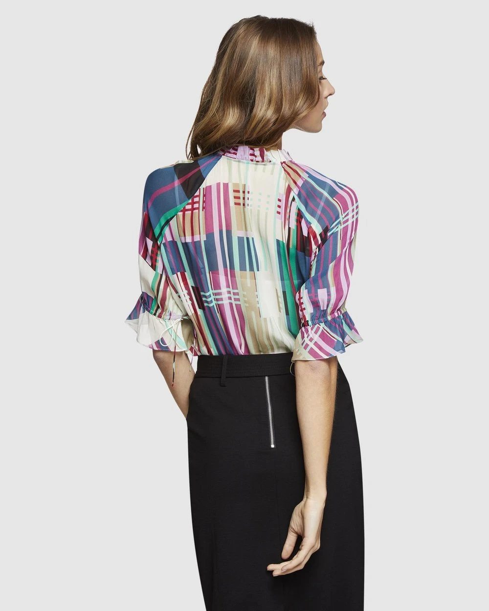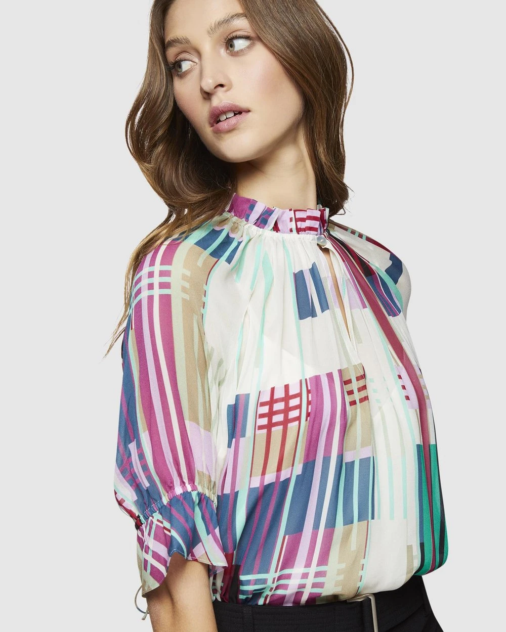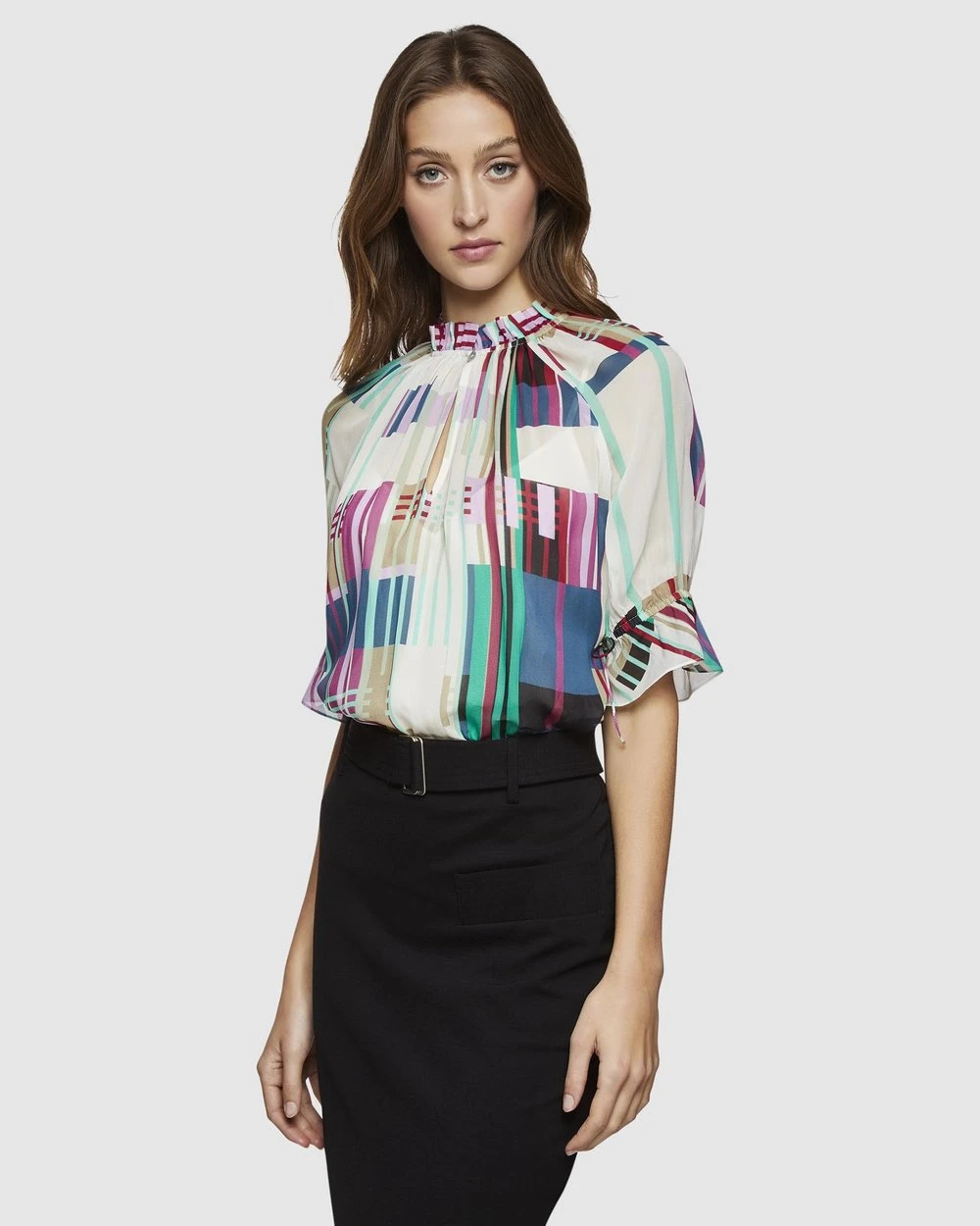 Step out in style in the Oxford Parker Stripe Print Tunic Top. In a striking multi stripe print, this top features feminine touches such as a frill detail on the neckline and sleeves. Other chic details include a mother of pearl button closure on the neckline and tie detail on the sleeves. This top will be the perfect addition to your work to weekend wardrobe.