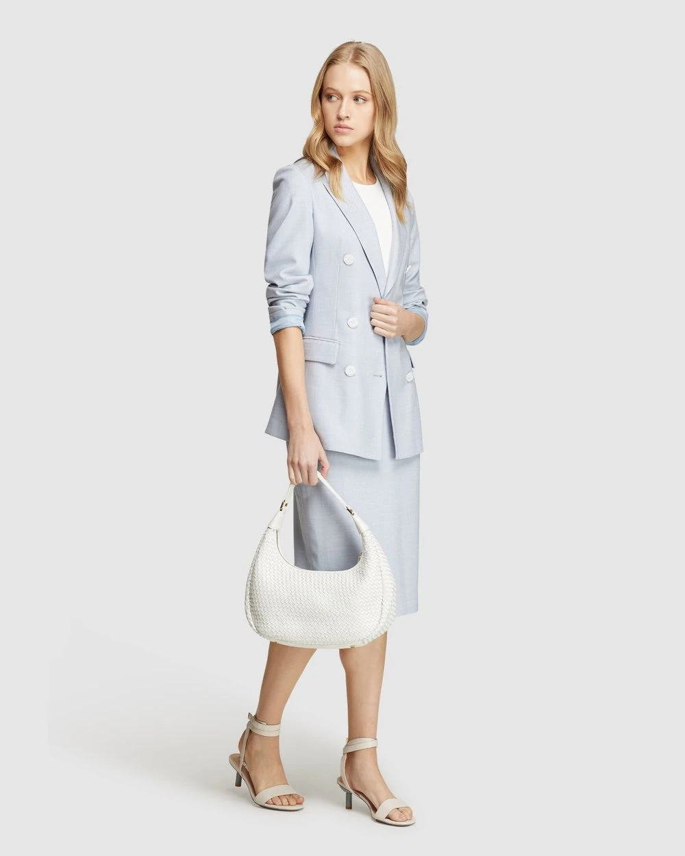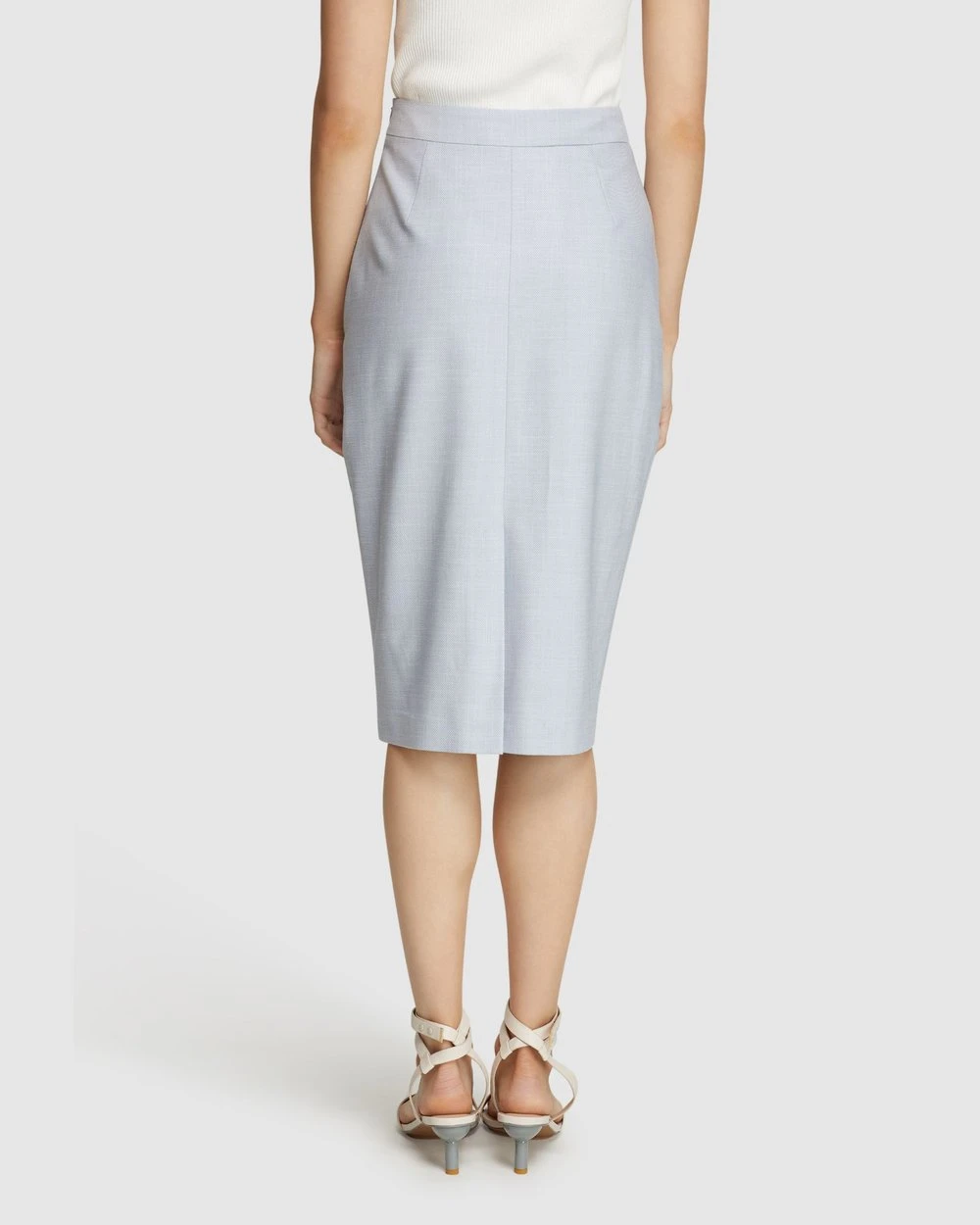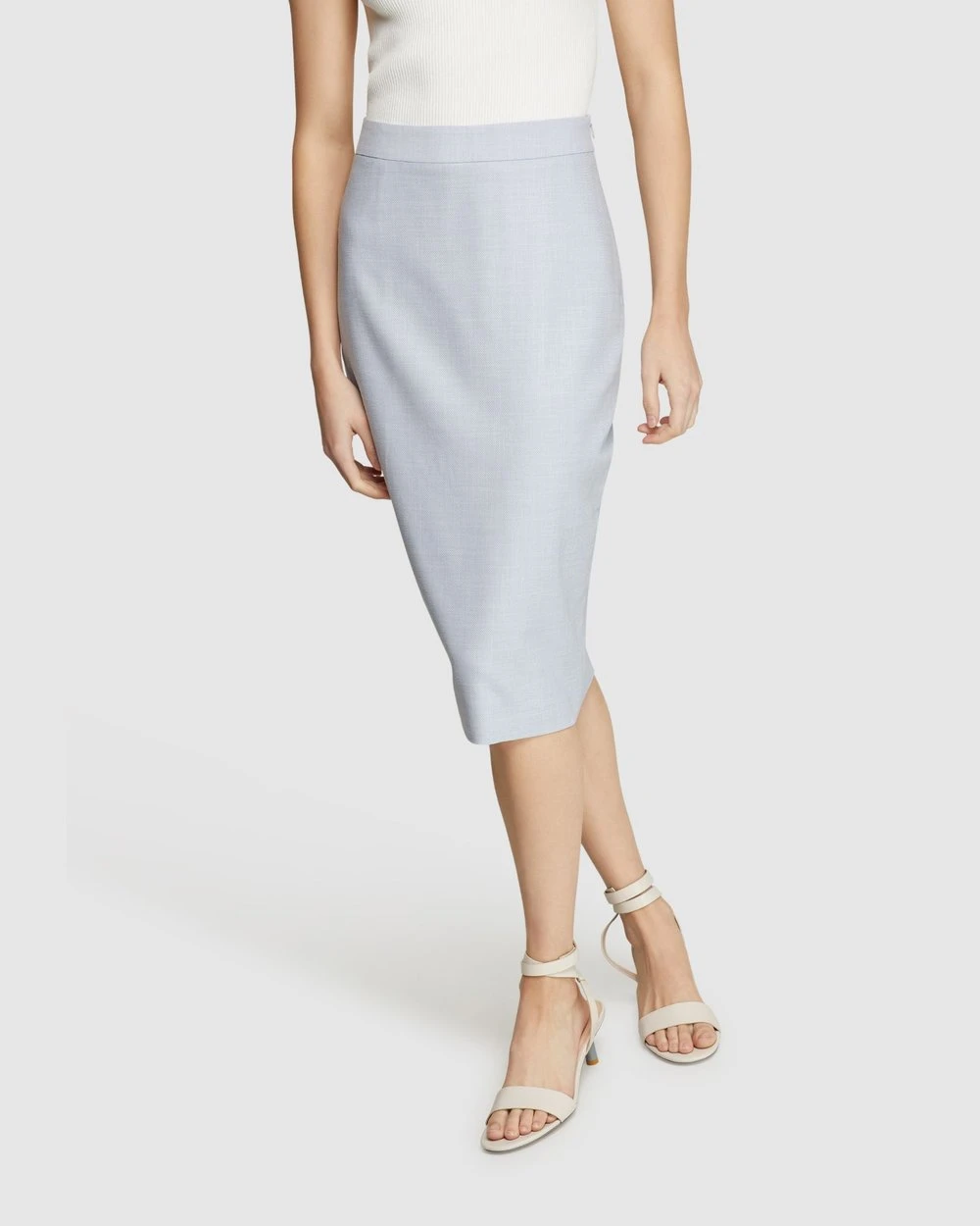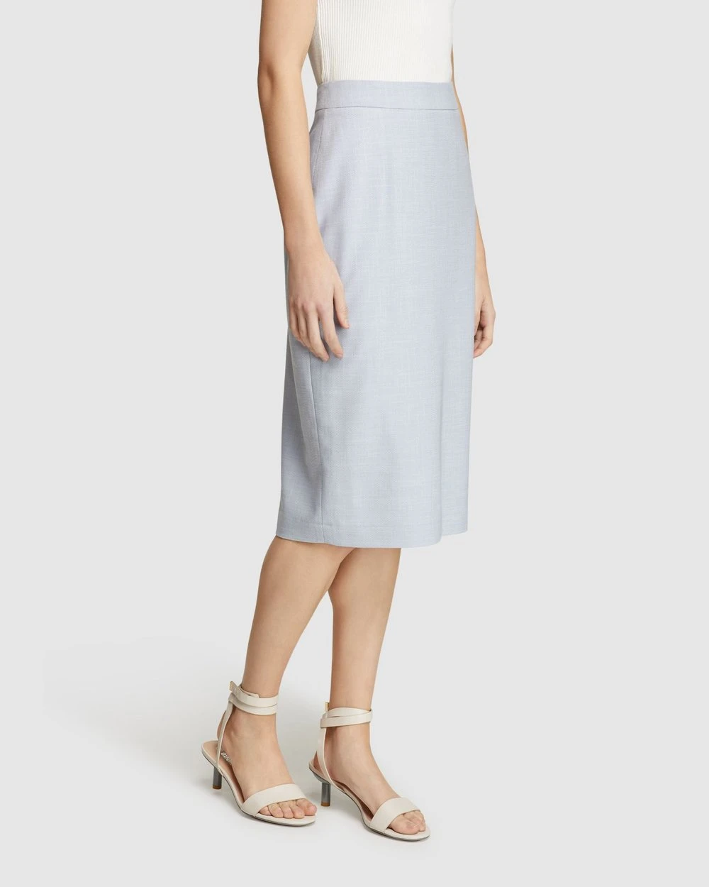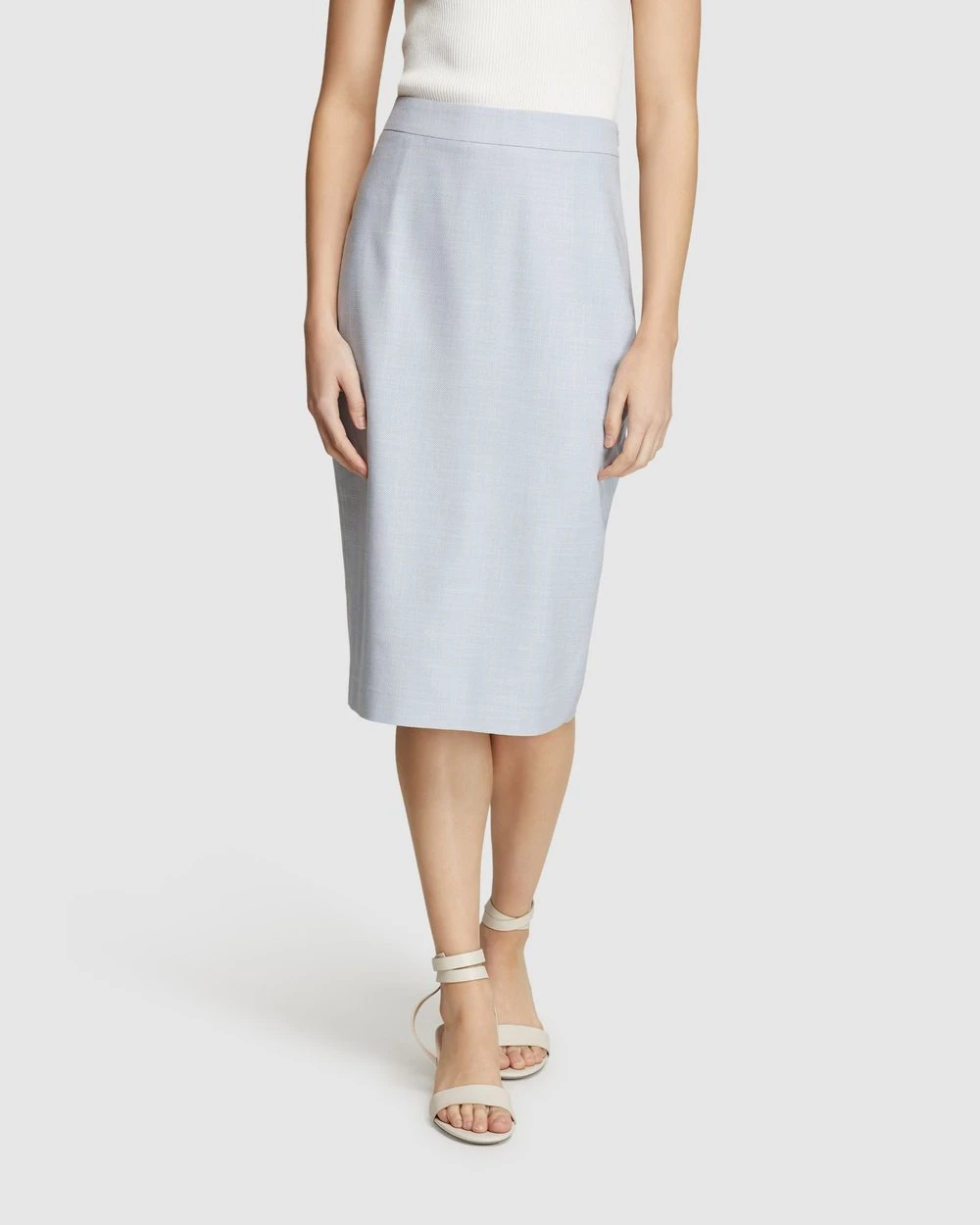 Update your working wardrobe with the Peggy Stretch Eco Suit Skirt by Oxford. This classic pencil skirt is crafted from eco recycled polyester with a hint of stretch and is cut in a slim fit. It sits high on the waist and features an enclosed side zip.