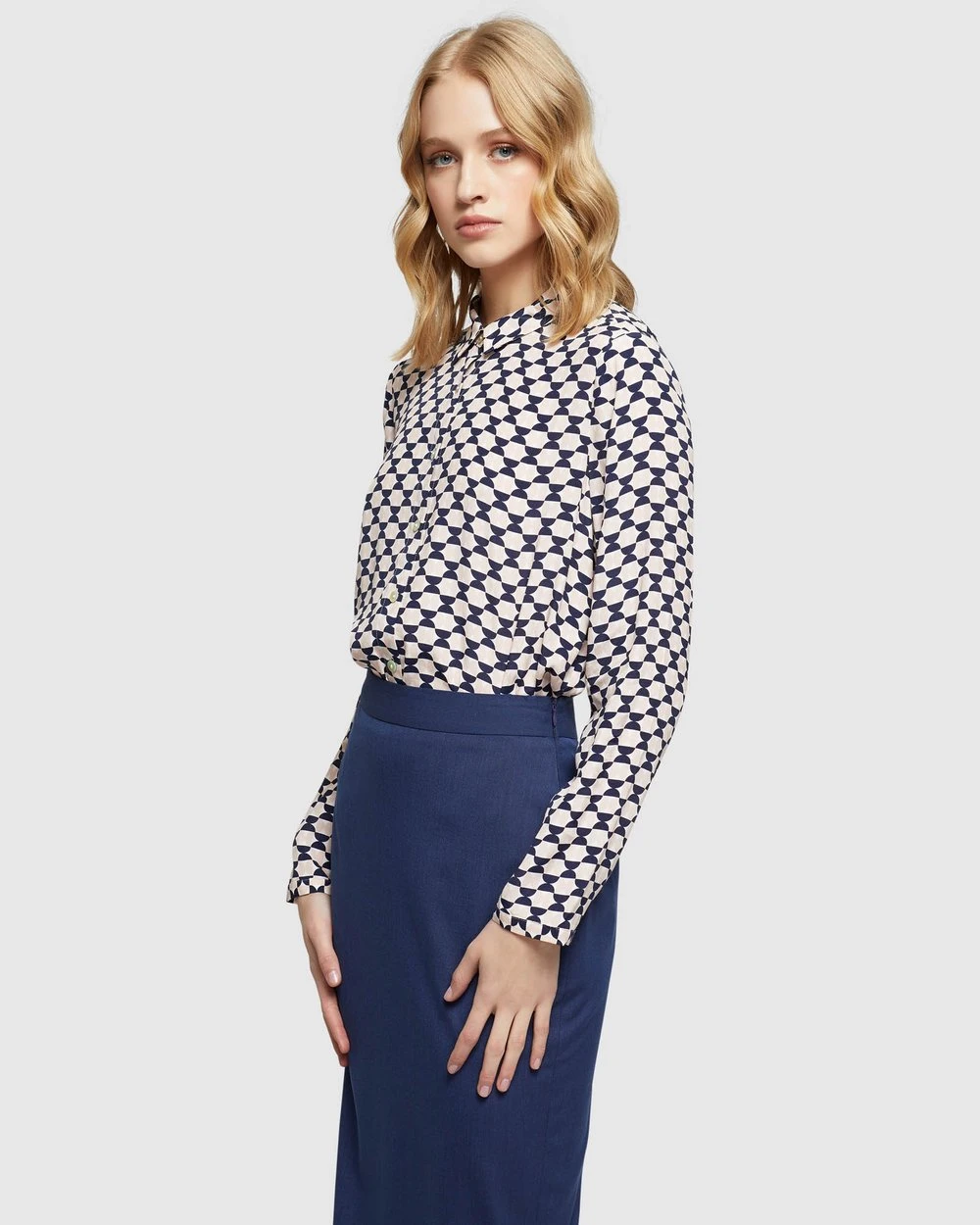 Our model is wearing a size AU 8 blouse and usually takes a size 8. She is 178 cm (5’84”) tall with an 81cm (32″) bust, a 63 cm (25″) waist and 86cm (34″) hips.
