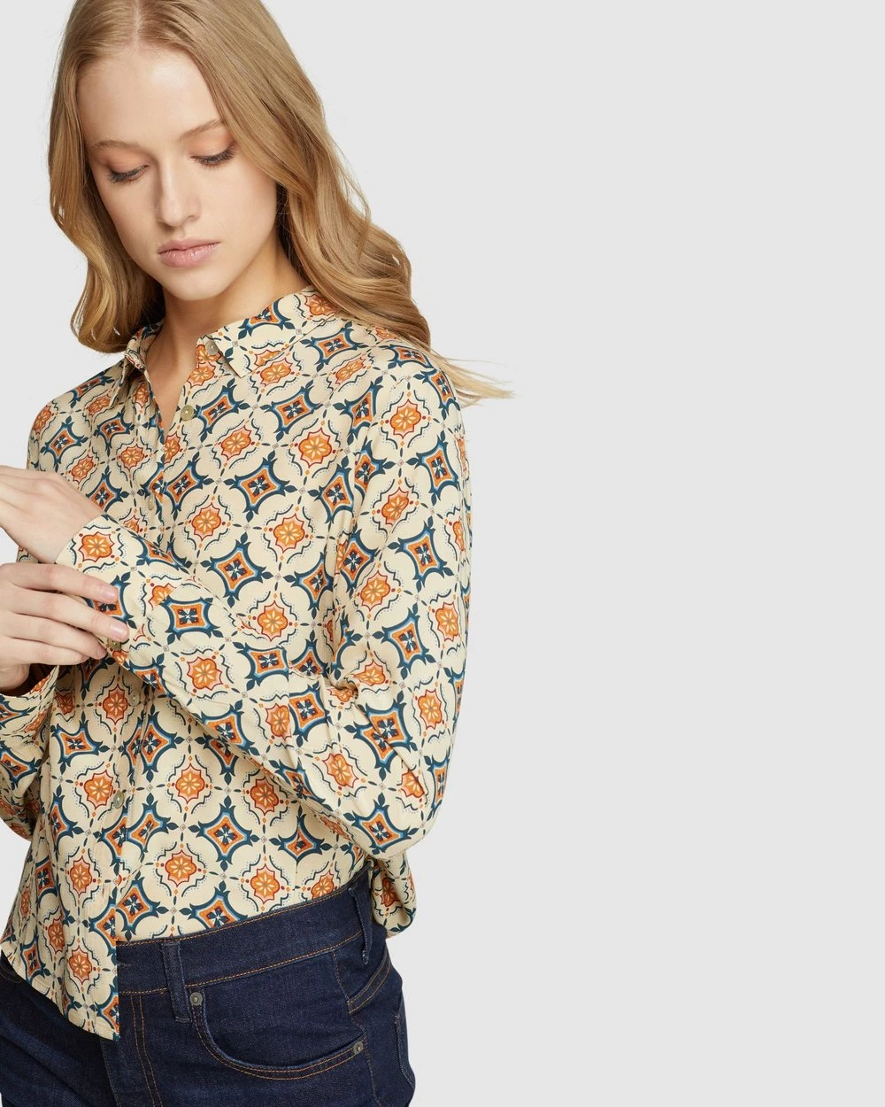 For a modern look with a vintage feel add the Poppy Printed Blouse by Oxford to your collection. This elegant blouse is cut in a relaxed fit and features a striking geometric print that is exclusive to Oxford.
