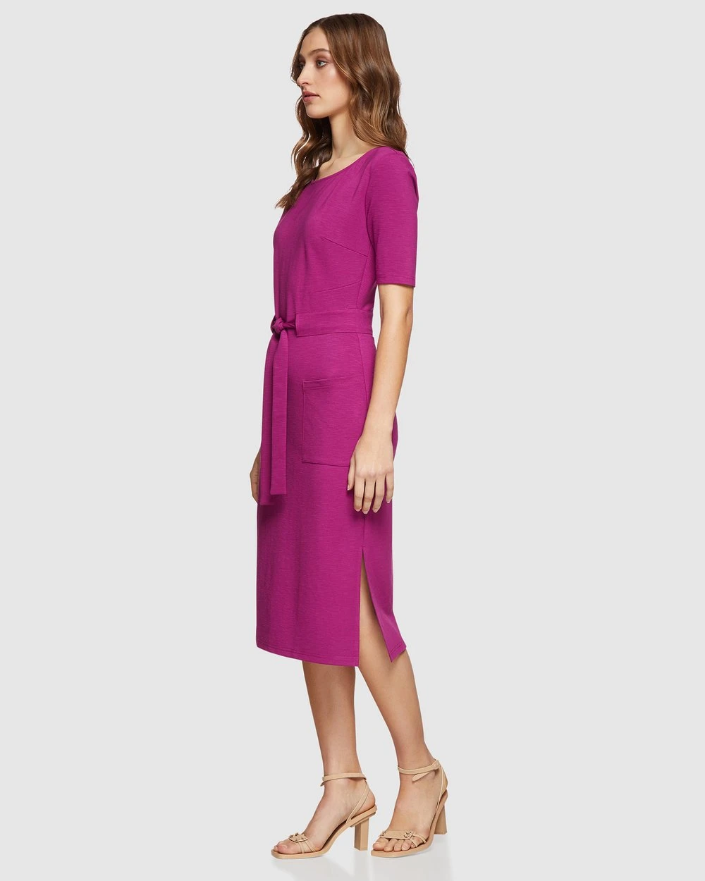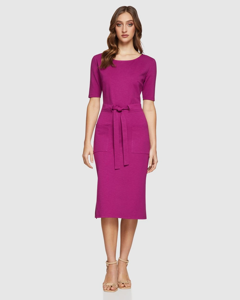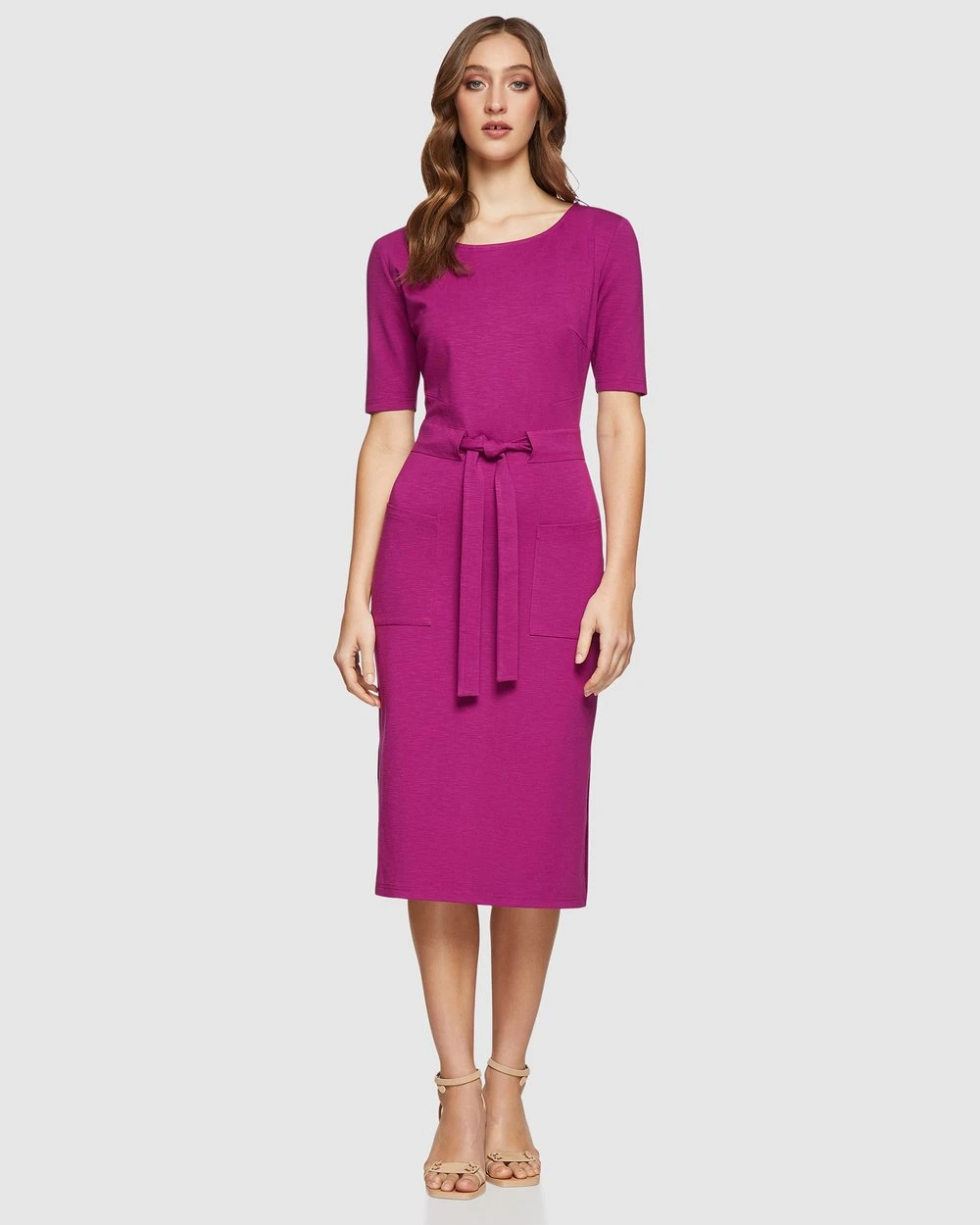 For style that is effortless and chic, look to the Oxford Reaba Ponti Dress. Constructed from ponti fabrication, this super flattering dress features a pencil style skirt, short sleeves, round neckline and belted waist. For a super chic look at the office, simply style it with heels.