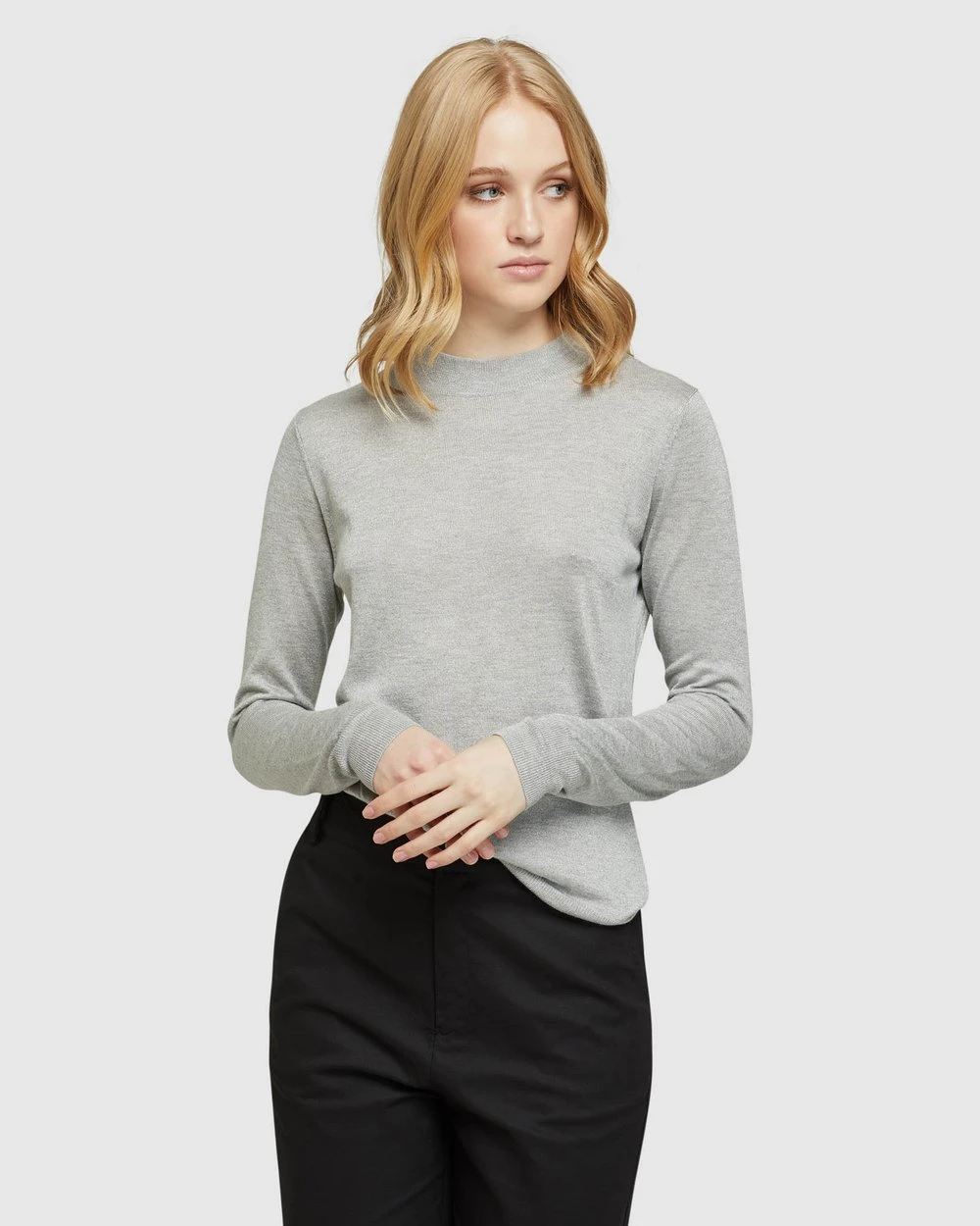 Sparkle from day to night in the Remy Metallic Knit by Oxford. This elegant basic is woven with shiny metallic yarn and cut in a slim fit. It features a sleek mid neckline and ribbed trims.