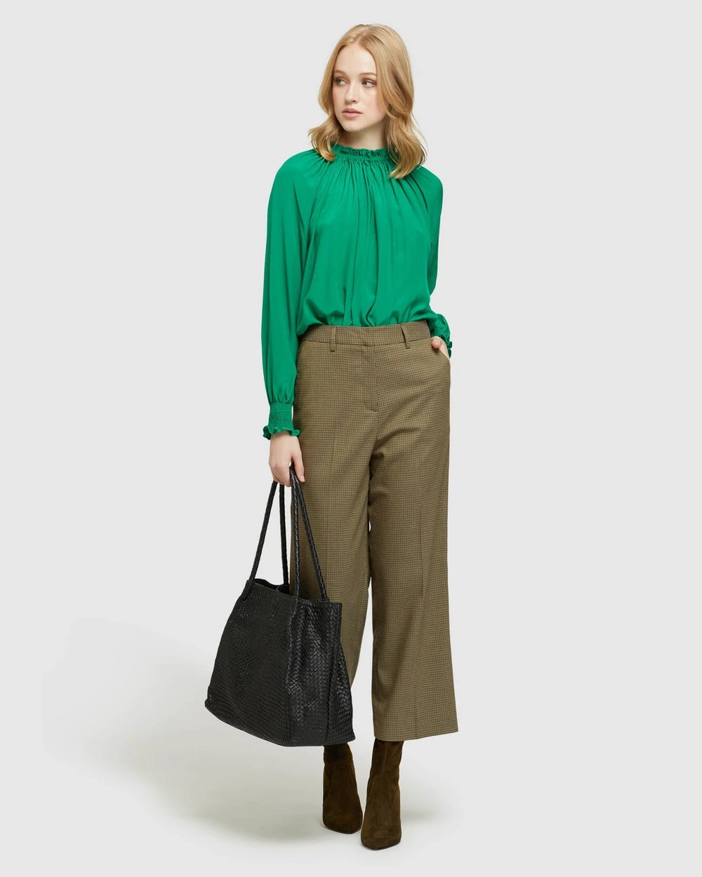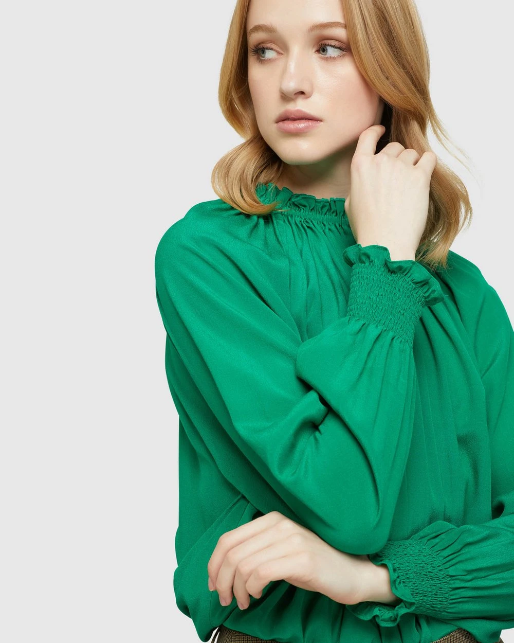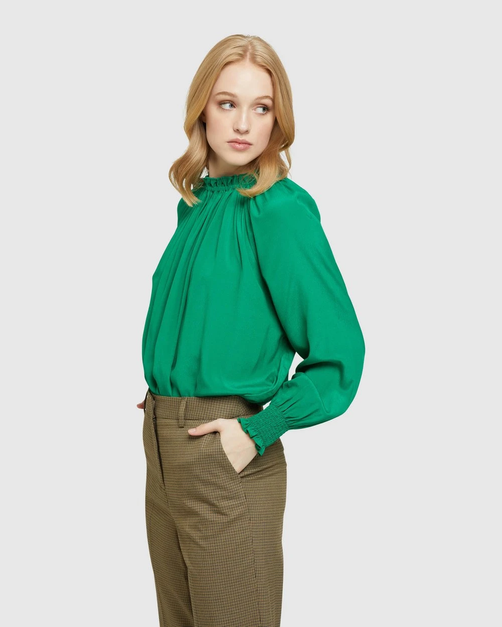 For a graceful and elegant look add the Sabine Top by Oxford to your collection. This timeless style gently drapes from a high frilled neckline and has frilled cuff detail for a refined and glamorous feel.