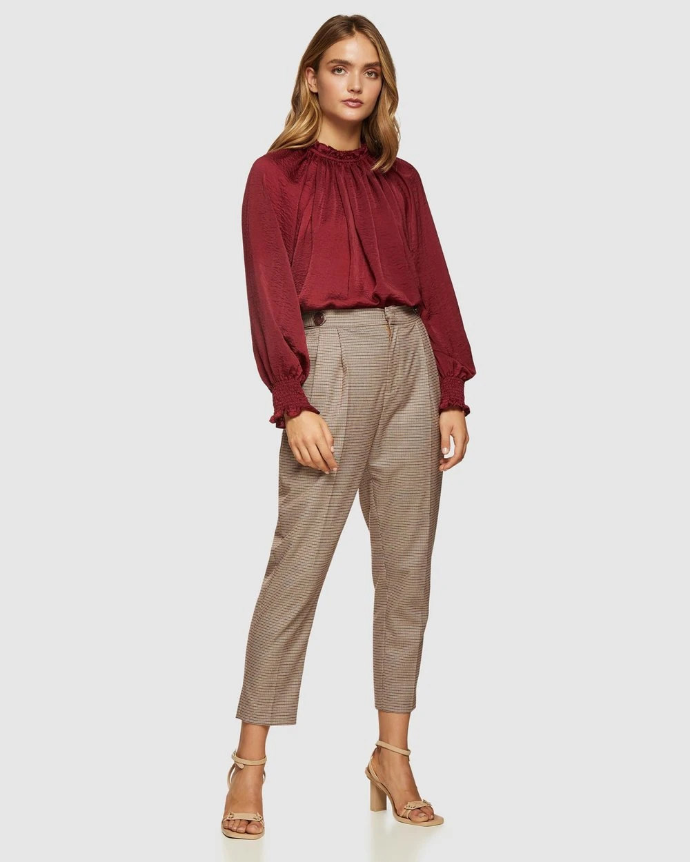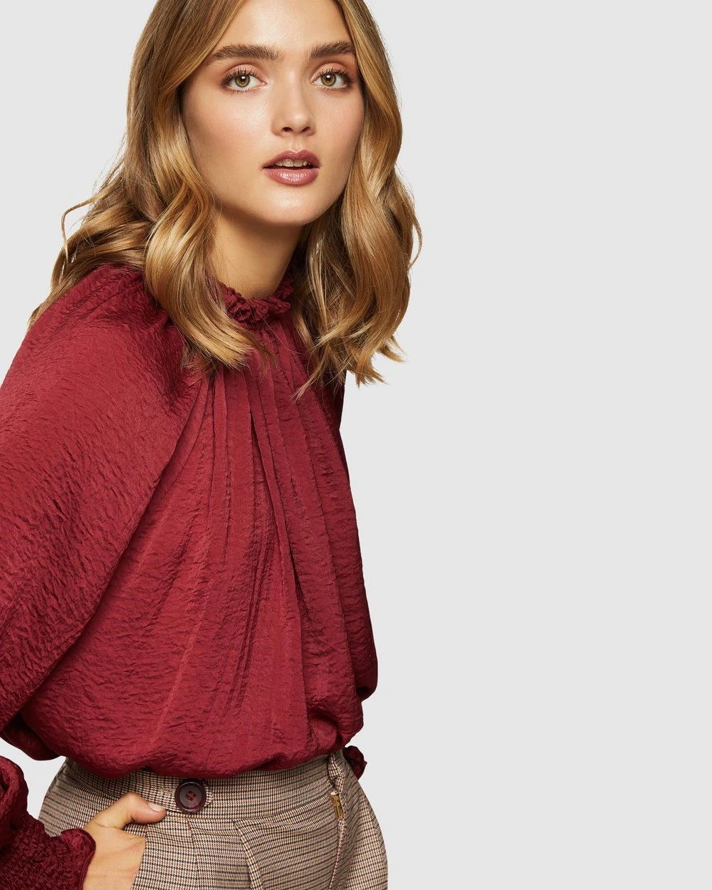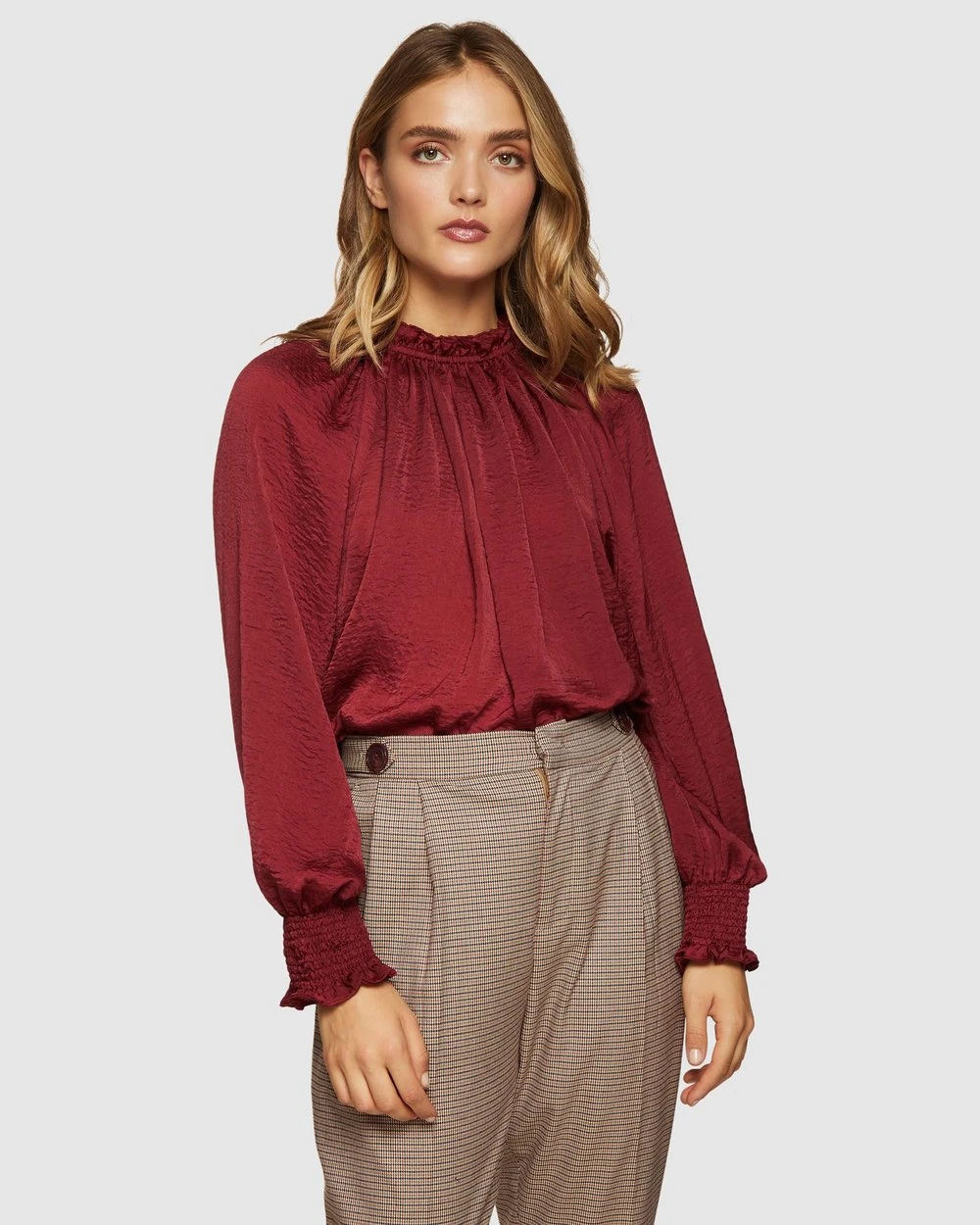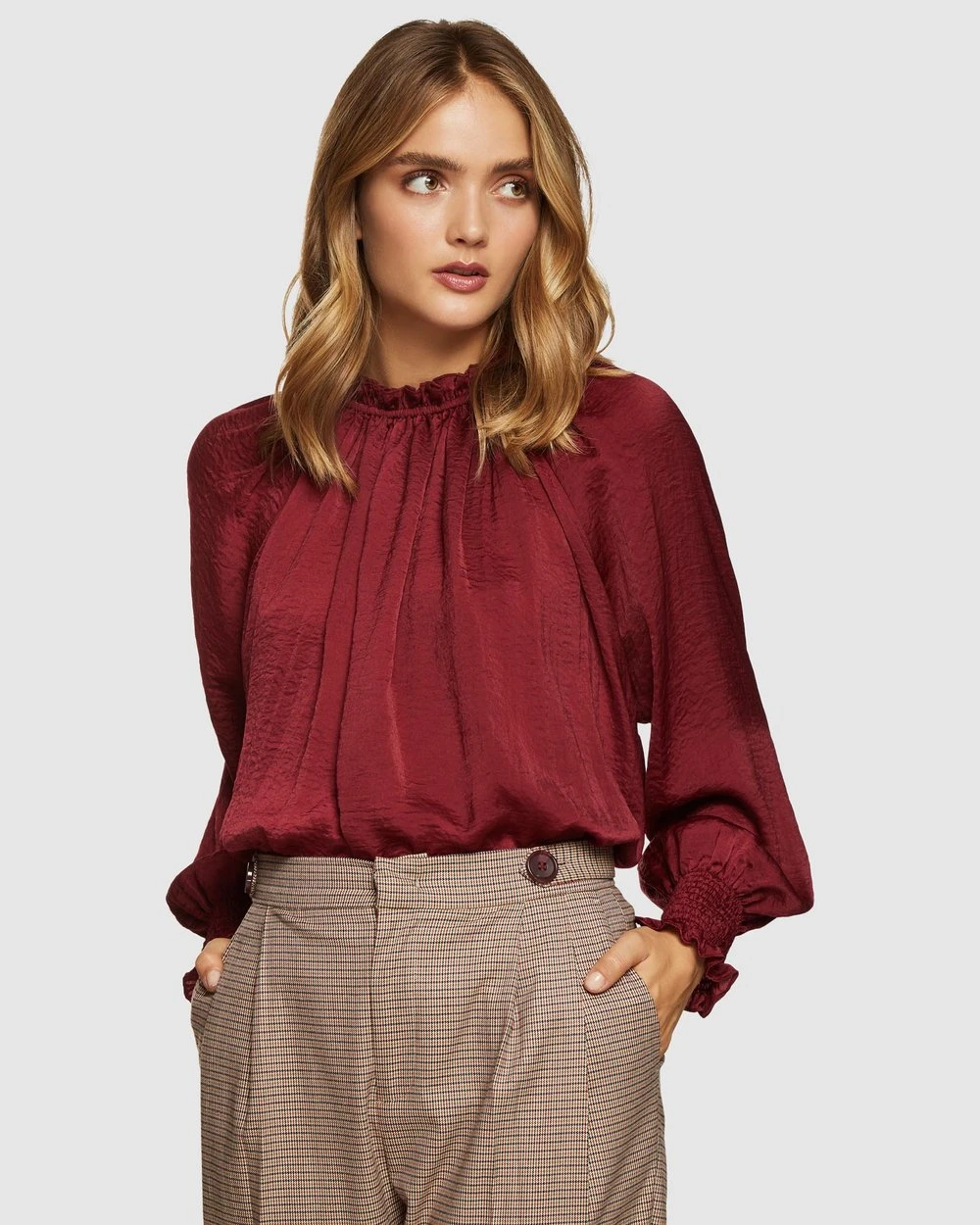 For a timeless and refined look, add the Oxford Sabine Top to your office attire. Crafted from lightweight and textured fabric, its frilled sleeves, high neckline and large puff sleeves exude classic style. Pair yours with checked suit trousers and heels for a sophisticated and modern look.