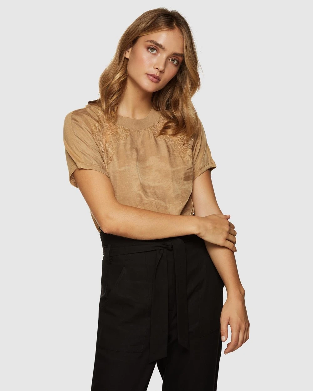 Go from work to the weekend in the chic style of the Oxford Sandra Lace Trim T-Shirt. A relaxed fit, this top features gorgeous lace trim detailing through the front and back. Style yours with high-waisted pants and heels for an elegant look at the office.