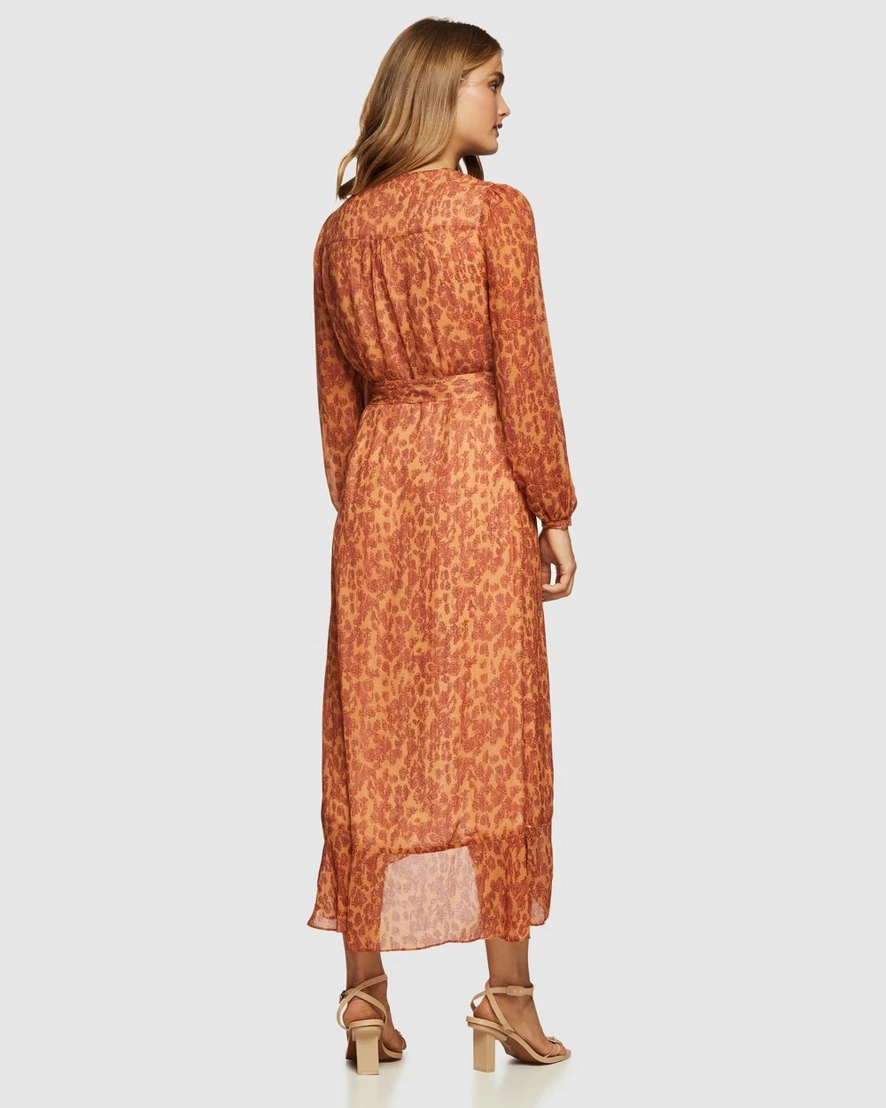 Our model is wearing a size AU 8 dress and usually takes a size 8. She is 175 cm (5’9″) tall with an 82cm (32.5″) bust, a 64 cm (25″) waist and 91cm (36″) hips.