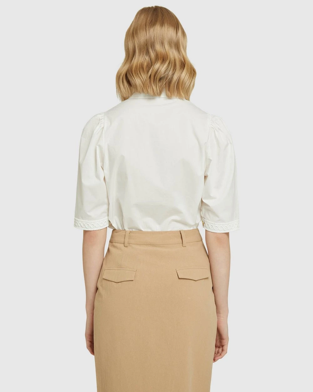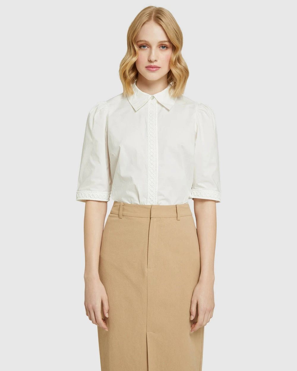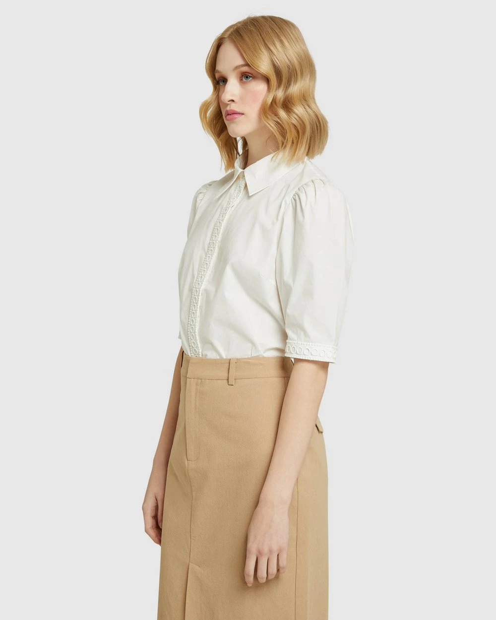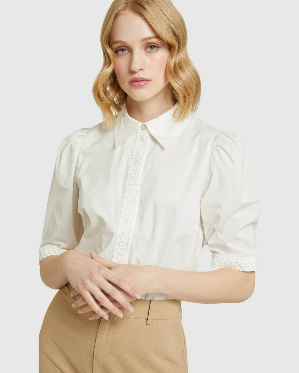 – Placket and cuff detail, puffy sleeves