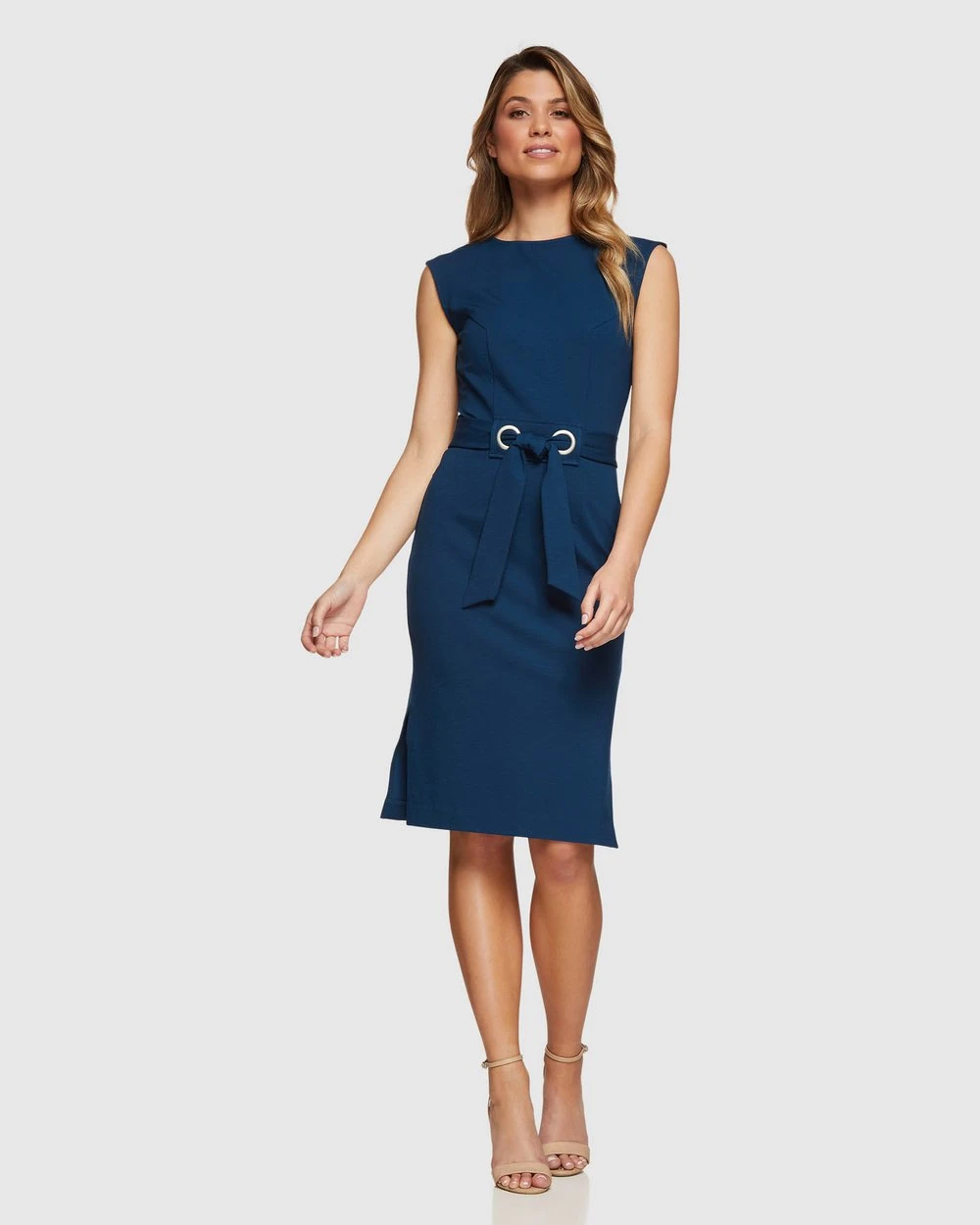 The comfortable and stylish Tatina Ponti Dress is an adaptable and chic addition to your work or weekend style. Made from ponti fabrication in a petrol hue, it features a belted waist with tie and exposed back zipper. Wear this sleeveless style with heels for an effortless look.