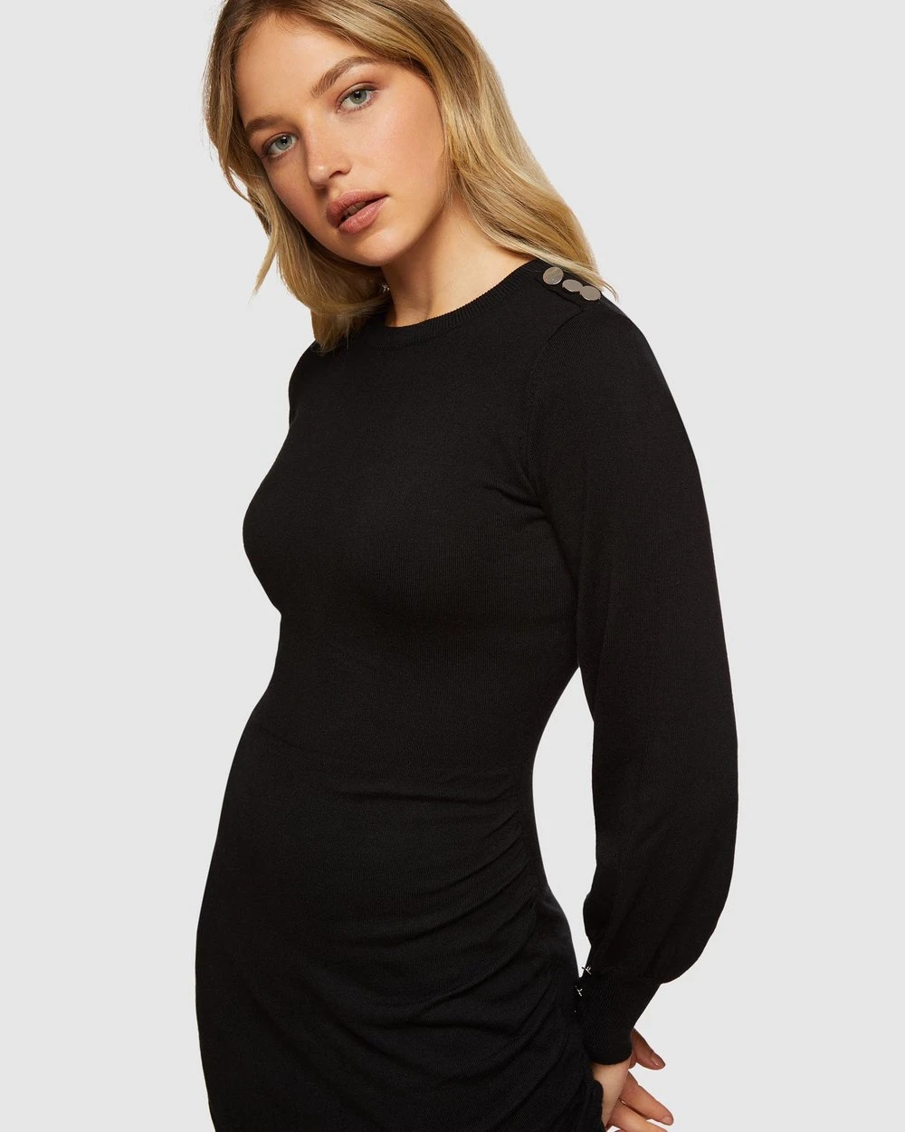 – Long sleeves with bell and button detail